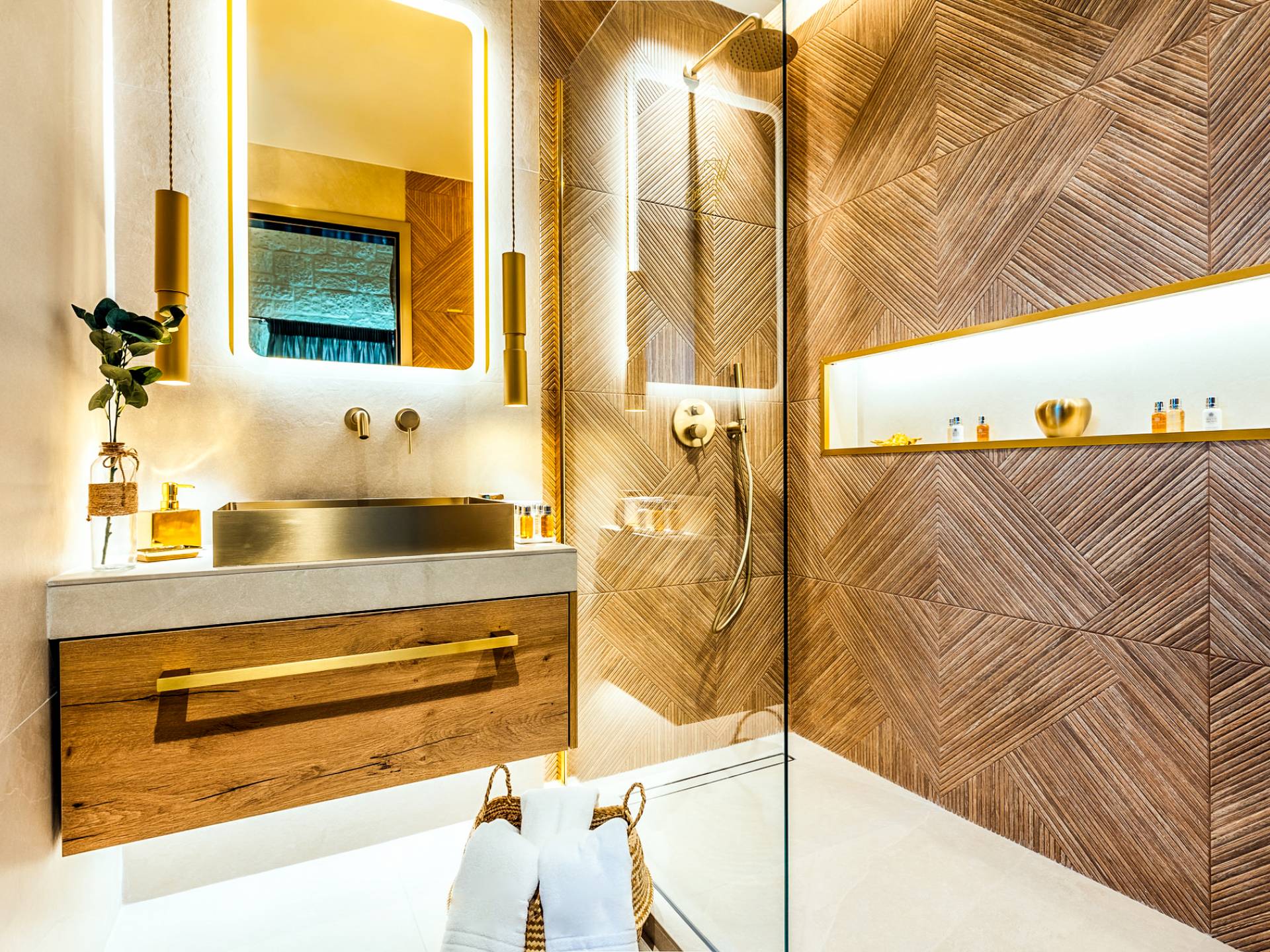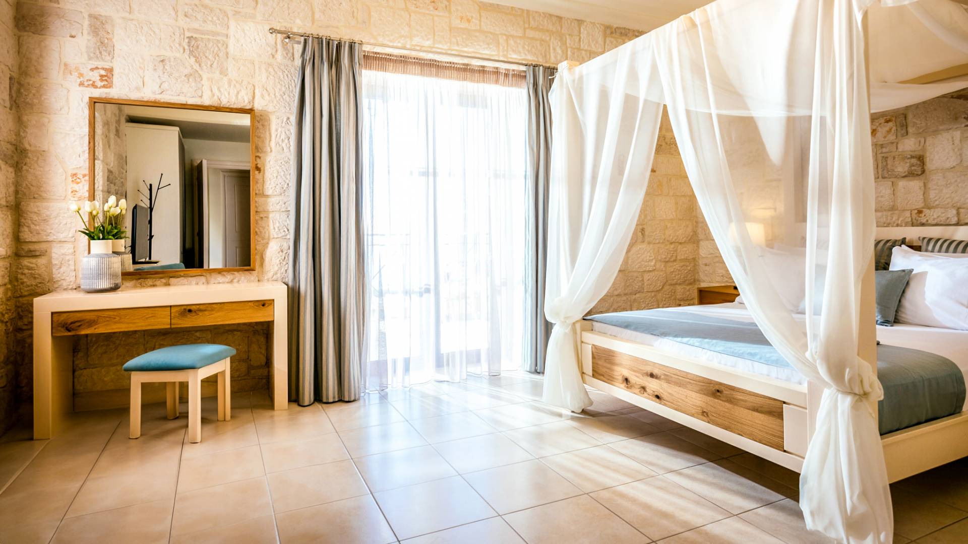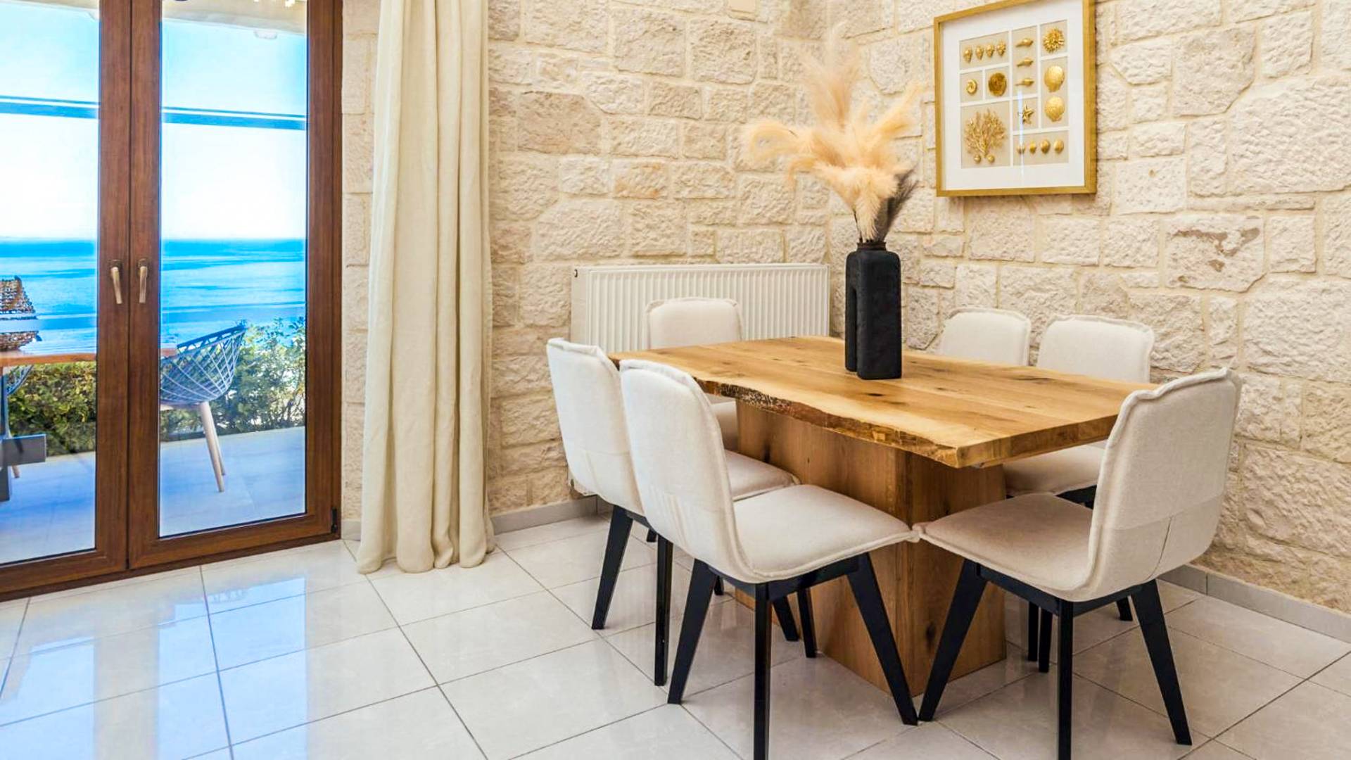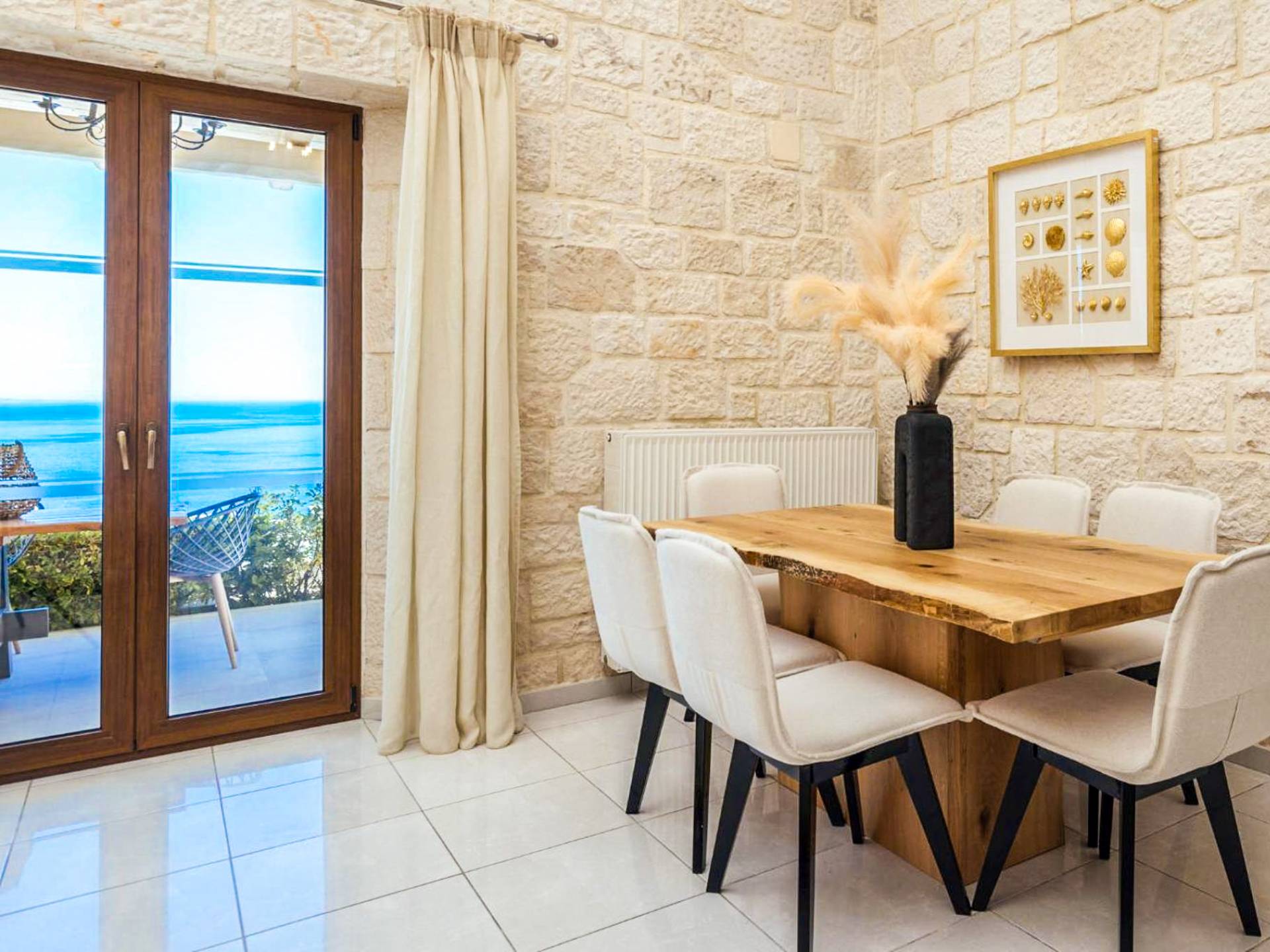 A marble staircase leads you to the first floor that consists of two more bedrooms: one master bedroom (double bed) with an en-suite full bathroom and one twin bedroom with an en-suite shower room.