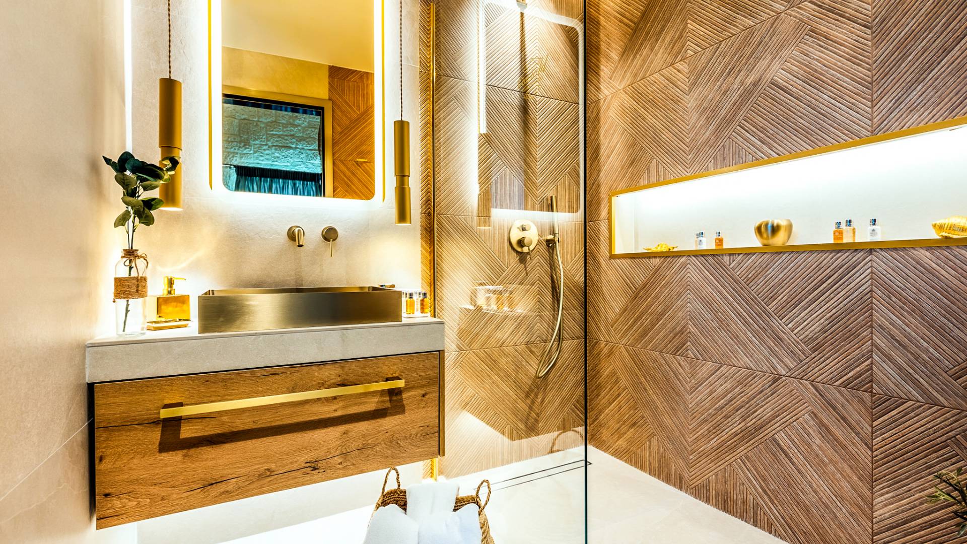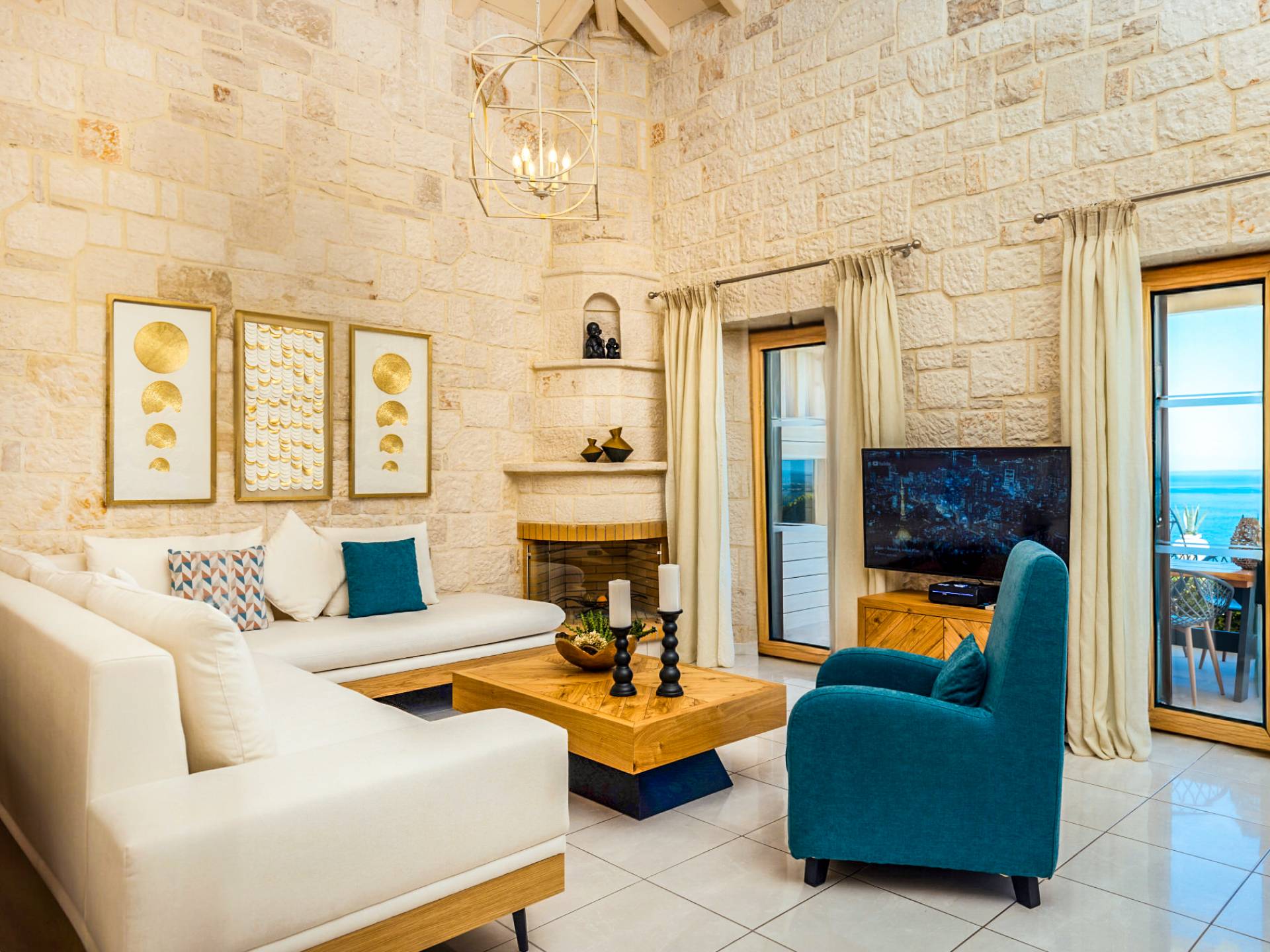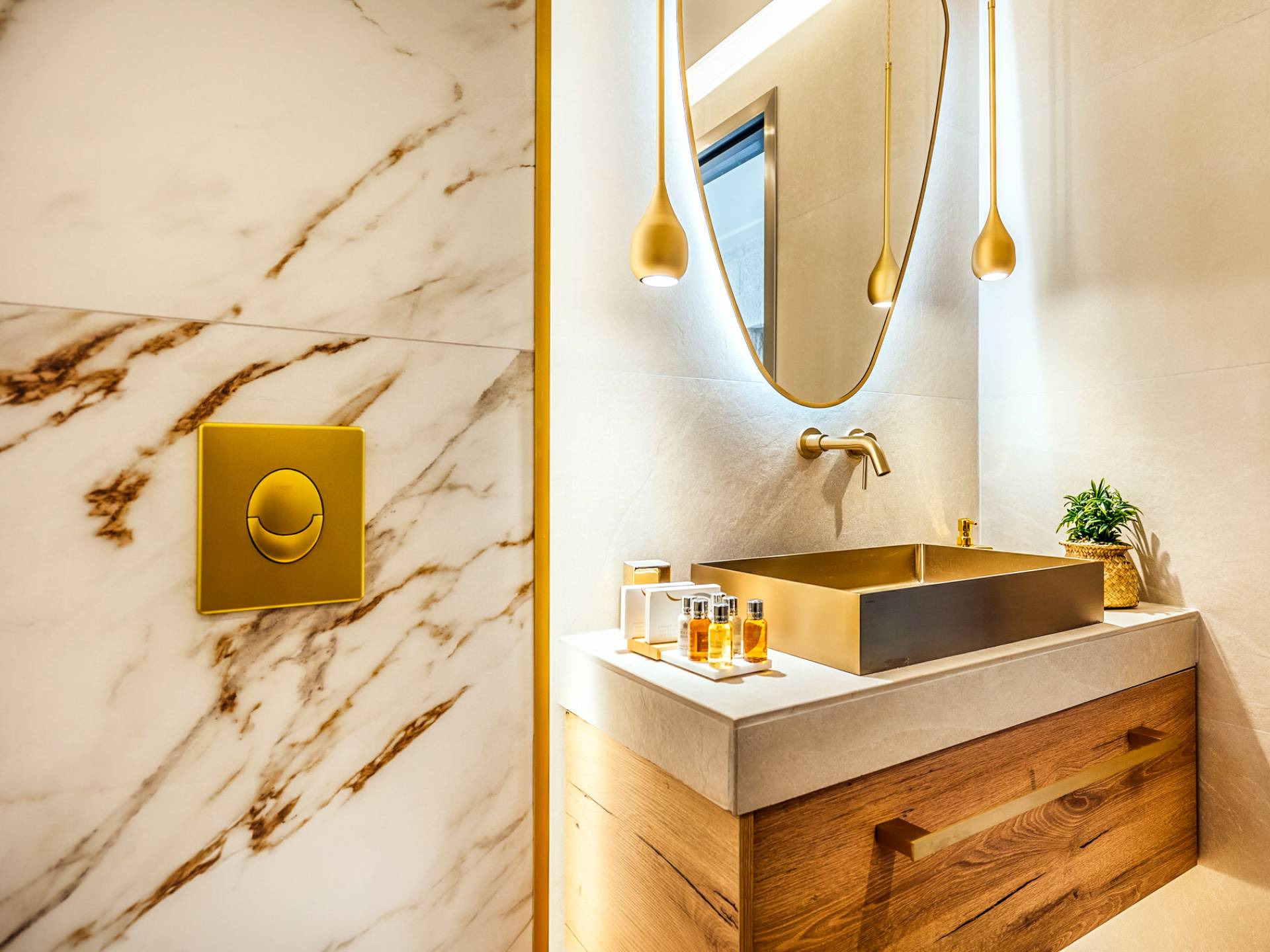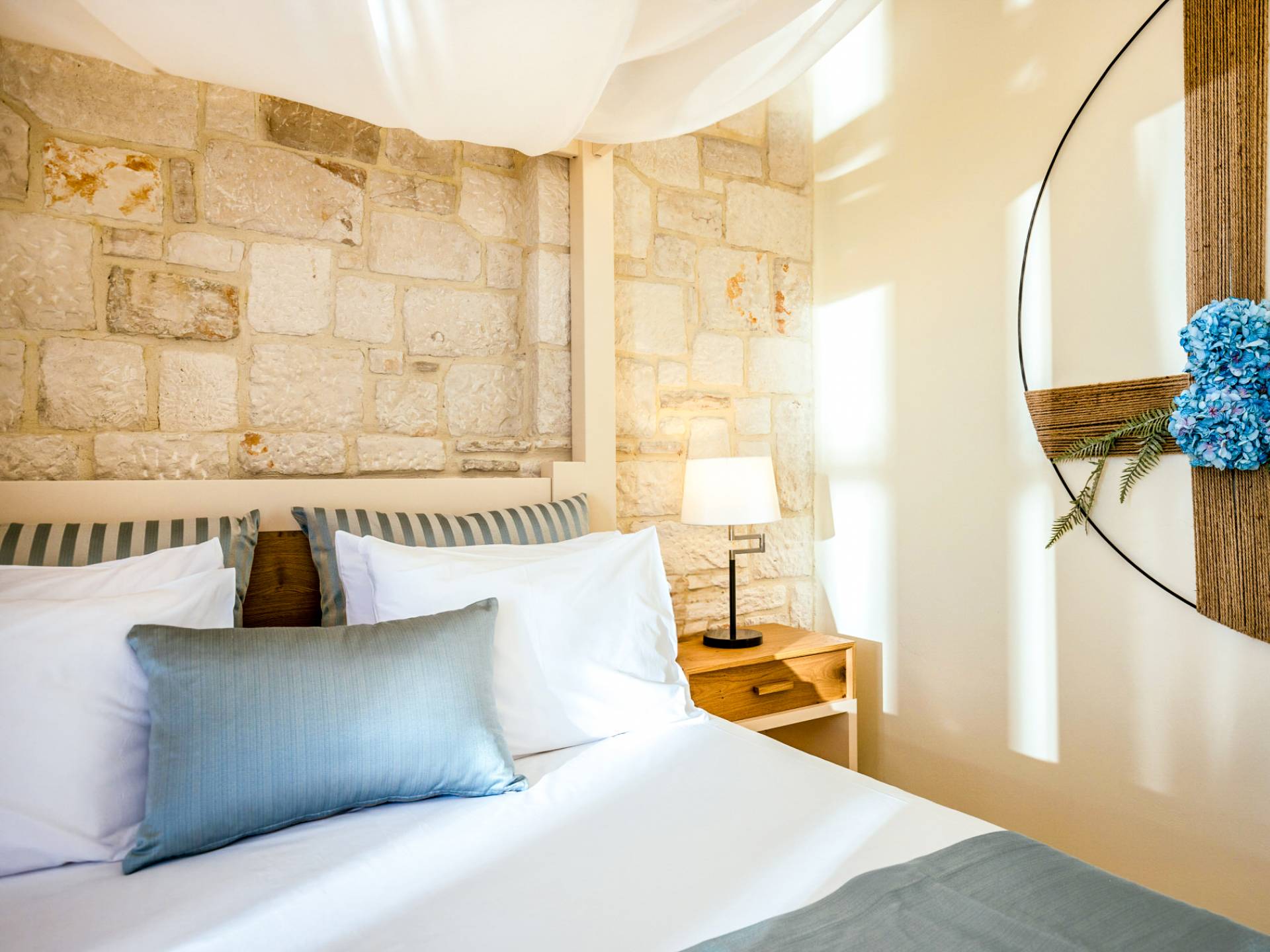 A marble staircase leads you to the first floor that consists of two more bedrooms: one master bedroom (double bed) with an en-suite full bathroom and one twin bedroom with an en-suite shower room.