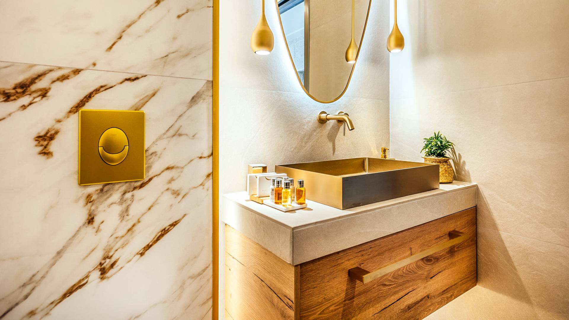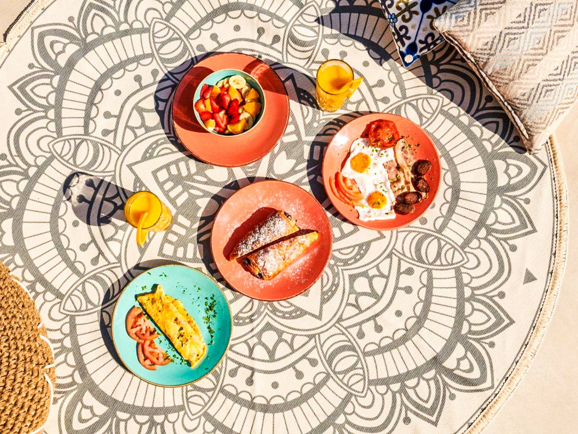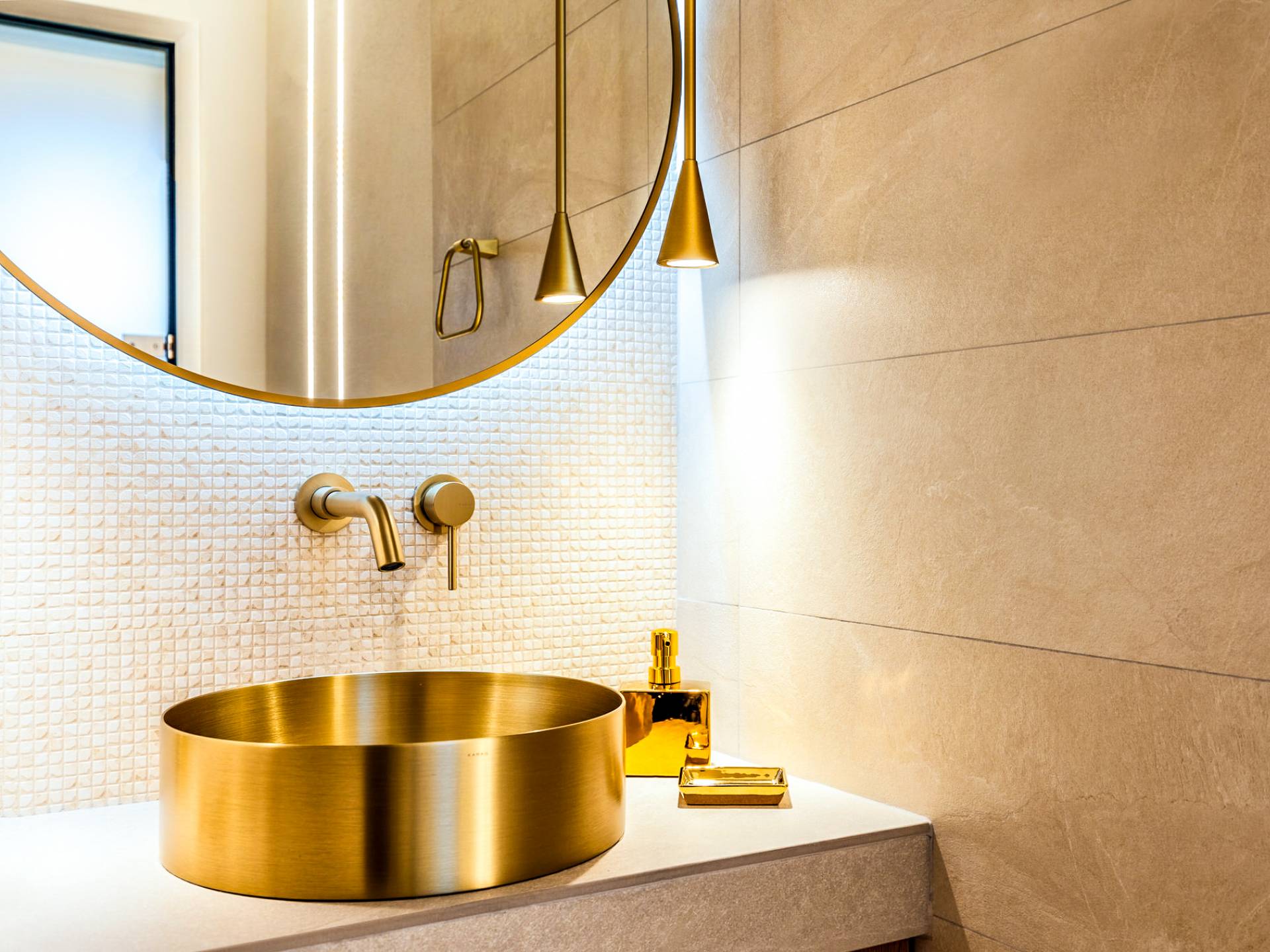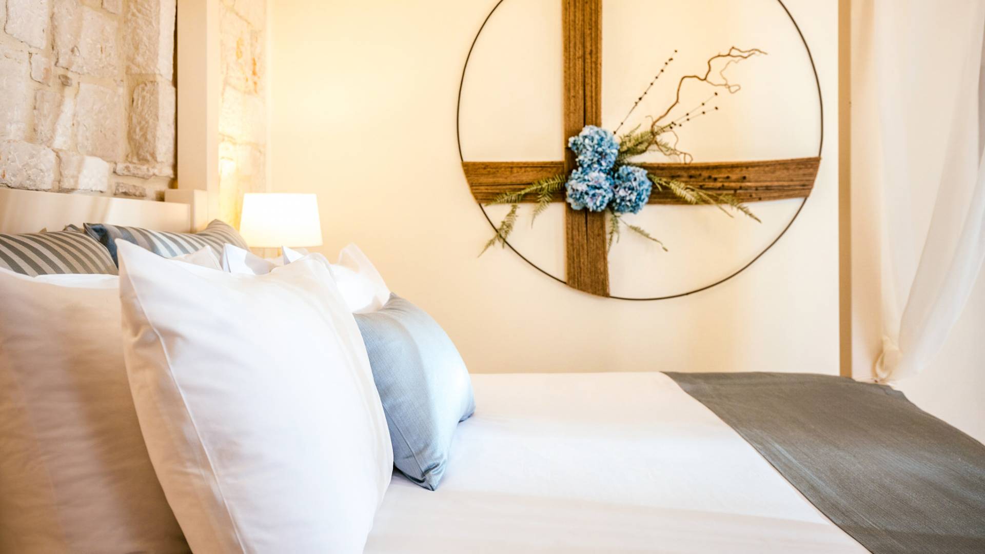 A marble staircase leads you to the first floor that consists of two more bedrooms: one master bedroom (double bed) with an en-suite full bathroom and one twin bedroom with an en-suite shower room.