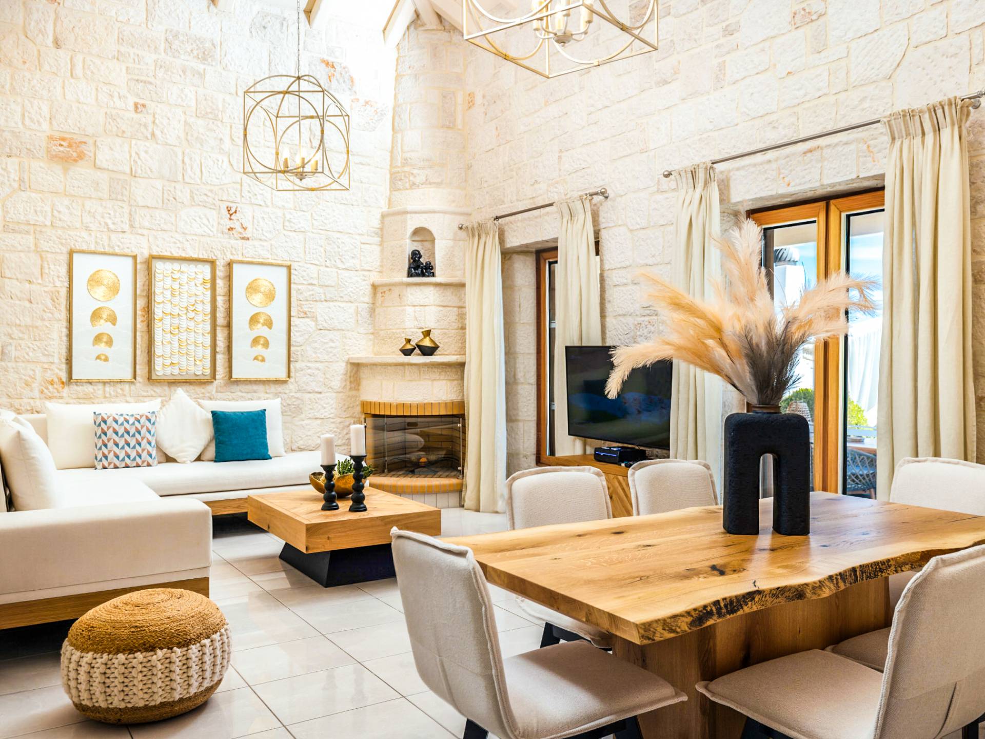 On the ground floor, there is an open plan living/dining area with a fireplace, a large corner sofa and patio doors, a fully equipped kitchen with electric appliances and a full range of cooking equipment/utensils, a master bedroom with a double bed and en suite full bathroom and a twin bedroom with a shower/w-c room next to it. There is also a utility room with a washing machine, iron, and ironing board.
