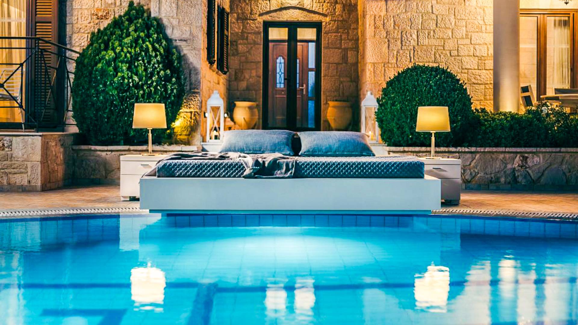 The two-level villa is placed in an area of 440sqm. (180sqm interior space and 260sqm exterior fenced space). Emerald Deluxe Villa Zante accommodates a maximum of 8 people in four bedrooms.