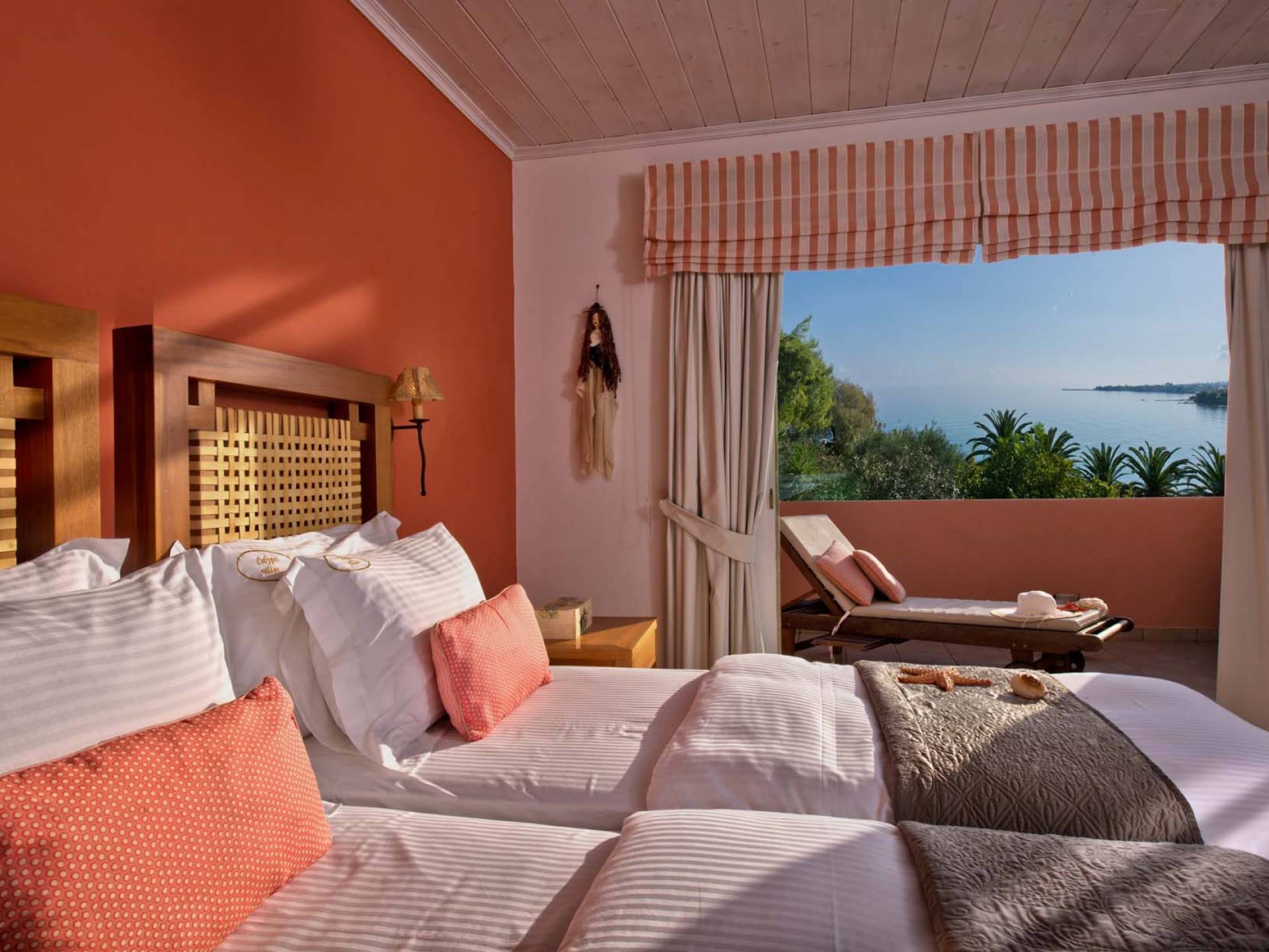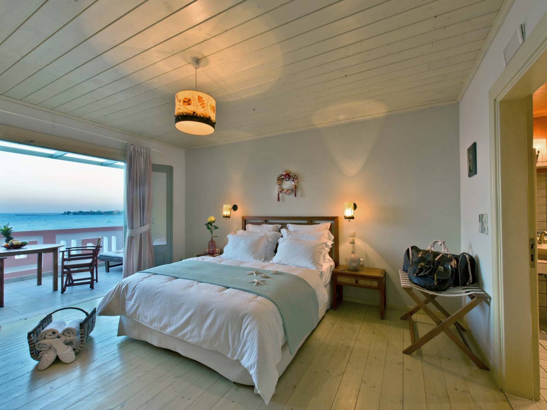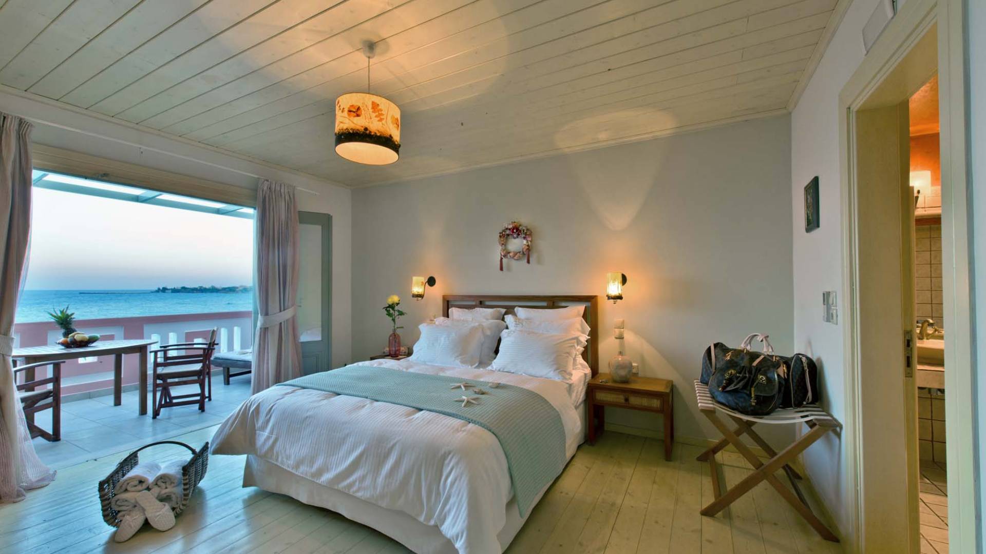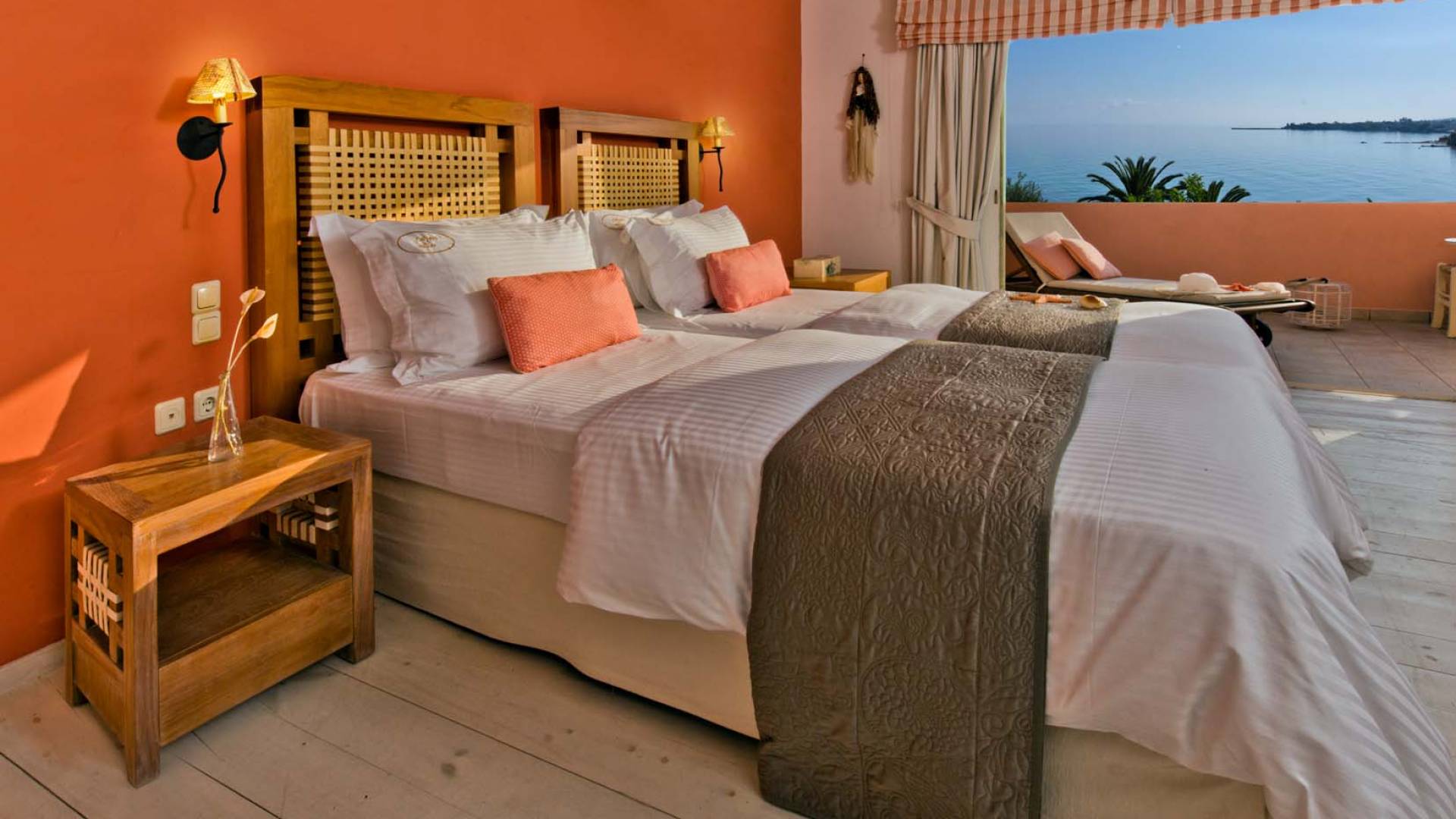 The upper level comprises a bedroom with twin beds and an en suite bathroom with a bathtub. From its spacious balcony, you can enjoy the gentle breeze and a splendid sea view. Feel the luxury of COCO-MAT and the refined quality of Apivita amenities every single moment of your stay. Indulge in relaxing moments at your veranda, fascinated by the spectacular sea views and sipping on your iced cold beverage or enjoying a light snack.