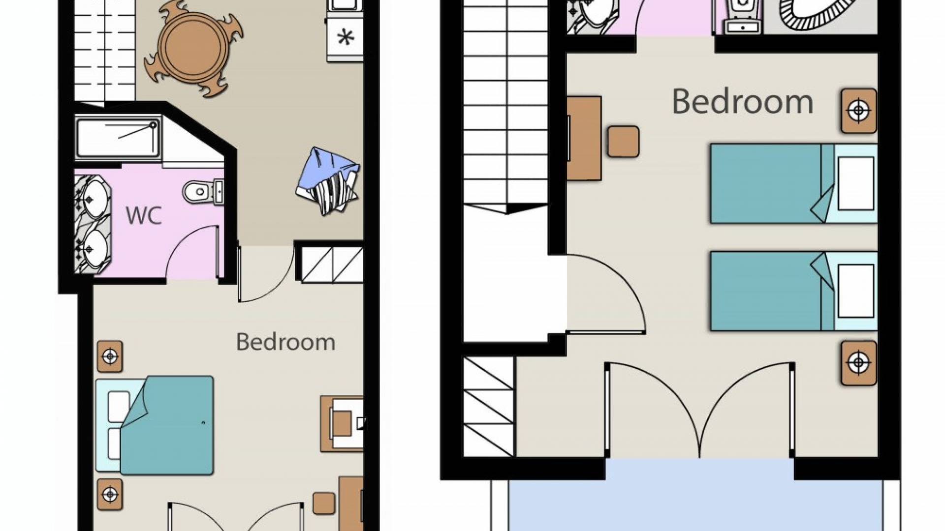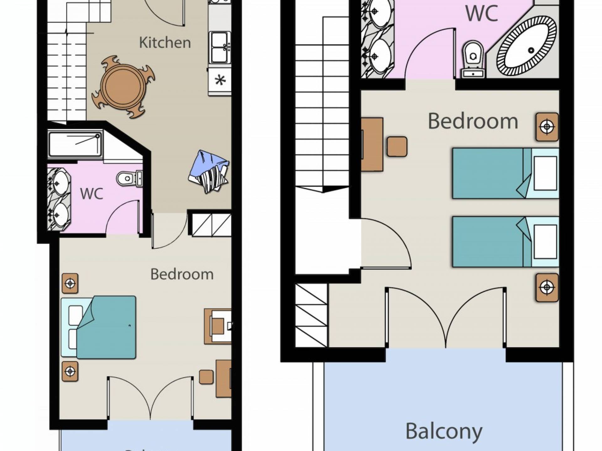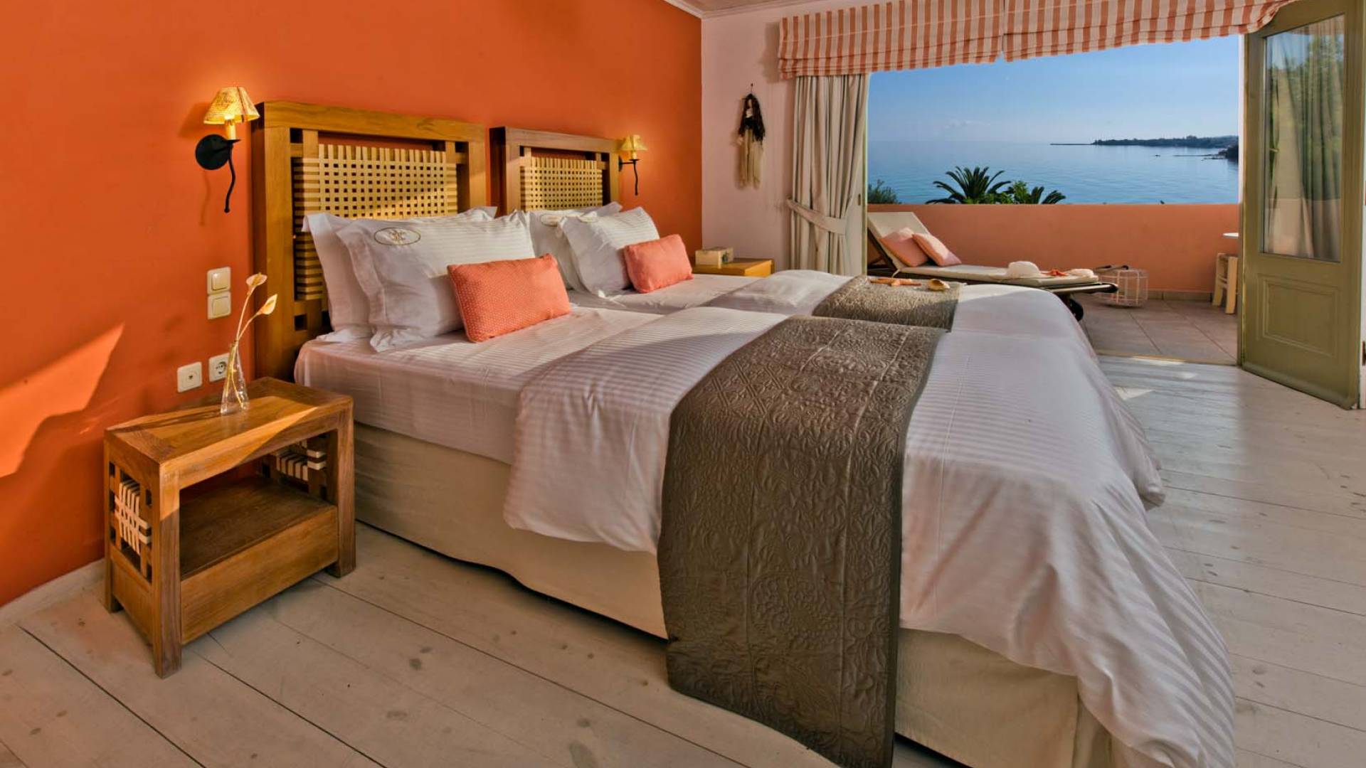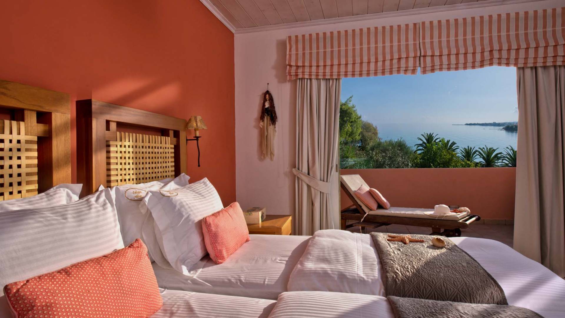 The upper level comprises a bedroom with twin beds and an en suite bathroom with a bathtub. From its spacious balcony, you can enjoy the gentle breeze and a splendid sea view. Feel the luxury of COCO-MAT and the refined quality of Apivita amenities every single moment of your stay. Indulge in relaxing moments at your veranda, fascinated by the spectacular sea views and sipping on your iced cold beverage or enjoying a light snack.
