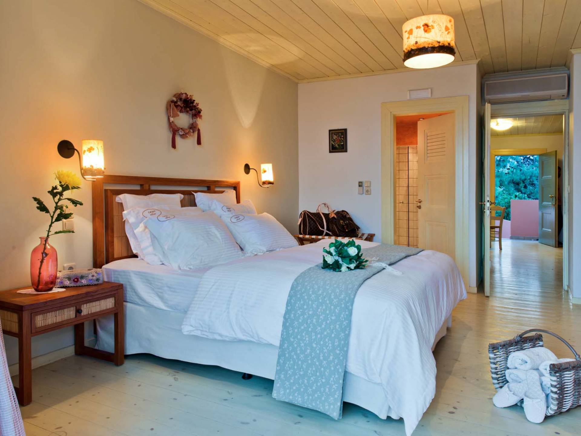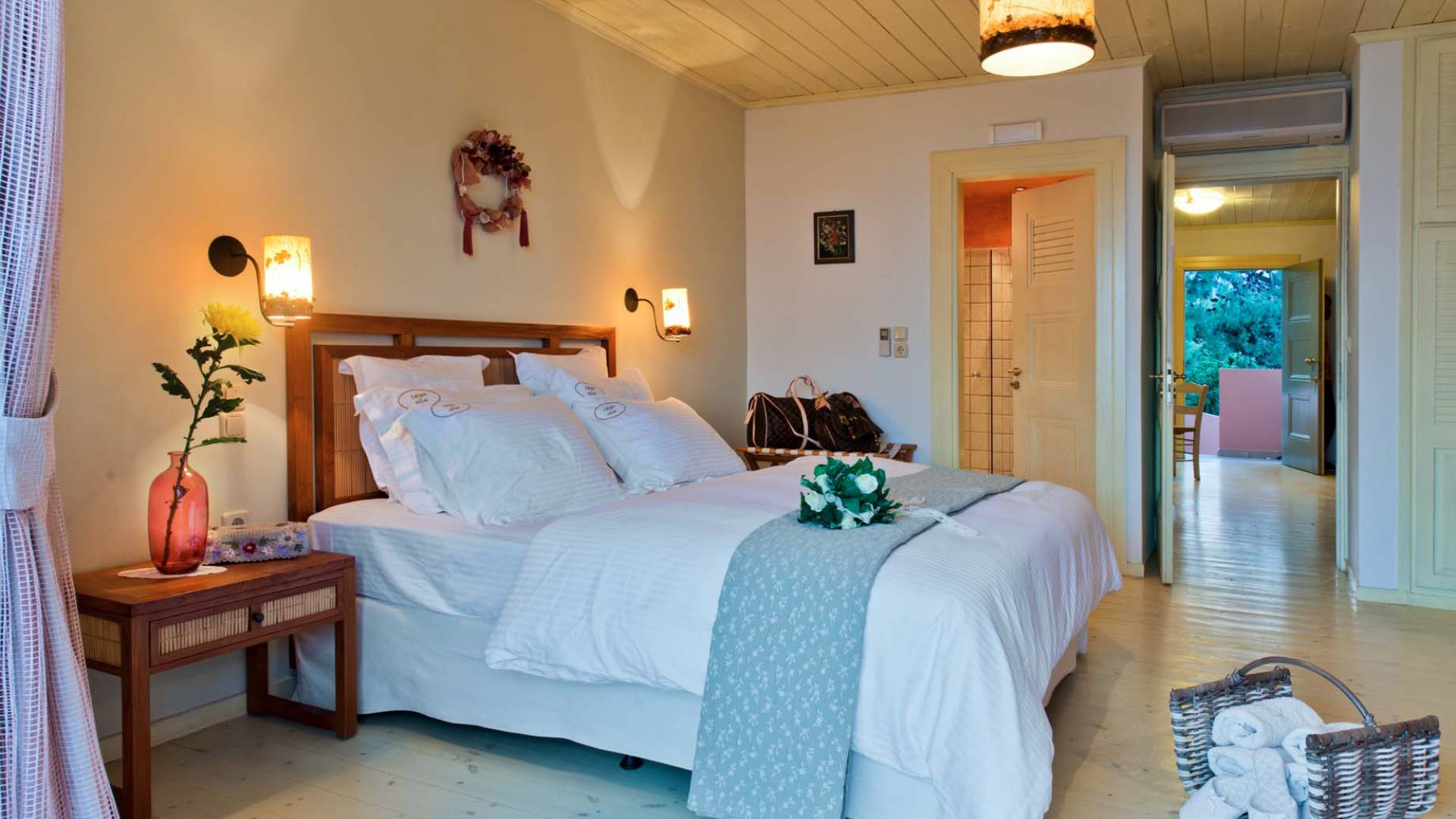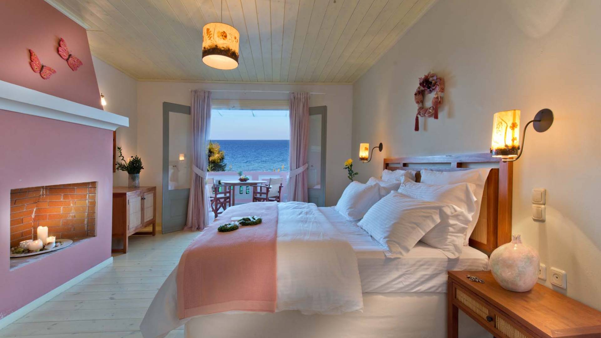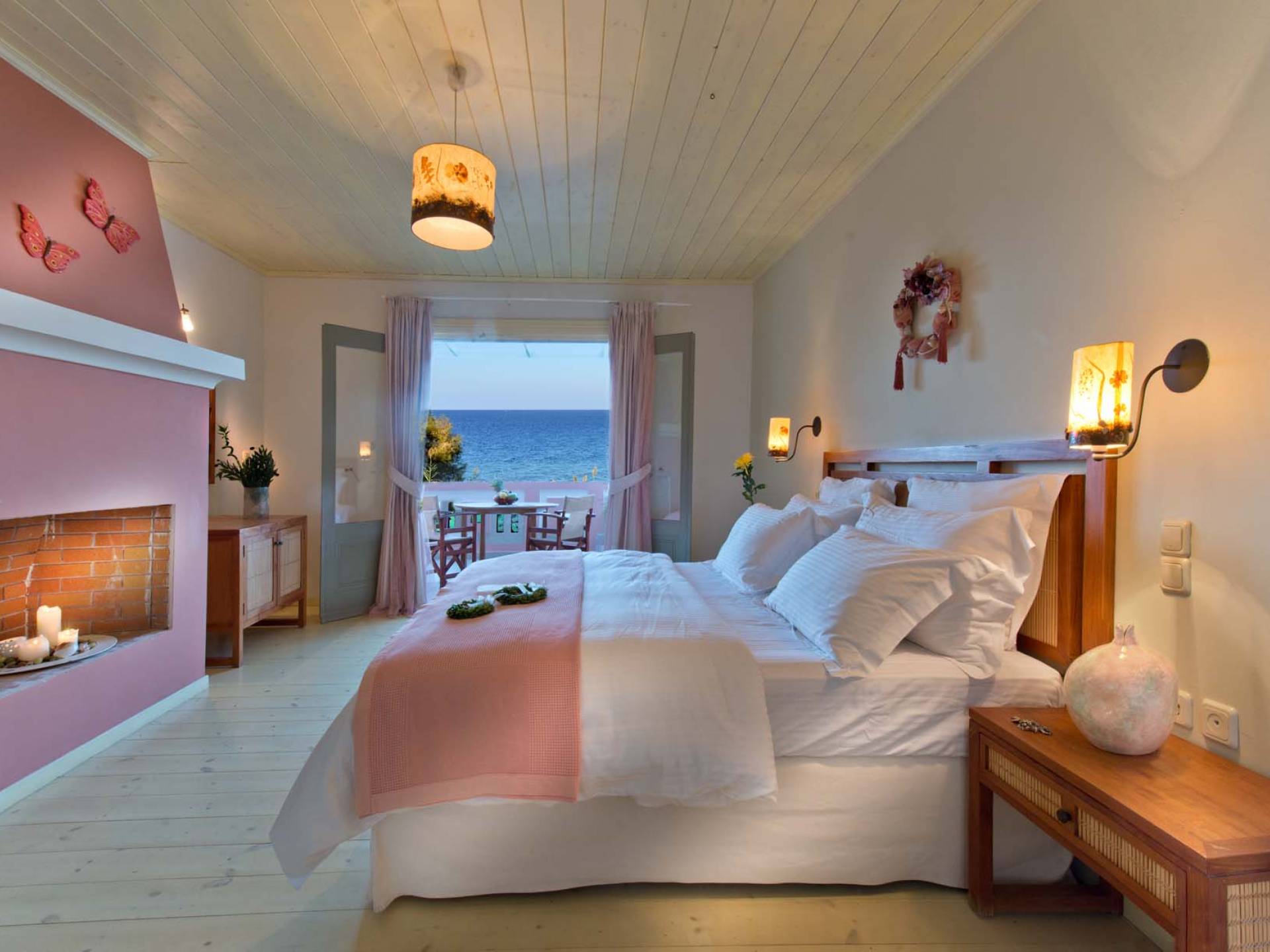 This is a two-level luxury villa-apartment of 90sqm, overlooking the Ionian Sea from spacious verandas at both bedrooms. At the lower level, there is an ample open-plan living/dining area with a fully equipped kitchen, the master bedroom with a king-size bed, a romantic open fireplace, and an en suite luxury bathroom.