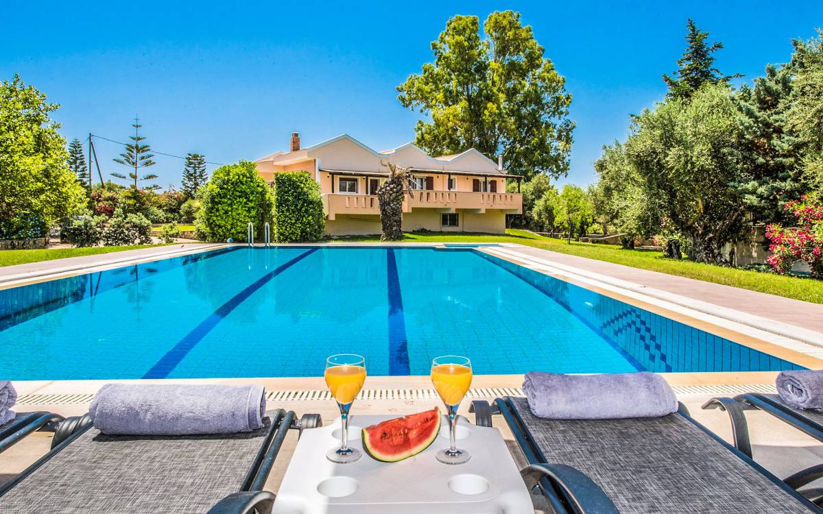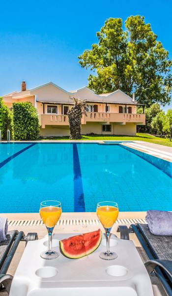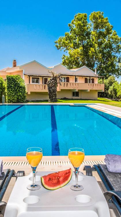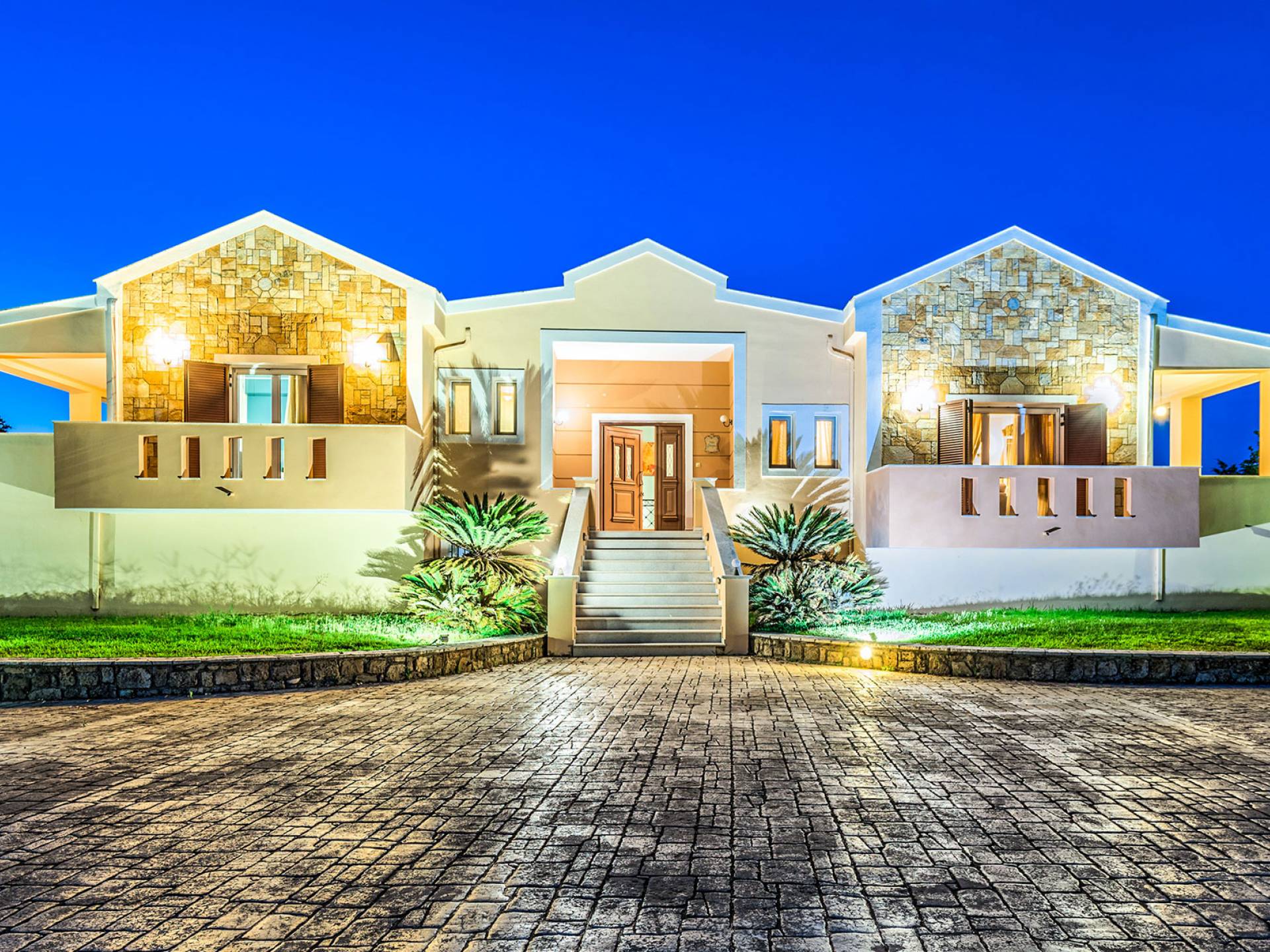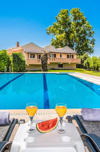 Set in a plot of 12000 sqm among the trees and endless greenery, Leone Luxury Villas Zante offers the ideal holiday destination for families and couples. The whole estate is enclosed by a stone wall in an area with all kinds of trees varying from palm trees to pine trees with an endless grass area as far as the eye can see and picturesque stone footpaths and bridges.