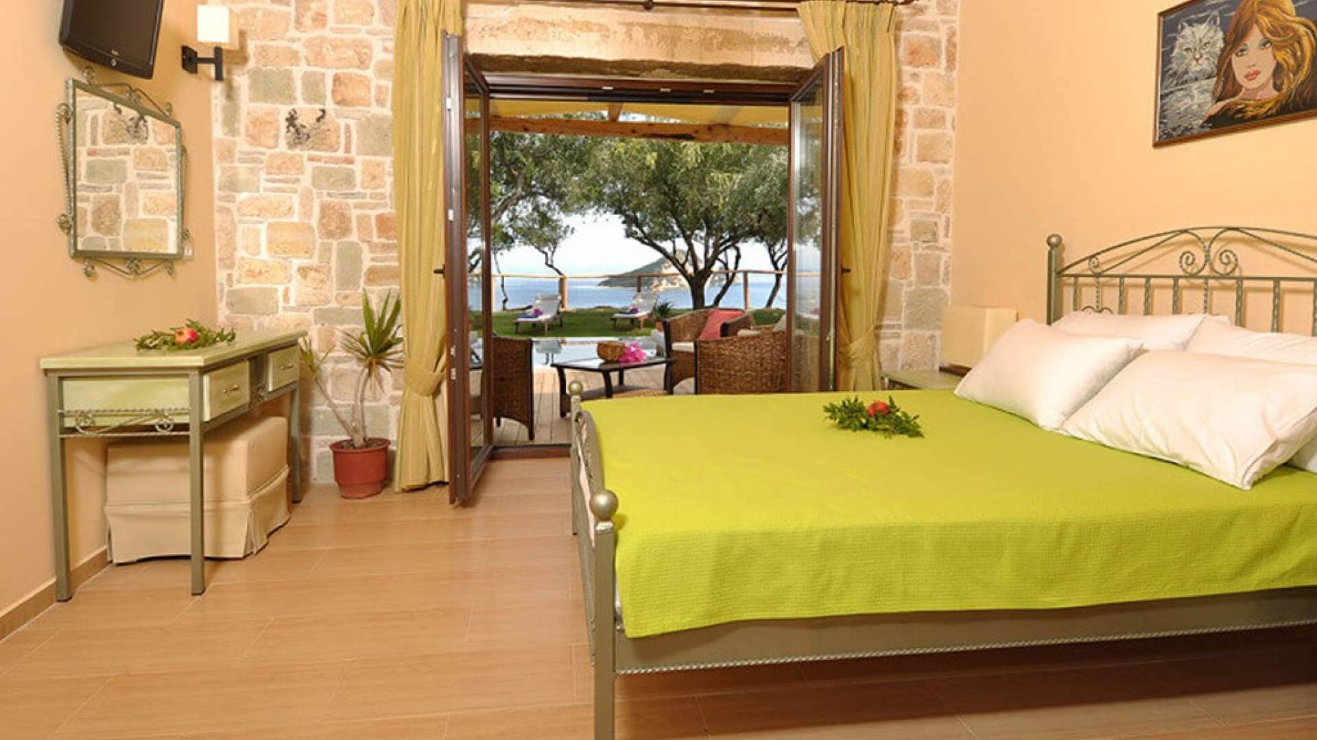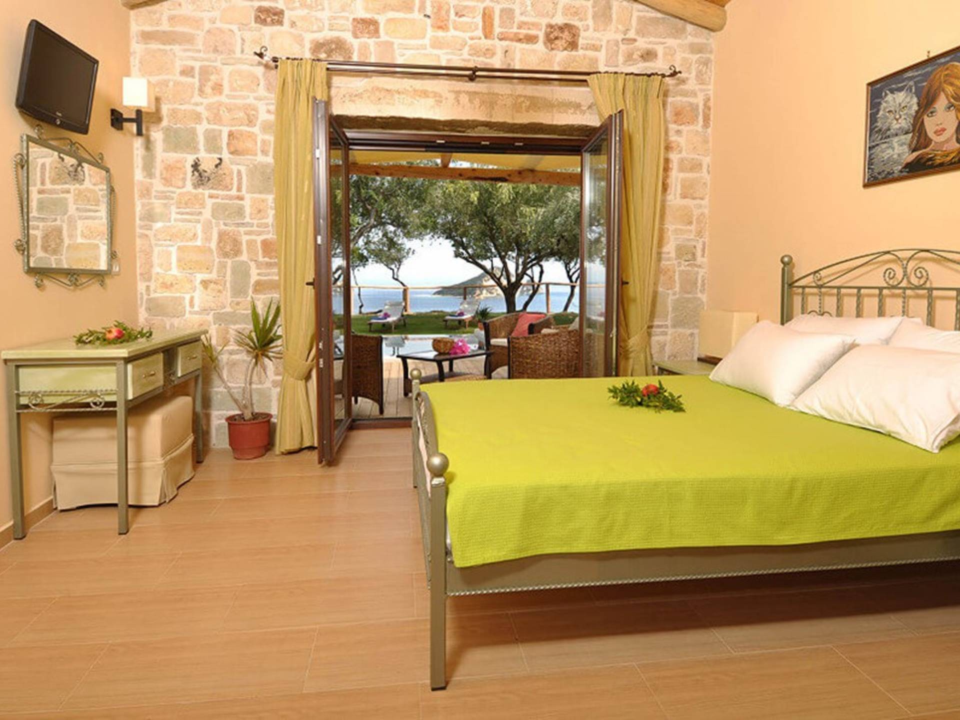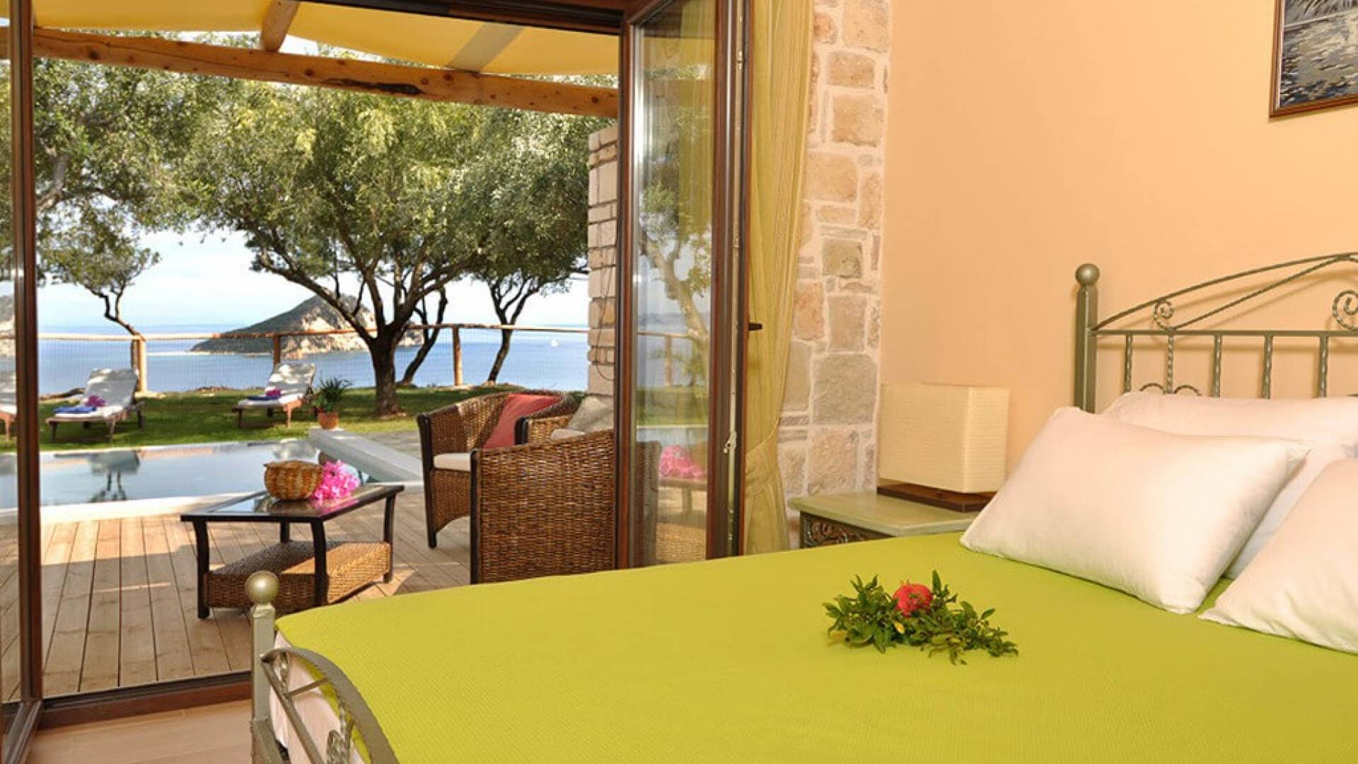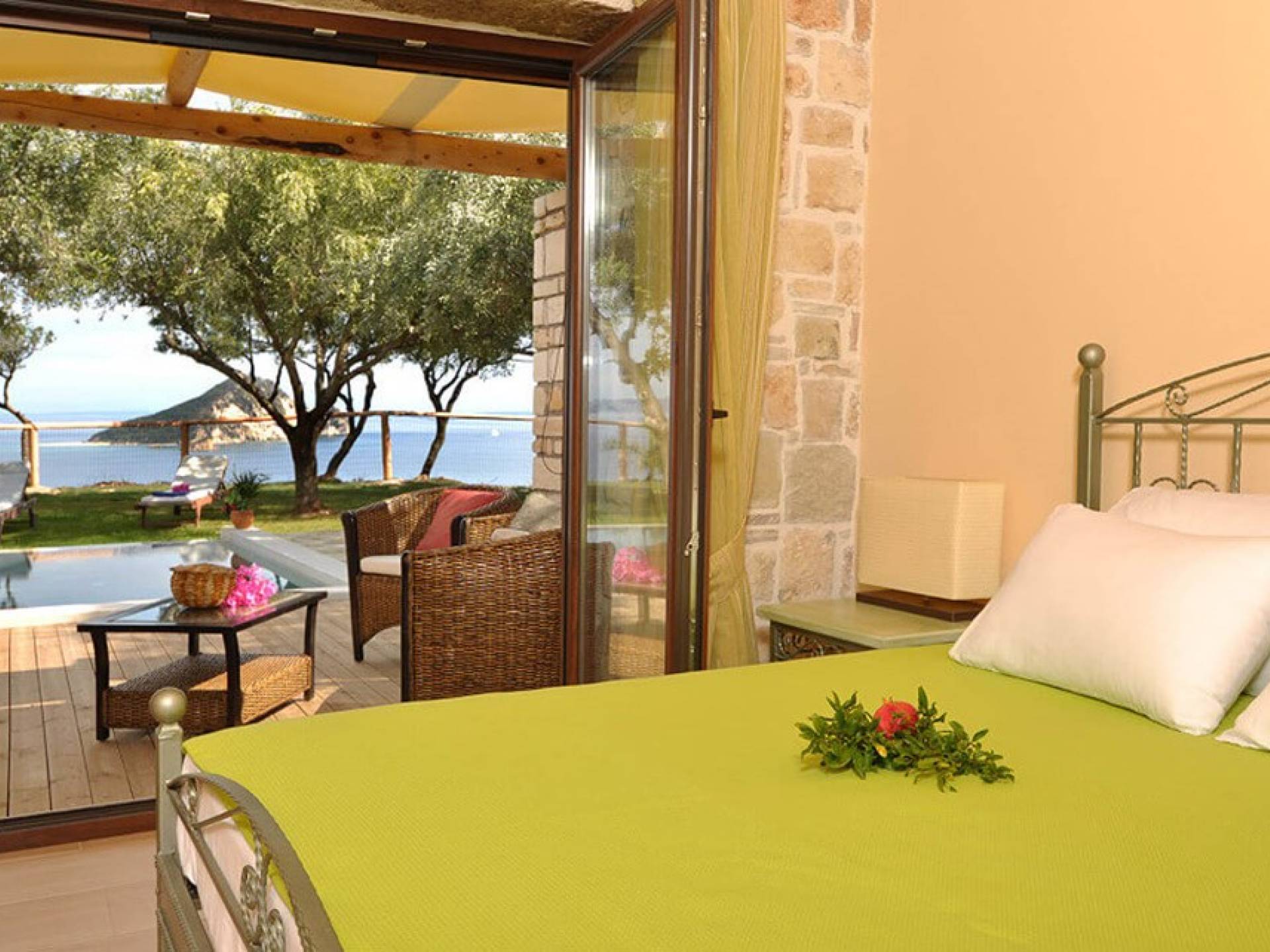 The villas have been built with great attention and emphasis to detail. The colors are in complete harmony with the greenery of the surrounding trees and the blue of the sea and are characterized by simplicity and the high quality of the materials used. The surroundings are really exquisite, with a view of Keri Lake and the beautiful, green island of Marathonisi. The complete independence of each villa, the subtle luxury, and the quiet nature are ideal for relaxing walks and swimming in the clear blue sea.