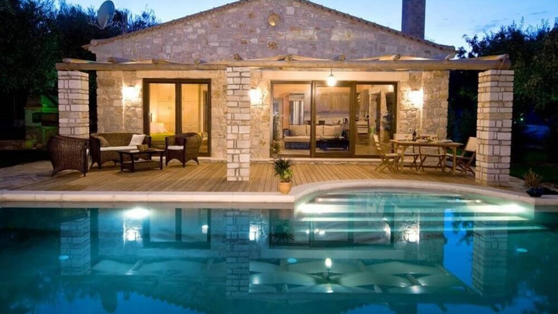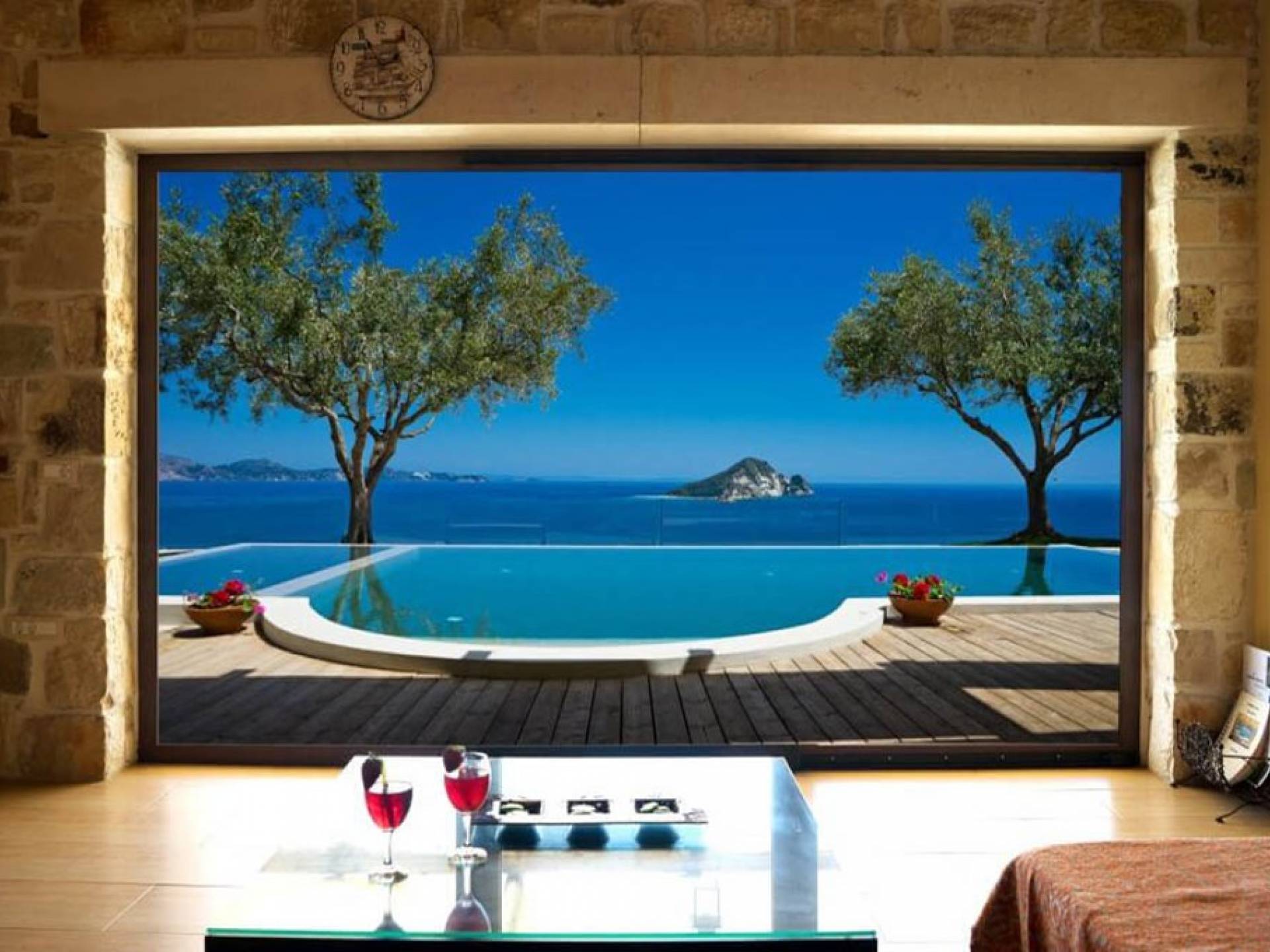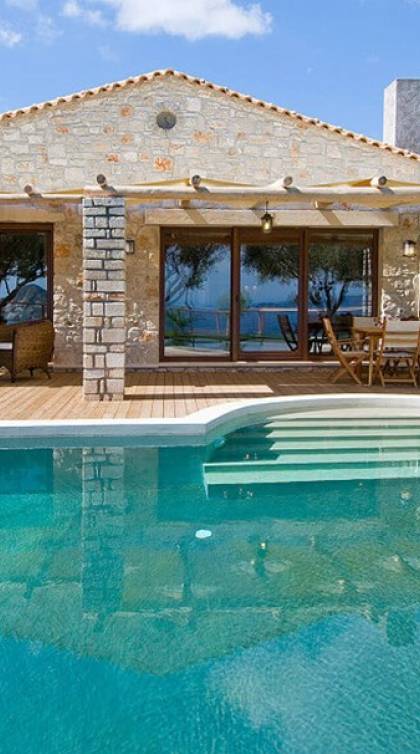 Villa Pefkos is a beautiful, traditional stone villa with a private swimming pool and spectacular views over the Ionian Sea and Marathonisi Island. The villa consists of three bedrooms all with double beds, two of the bedrooms also have ensuite bathrooms with showers and in addition, the villa has another bathroom with a bath tub. The fully equipped kitchen includes cooker/hob, fridge/freezer, kettle, toaster, coffee machine and all utensils and a dining area with table and chairs for six persons. Relax in the wonderful lounge area which has an open fireplace, plasma satellite TV, a sofa-bed and French windows leading outside to the decking and private swimming pool.