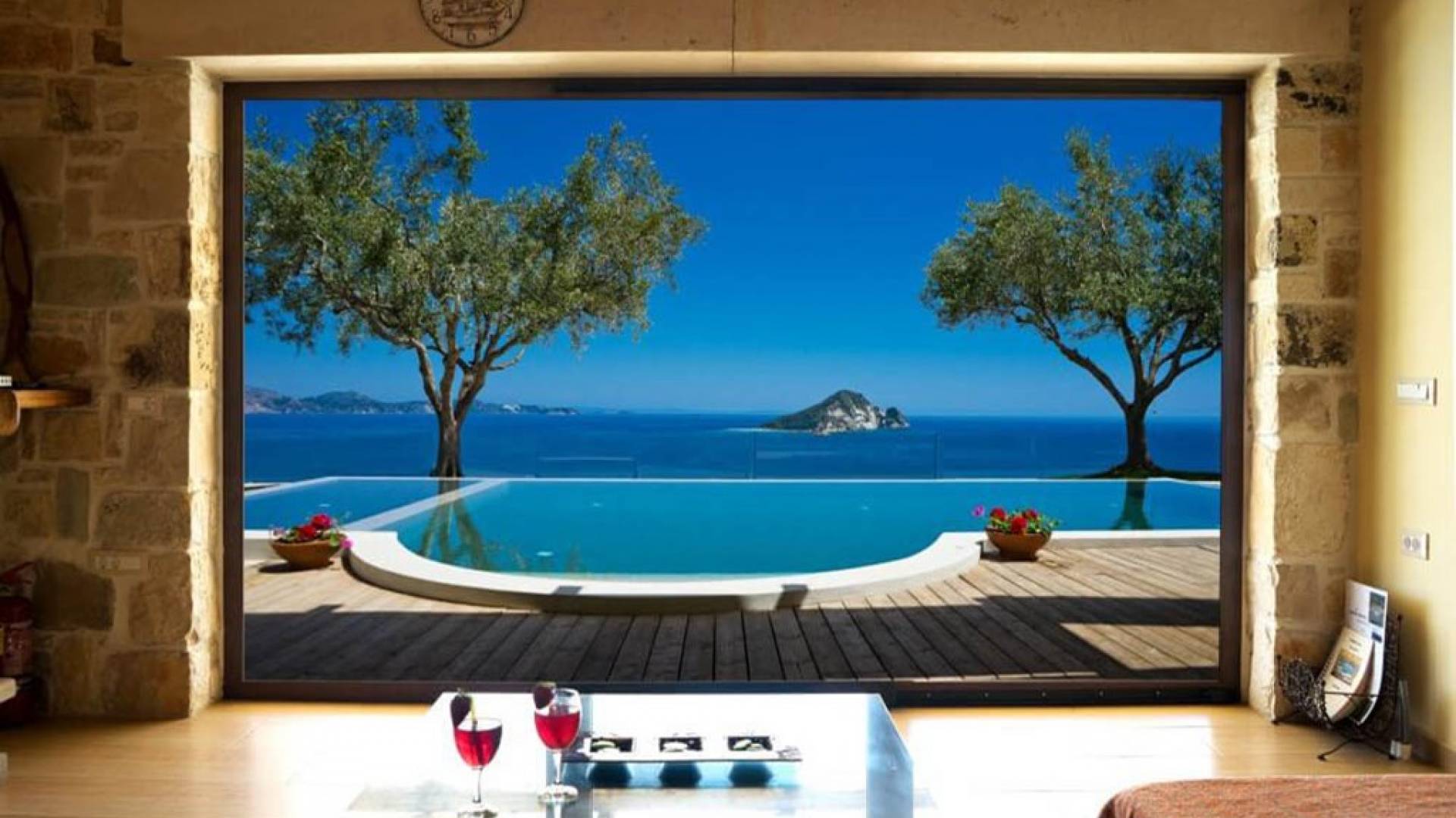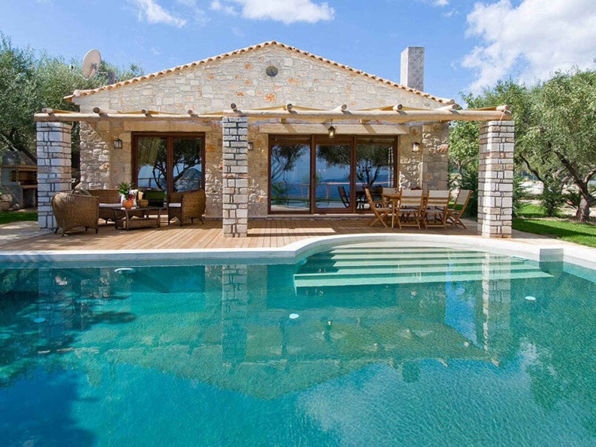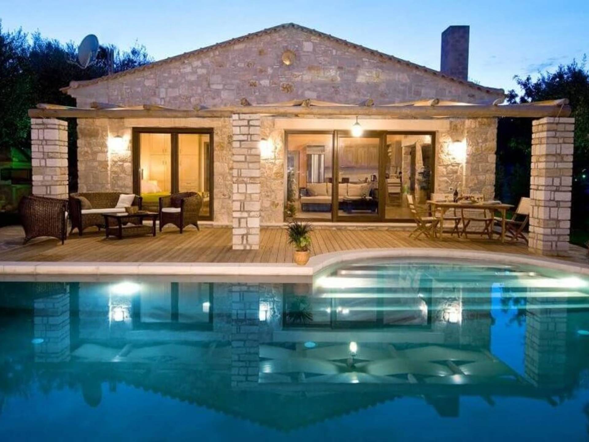 Villa Pefkos is a beautiful, traditional stone villa with a private swimming pool and spectacular views over the Ionian Sea and Marathonisi Island. The villa consists of three bedrooms all with double beds, two of the bedrooms also have ensuite bathrooms with showers and in addition, the villa has another bathroom with a bath tub. The fully equipped kitchen includes cooker/hob, fridge/freezer, kettle, toaster, coffee machine and all utensils and a dining area with table and chairs for six persons. Relax in the wonderful lounge area which has an open fireplace, plasma satellite TV, a sofa-bed and French windows leading outside to the decking and private swimming pool.