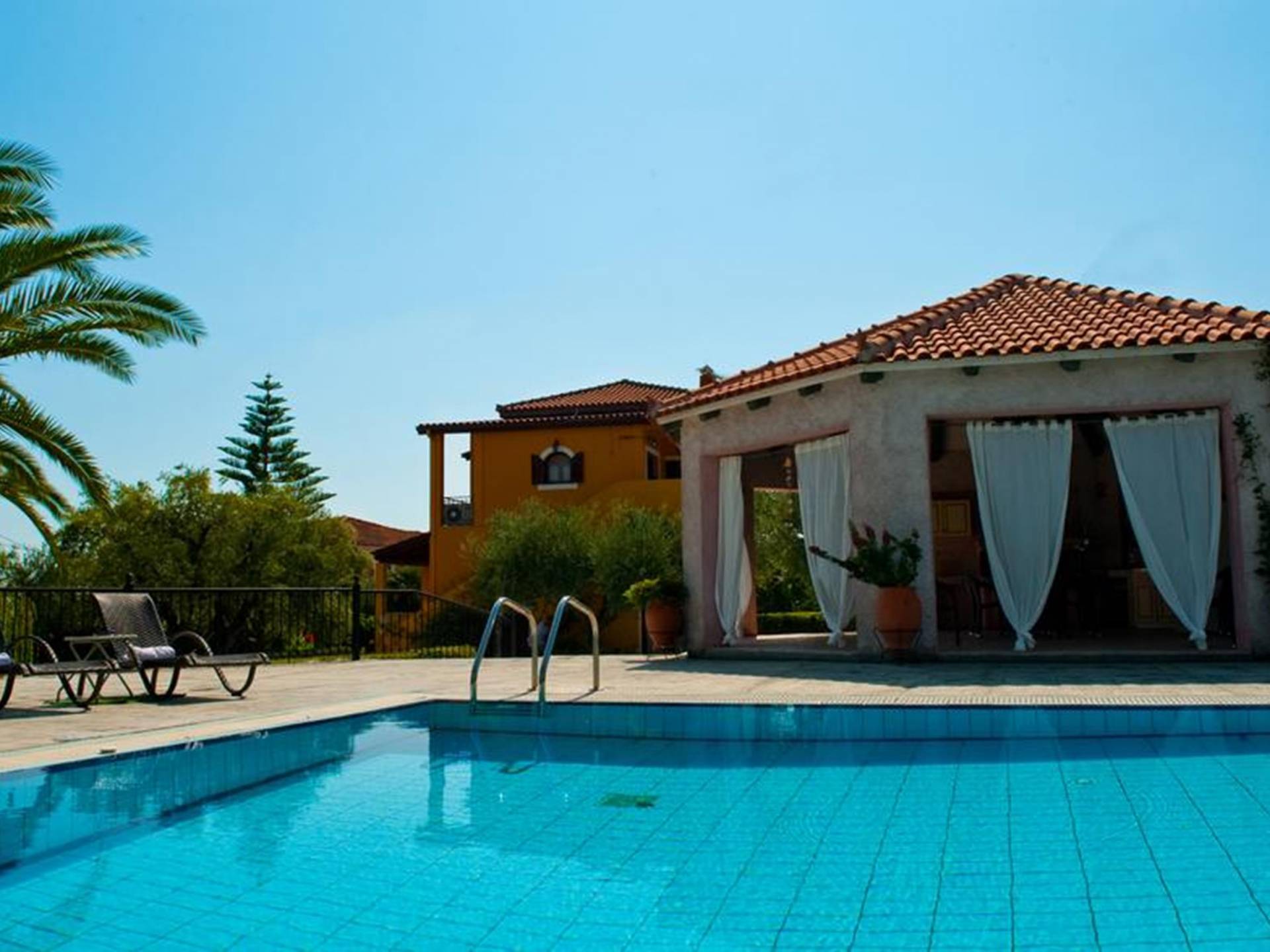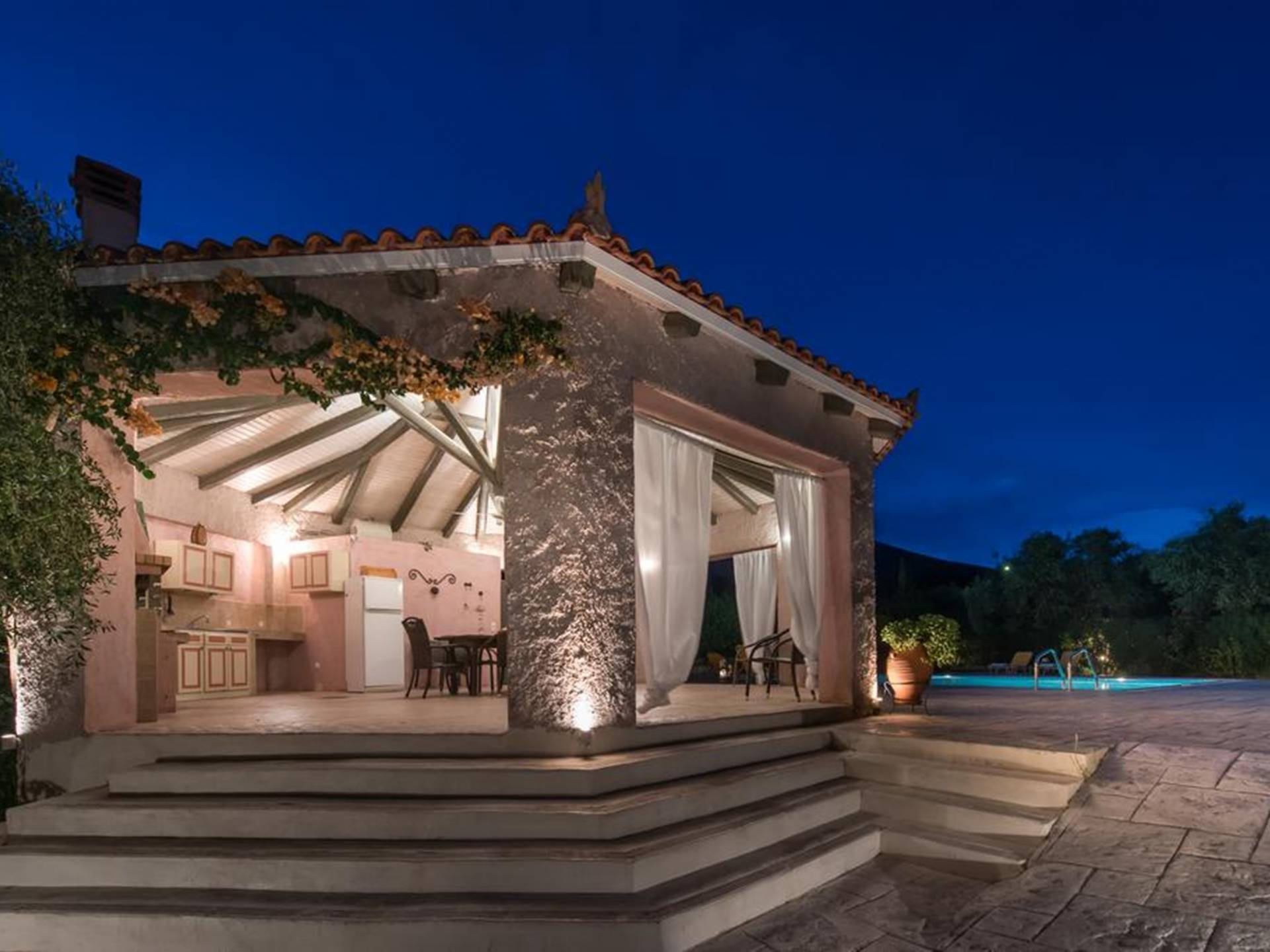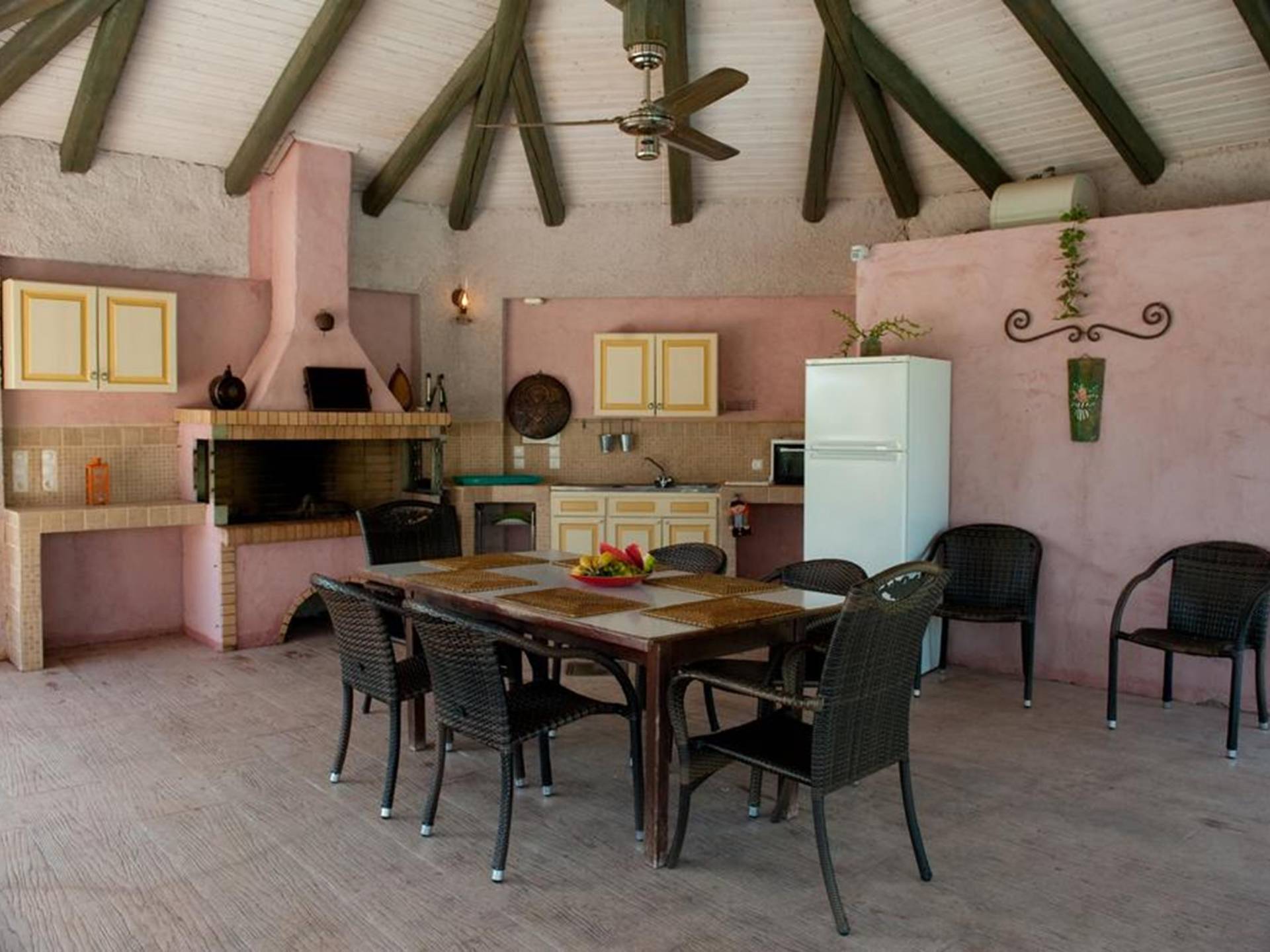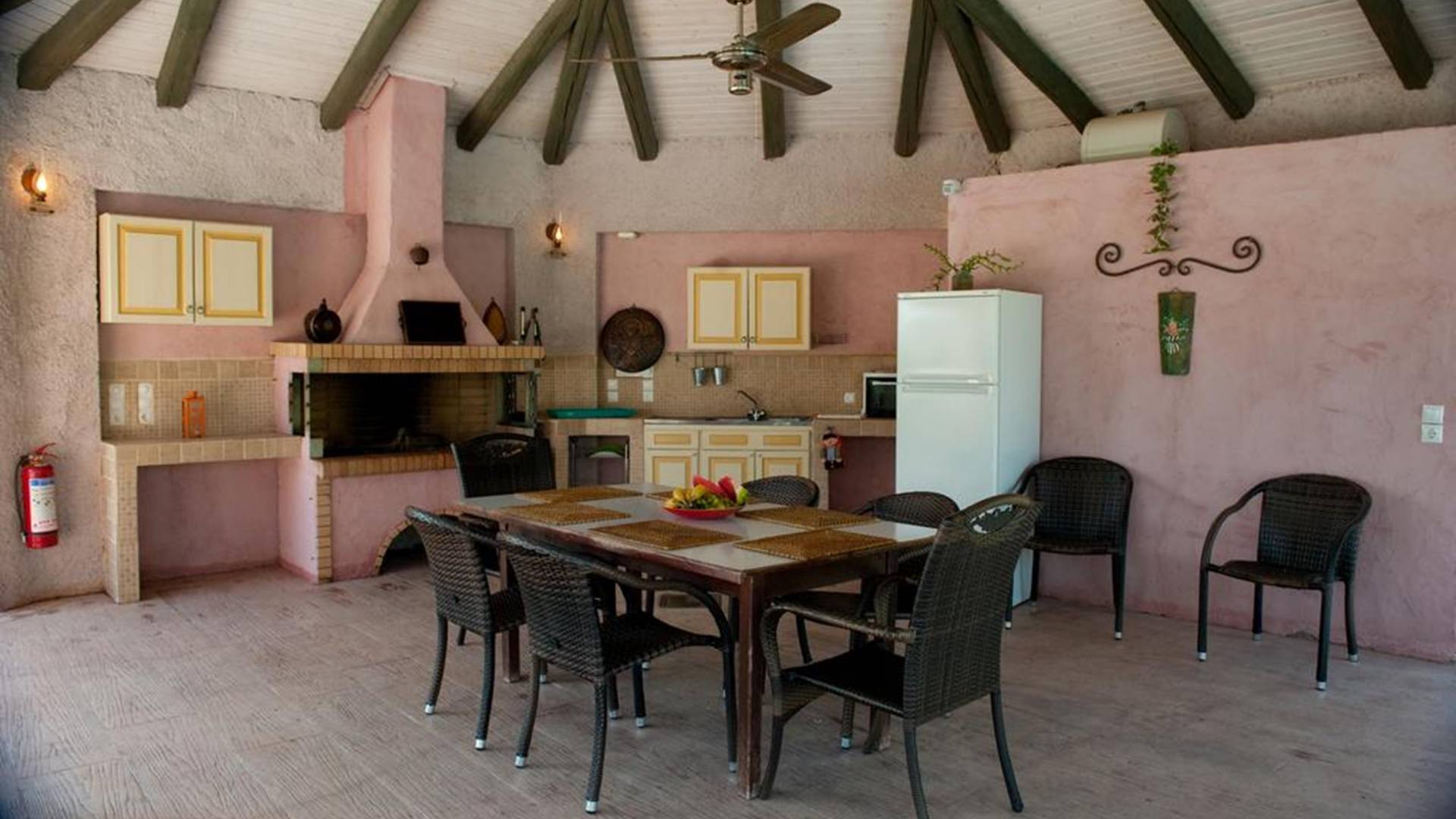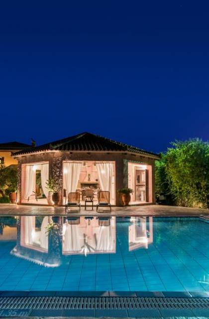 At the exterior grounds of which a 600m2 area is covered with lawn, are located the swimming pool and the patio with the characteristic traditional tile roof. The patio provides a fully equipped kitchen, a dining table, BBQ, and bathroom.
