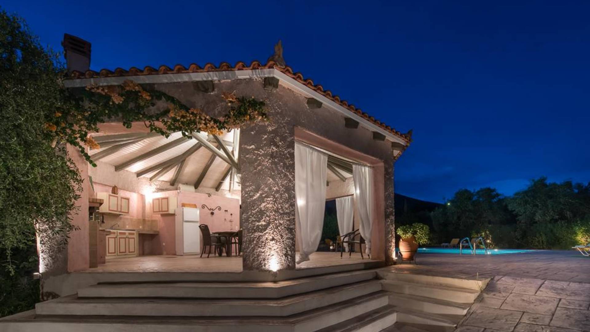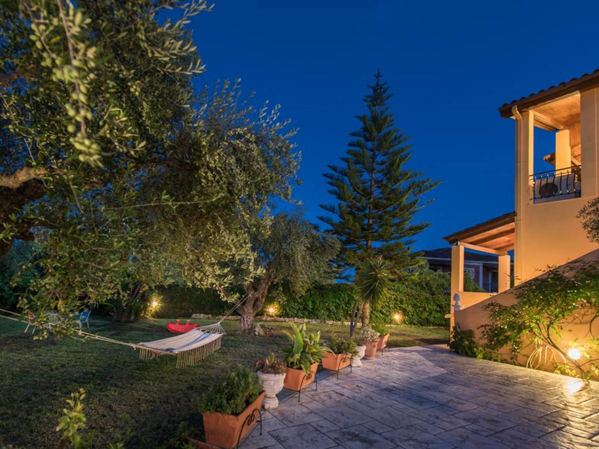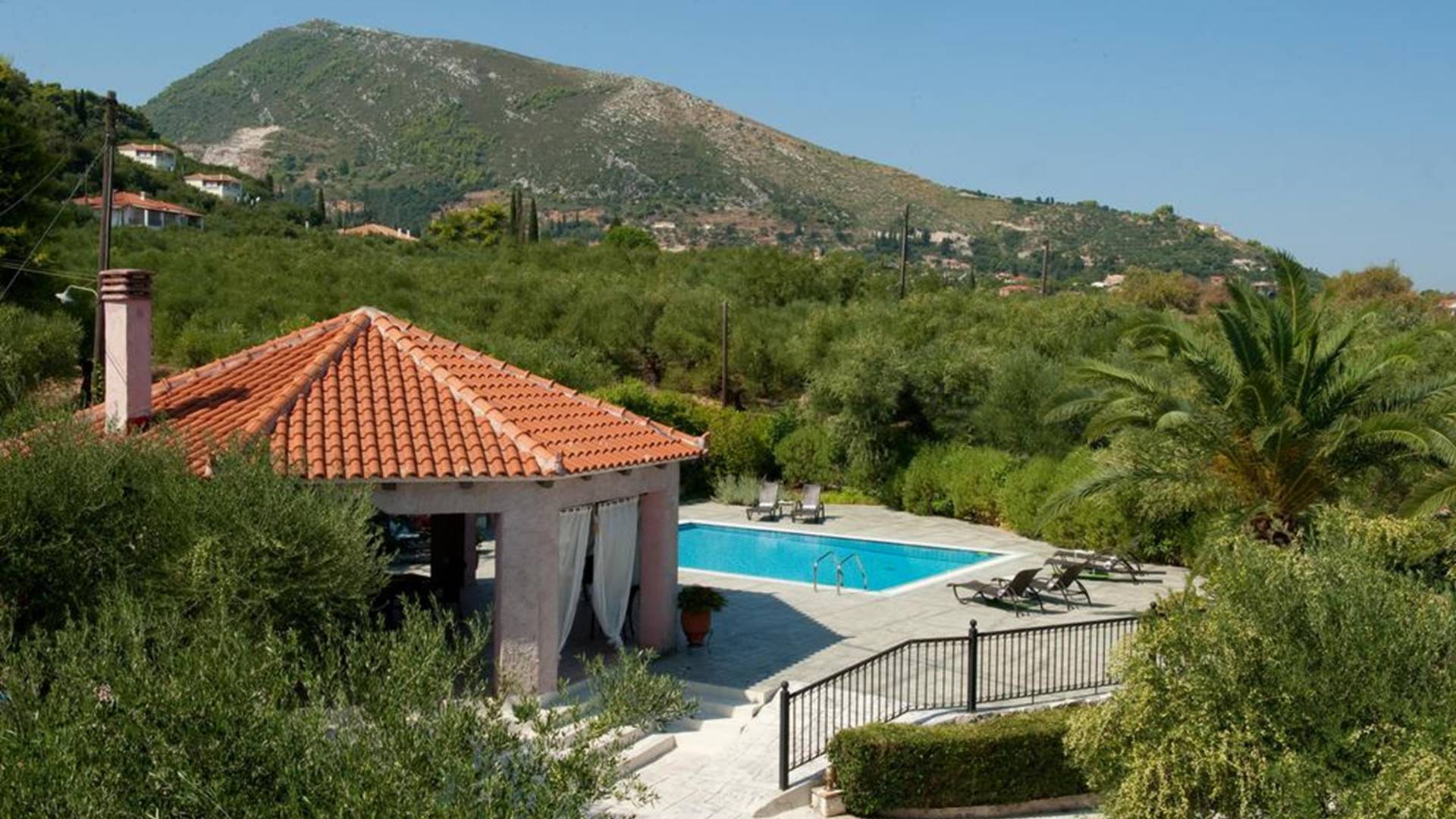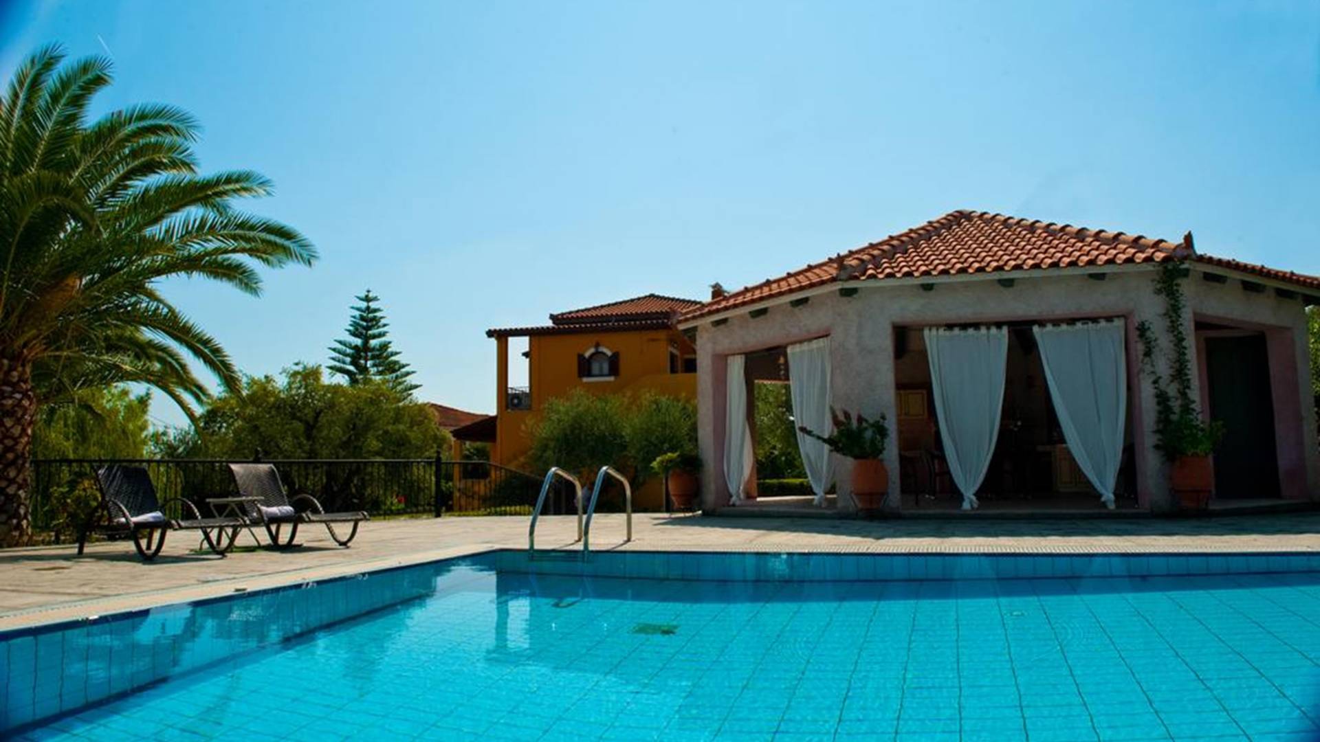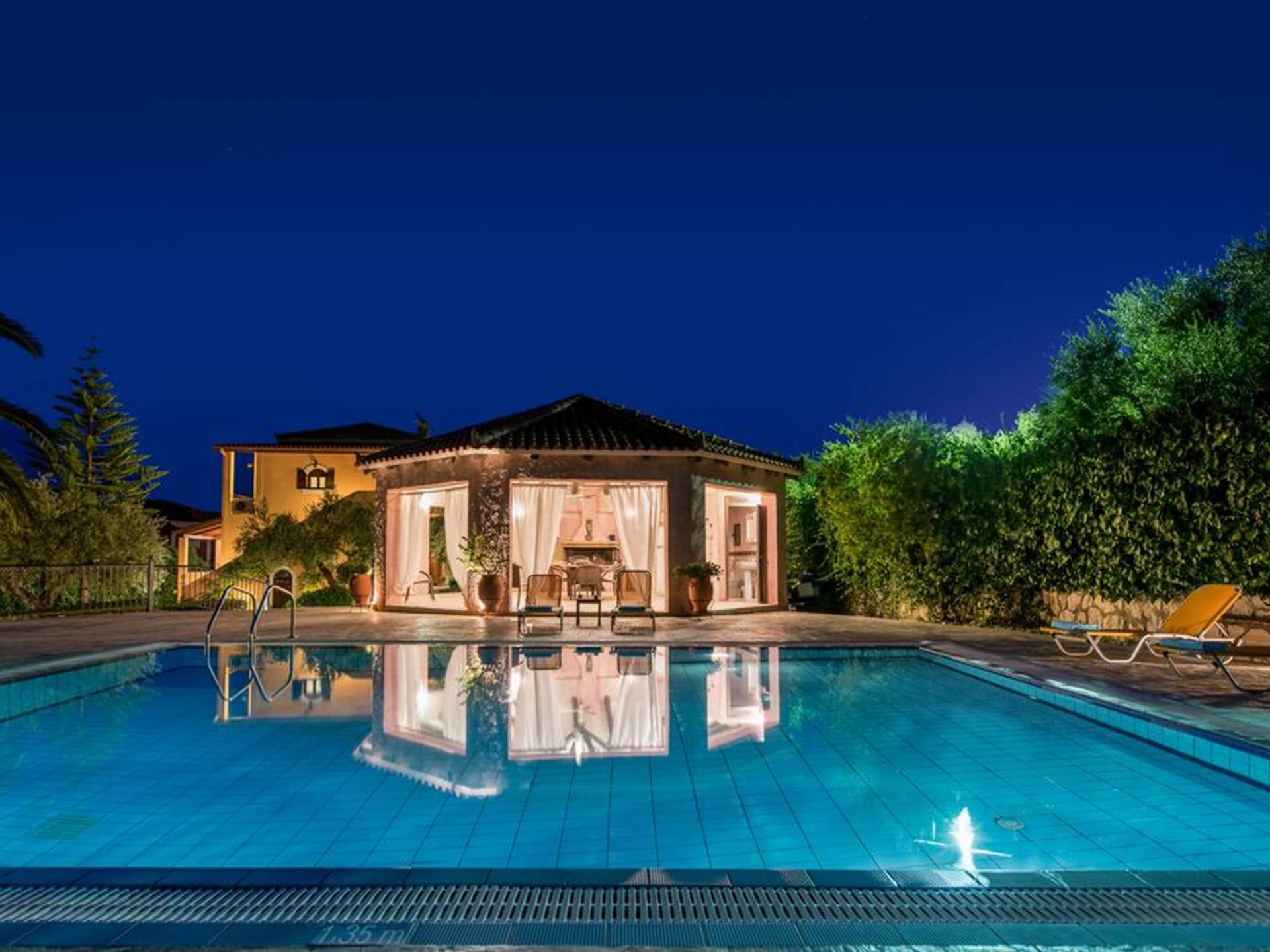 At the exterior grounds of which a 600m2 area is covered with lawn, are located the swimming pool and the patio with the characteristic traditional tile roof. The patio provides a fully equipped kitchen, a dining table, BBQ, and bathroom.