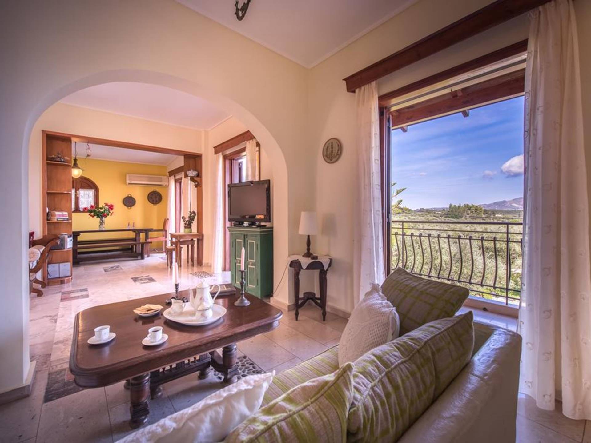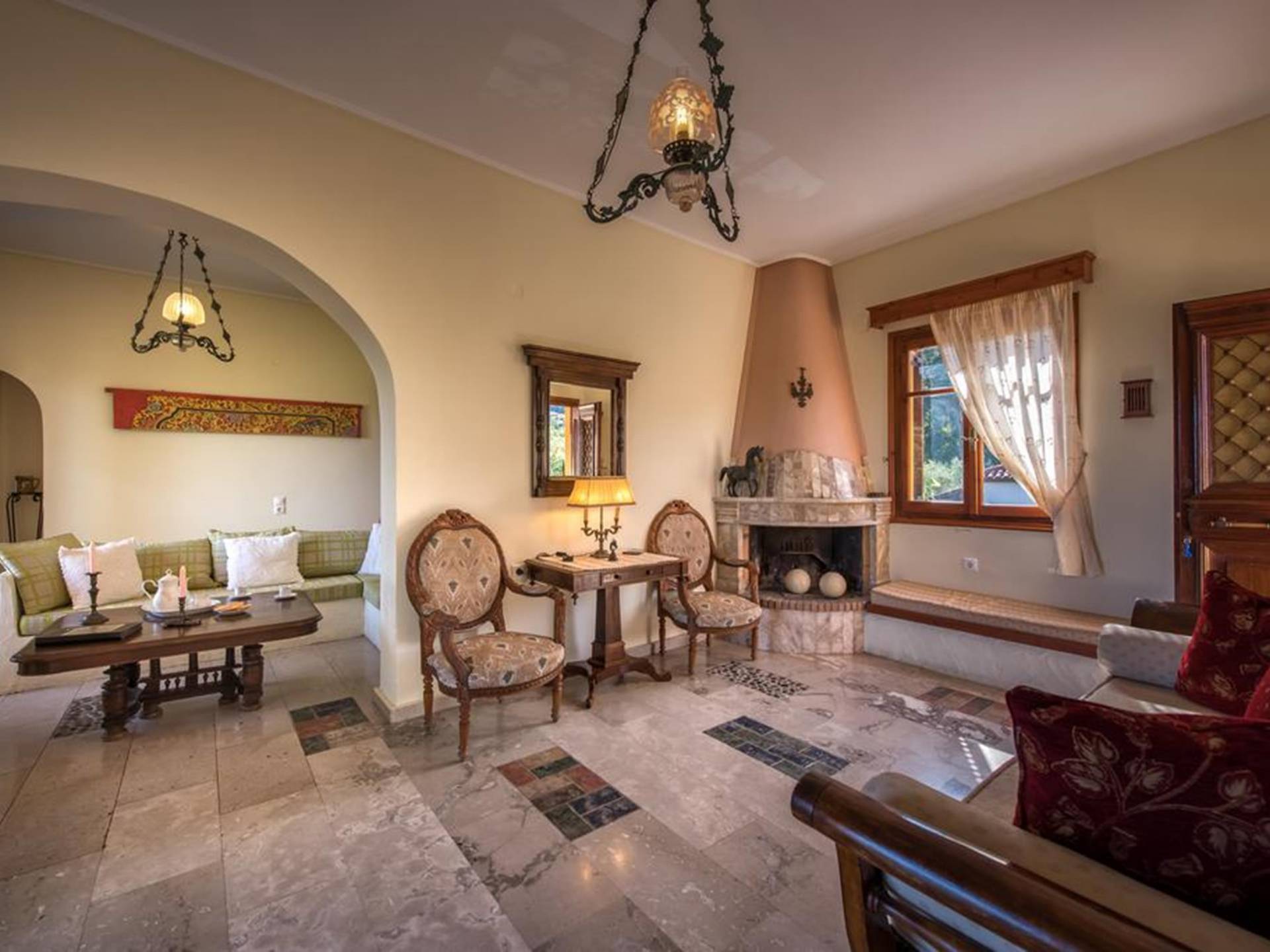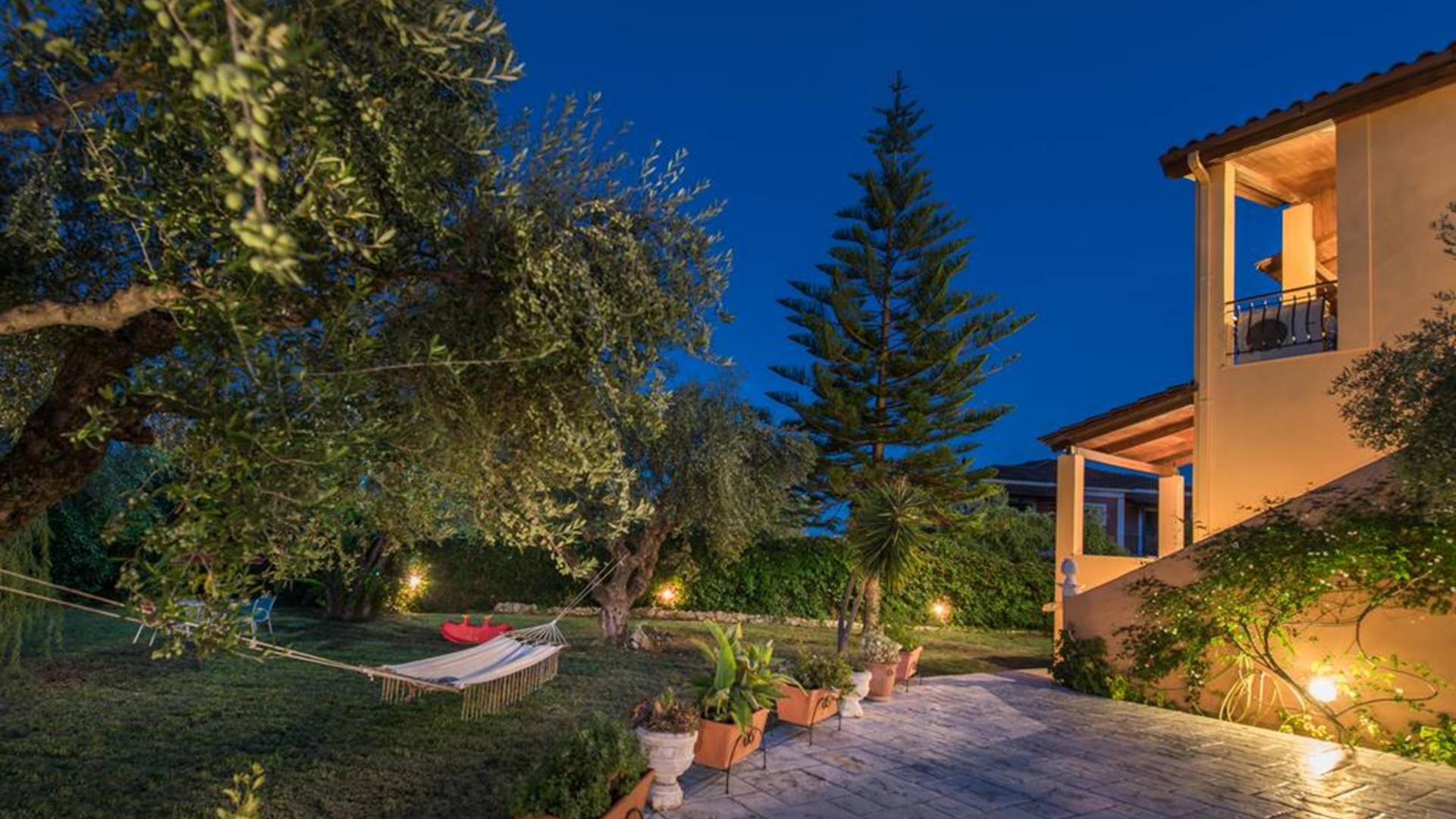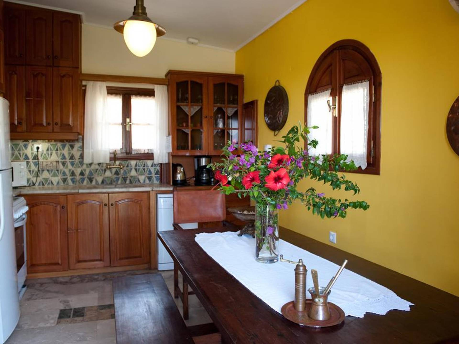 At the exterior grounds of which a 600m2 area is covered with lawn, are located the swimming pool and the patio with the characteristic traditional tile roof. The patio provides a fully equipped kitchen, a dining table, BBQ, and bathroom.