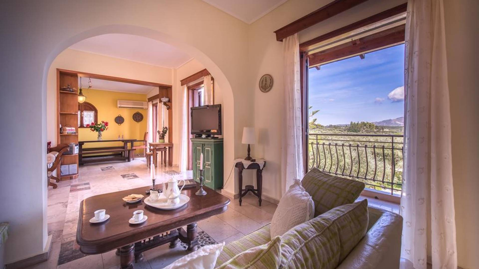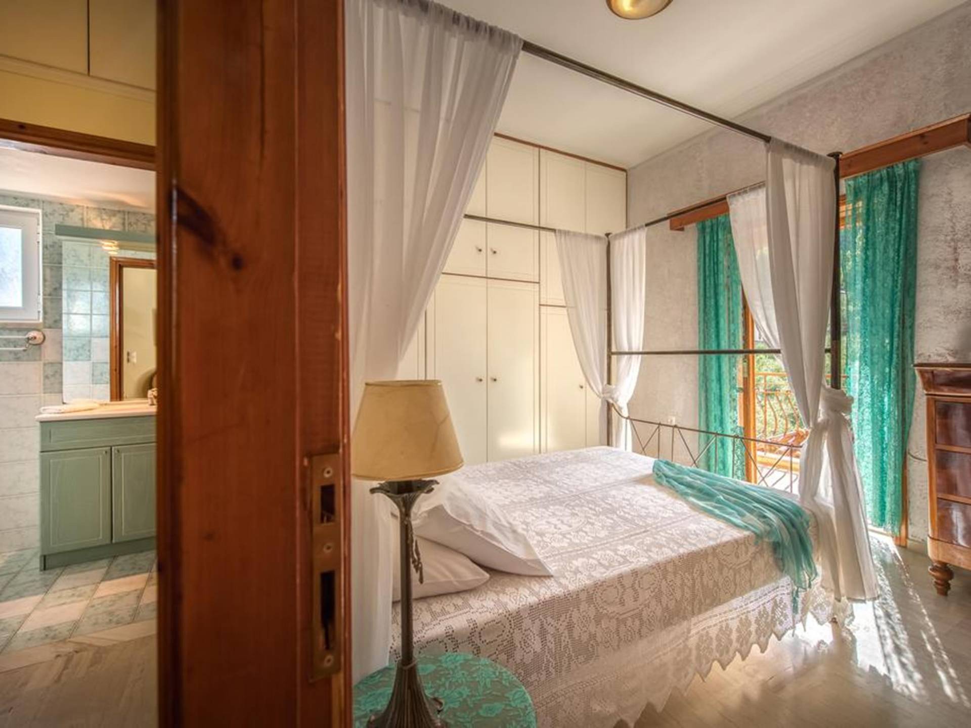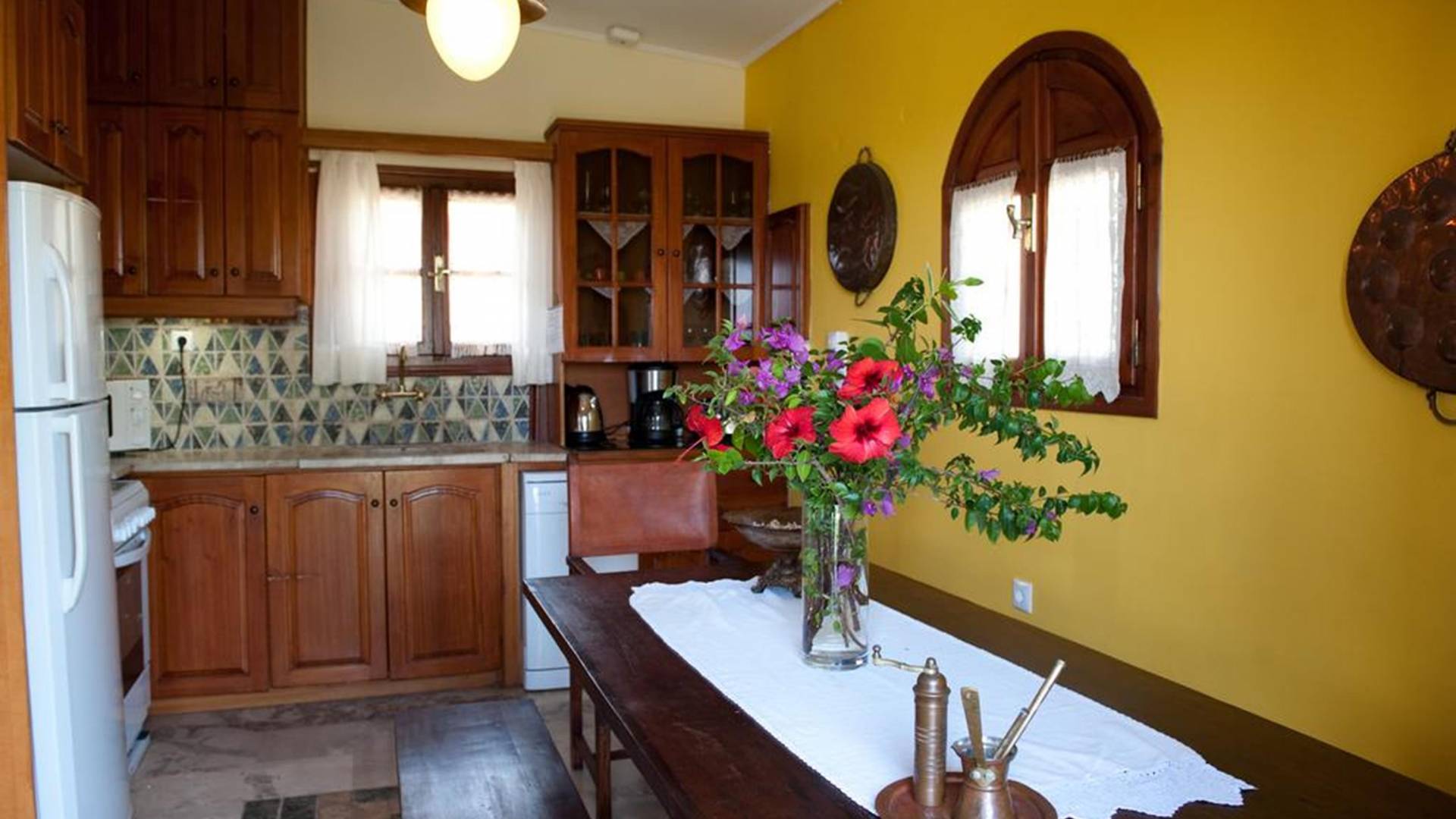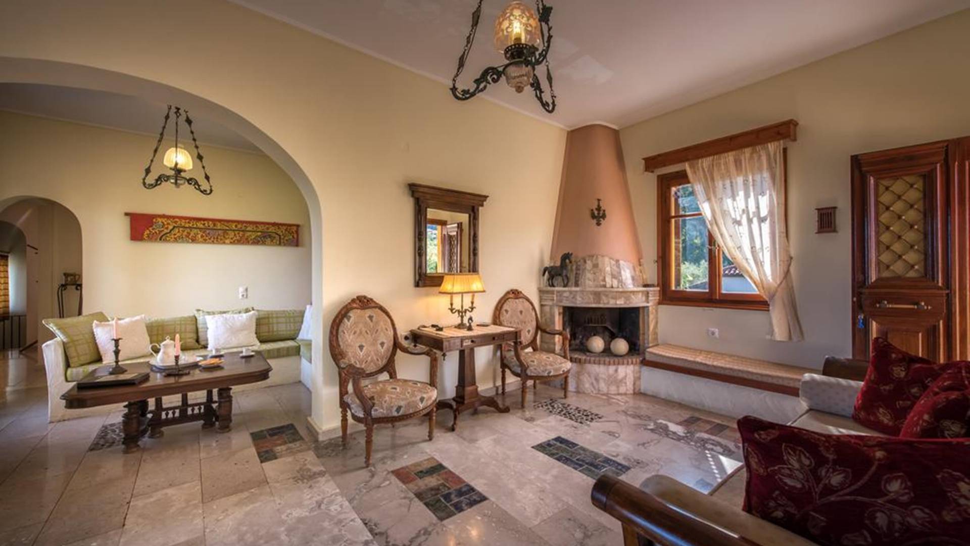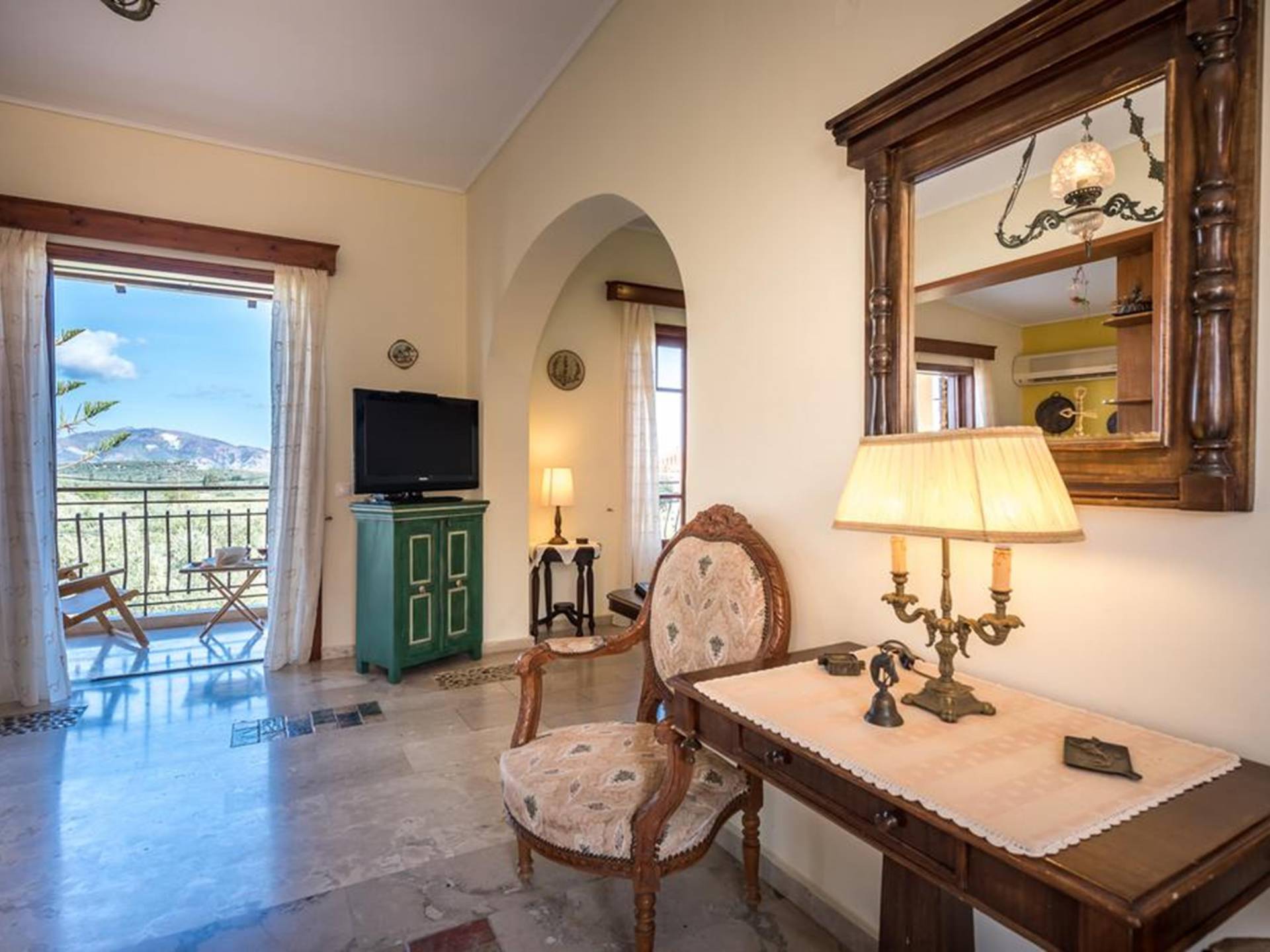 At the exterior grounds of which a 600m2 area is covered with lawn, are located the swimming pool and the patio with the characteristic traditional tile roof. The patio provides a fully equipped kitchen, a dining table, BBQ, and bathroom.