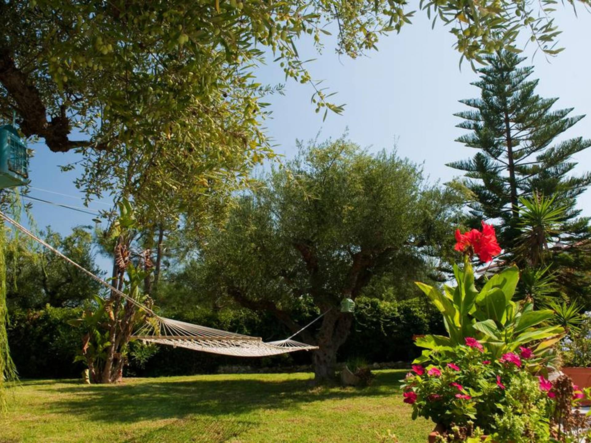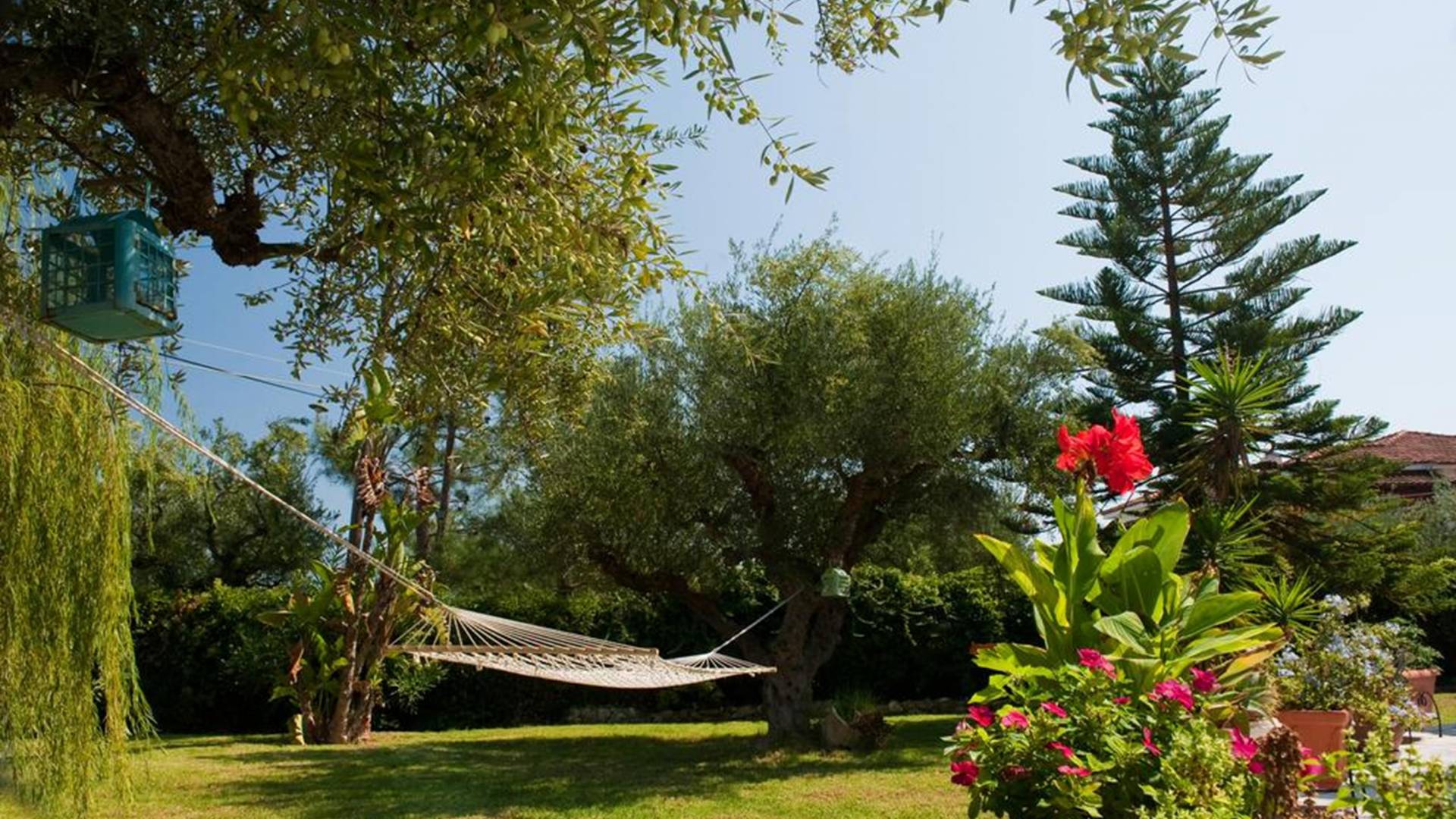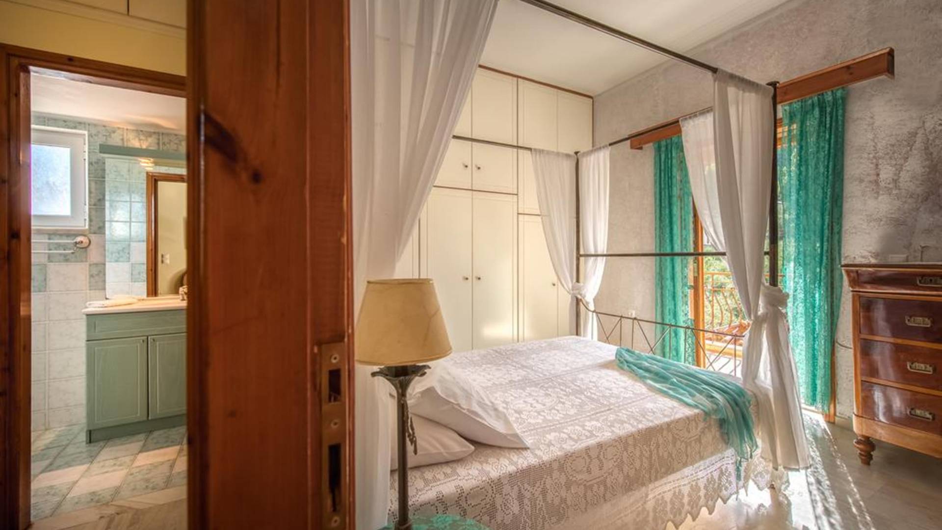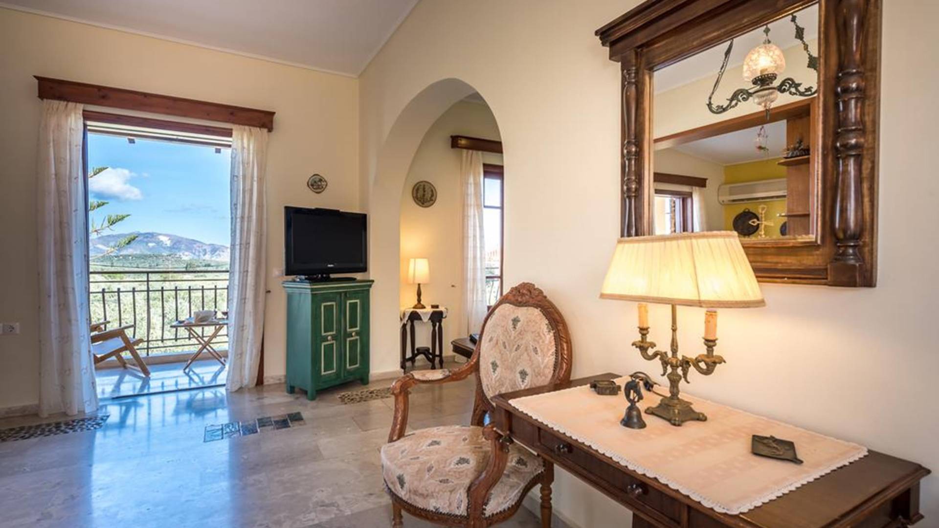 At the exterior grounds of which a 600m2 area is covered with lawn, are located the swimming pool and the patio with the characteristic traditional tile roof. The patio provides a fully equipped kitchen, a dining table, BBQ, and bathroom.