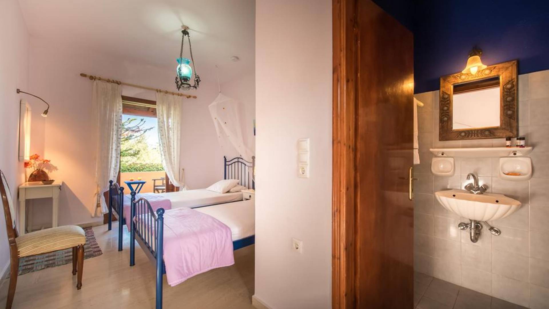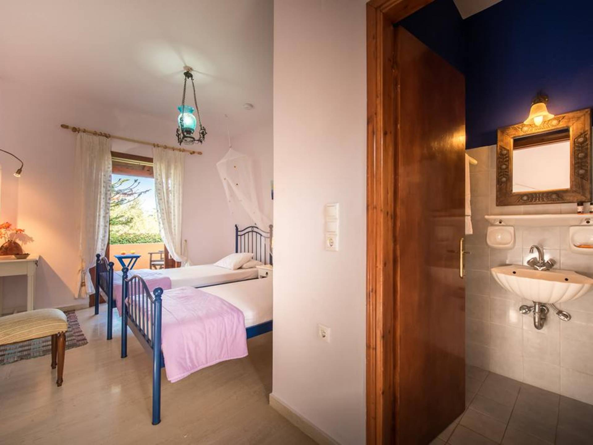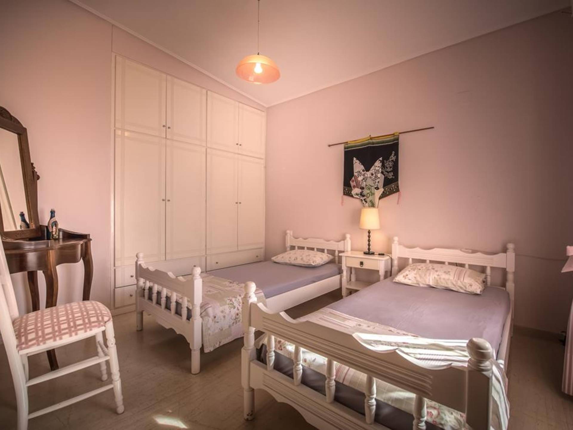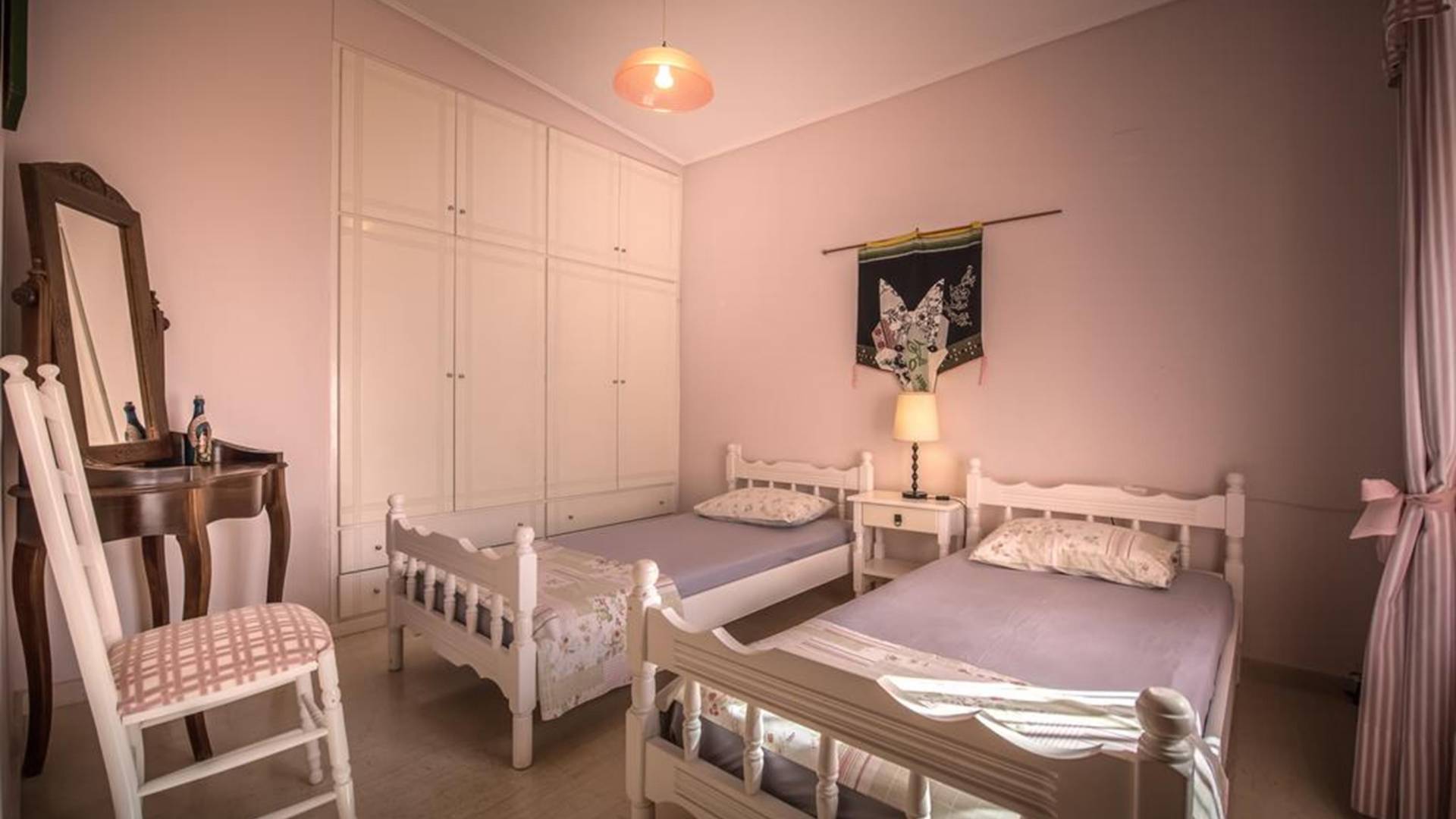 It is a traditional 2floor house with a large garden of 2,000m2, which is surrounded by thick greenery ensuring your privacy. On the 1st floor, there is a spacious living room with the dining room and the kitchen, 2 bedrooms, and 2 bathrooms. From the balcony, you can enjoy the marvelous view of Laganas bay. On the ground floor, there are 3 bedrooms and a playroom gym. They all have en-suite bathrooms, an independent entrance, and a balcony.