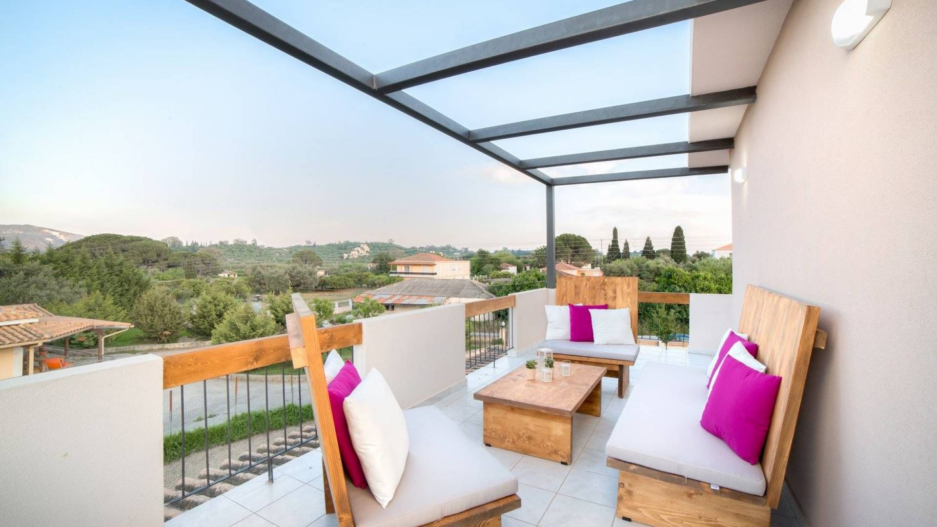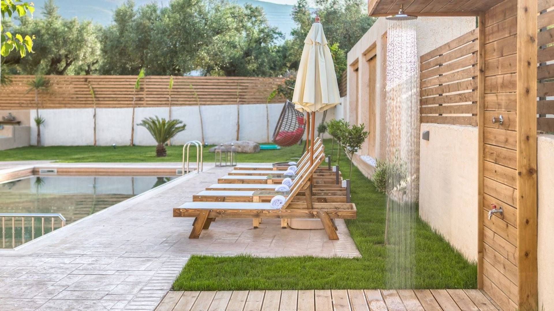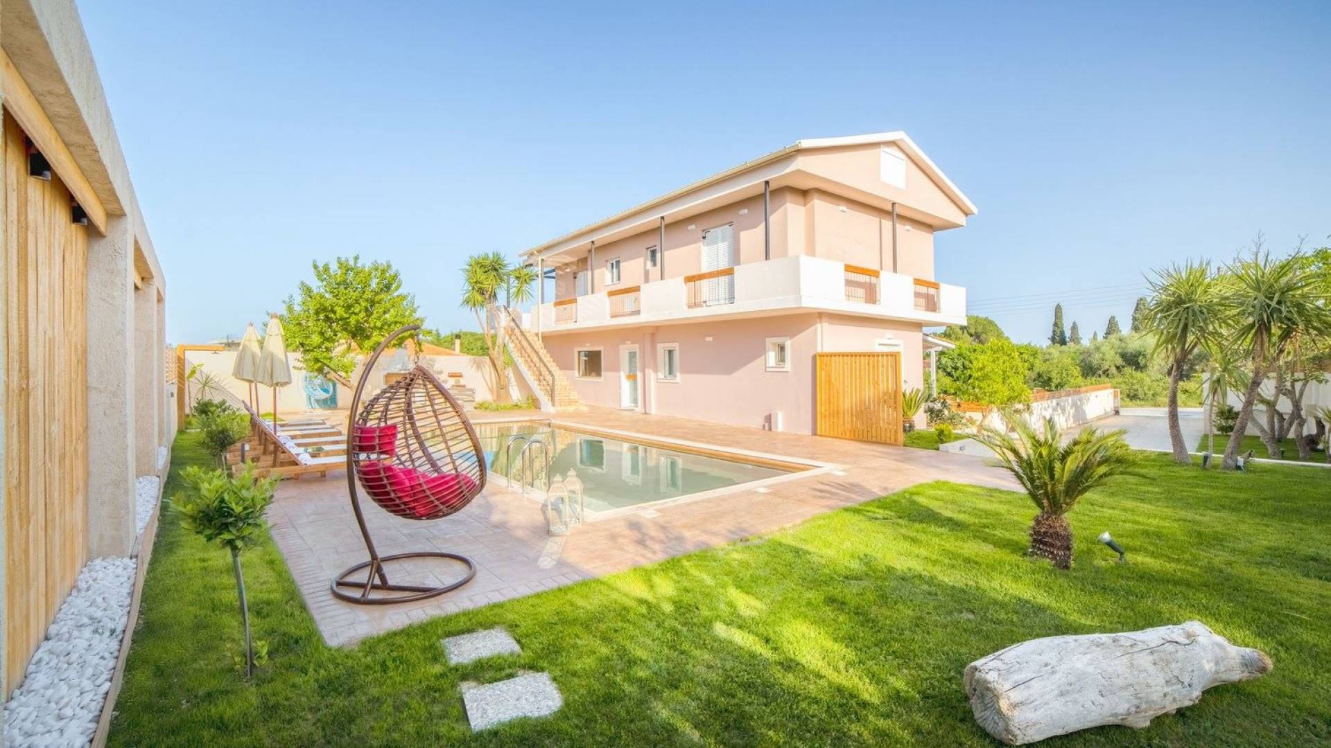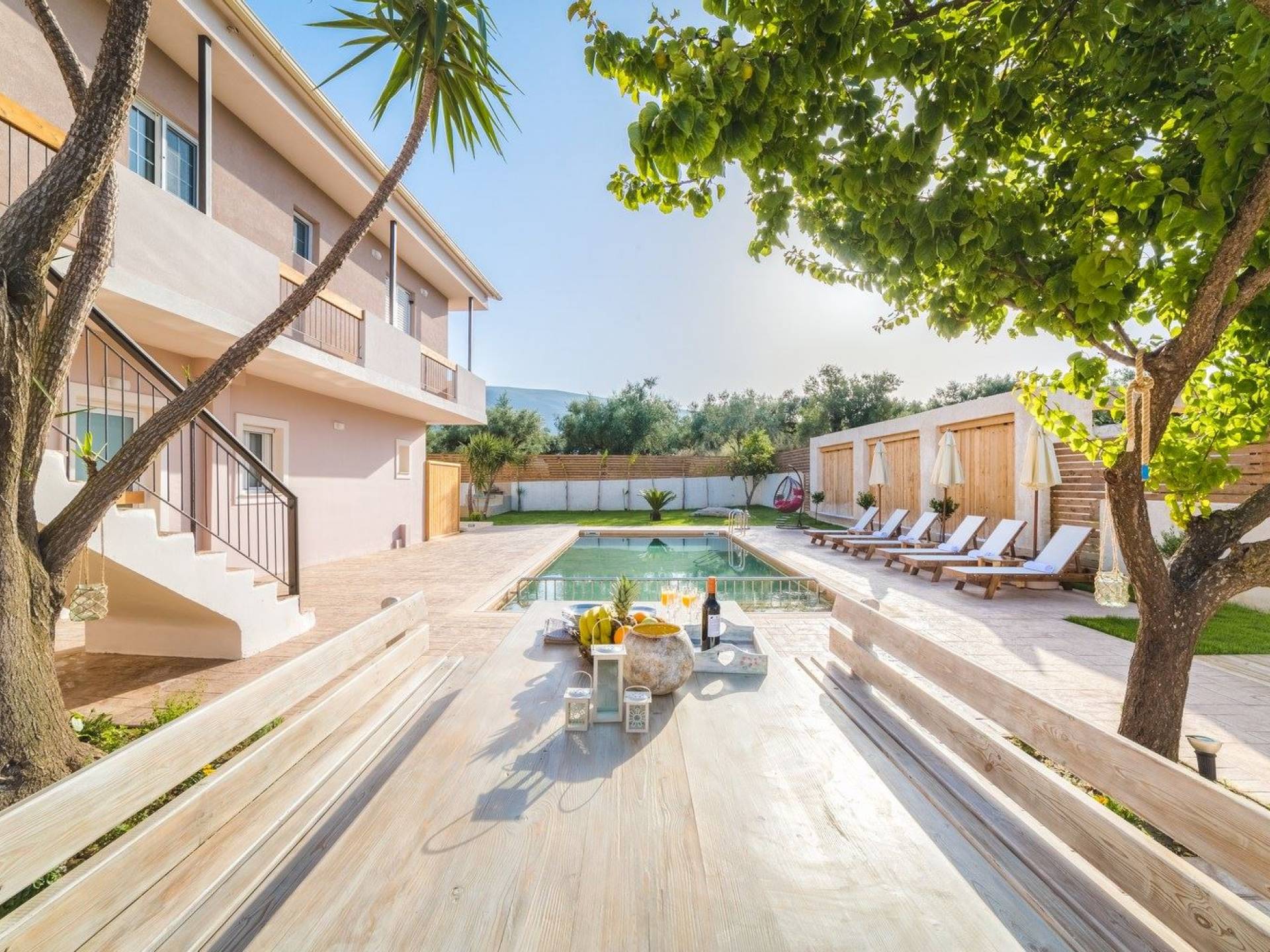 It features five bedrooms, 3 bathrooms, living room with dining area, kitchen, office room, private swimming pool with children’s pool, parking space, barbeque with dining table, and several outdoor sitting areas. It is a beautiful two-story maisonette with special care to detail and luxurious touches. You will find a rich welcome pack upon your arrival including fresh products from the garden. Each room has its own flat-screen satellite tv, luxurious linen, towels, bathrobes and slippers, wifi, and air-conditioning. The kitchen is fully equipped with all modern appliances including fridge, oven/stove, coffee machine, electric kettle, toaster, and microwave. Spacious balconies around the villa are perfect setting for summer evenings with family and friends, overlooking the charming gardens and the serene landscape.