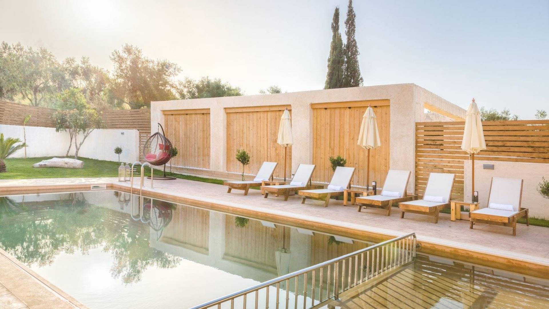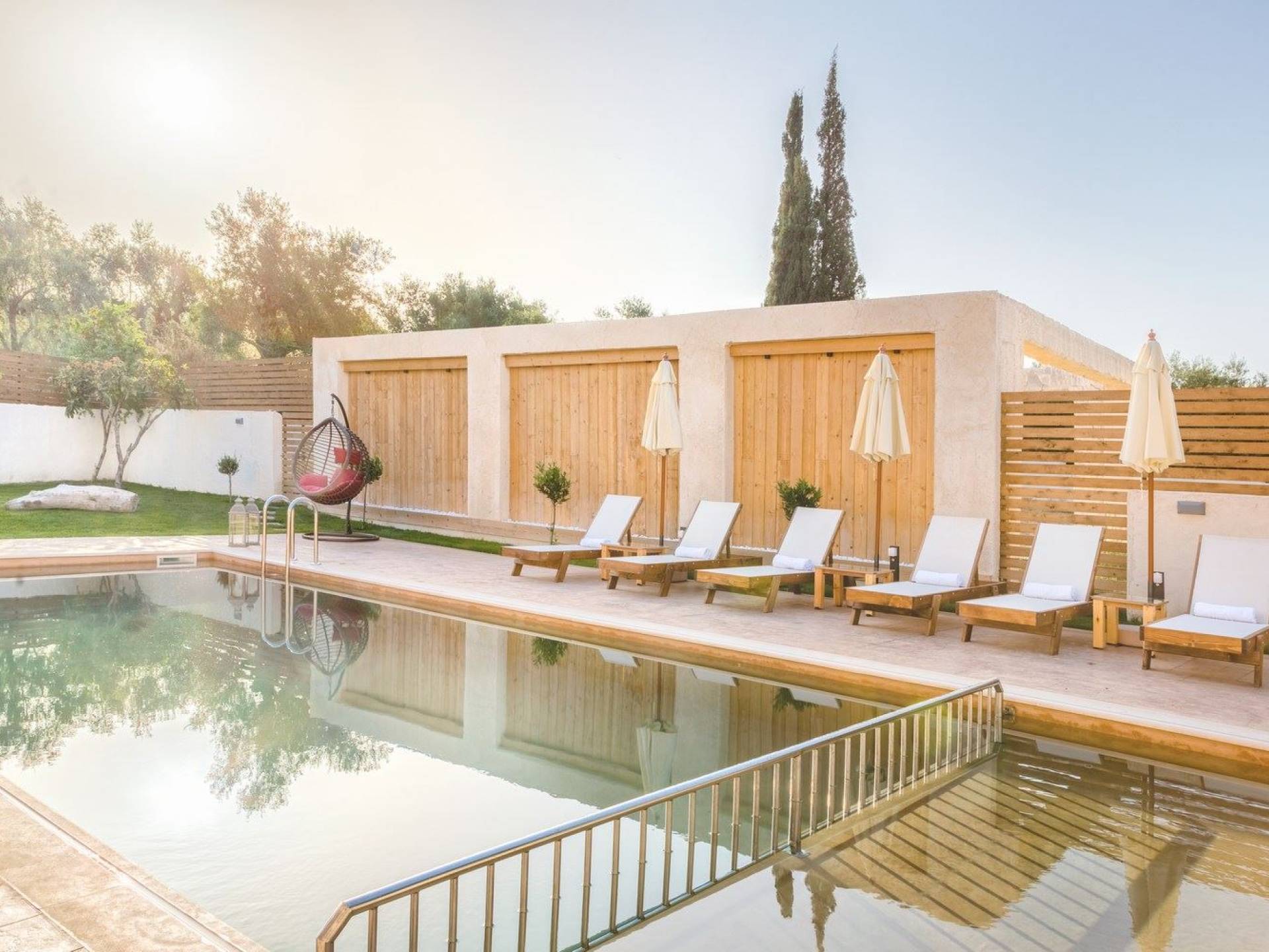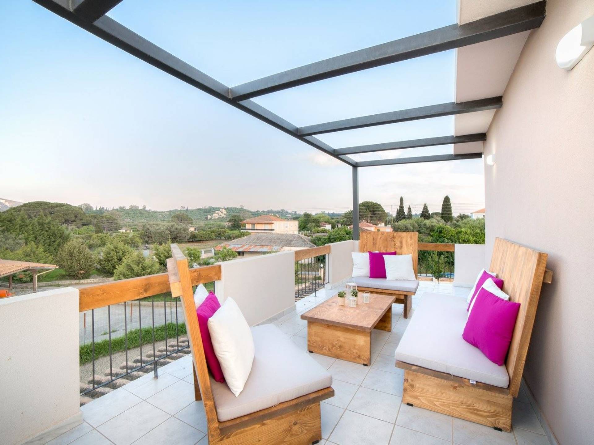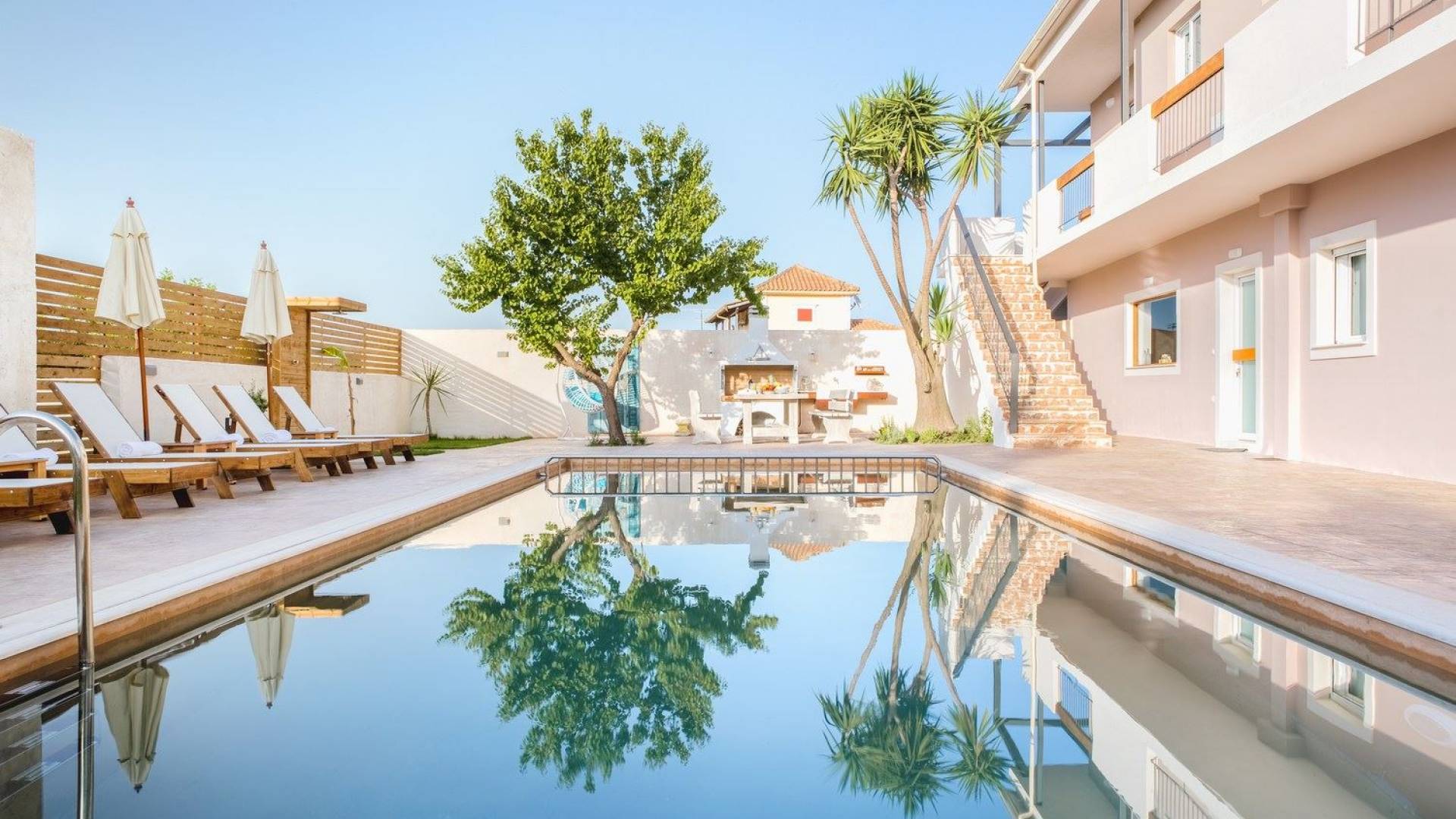 It features five bedrooms, 3 bathrooms, living room with dining area, kitchen, office room, private swimming pool with children’s pool, parking space, barbeque with dining table, and several outdoor sitting areas. It is a beautiful two-story maisonette with special care to detail and luxurious touches. You will find a rich welcome pack upon your arrival including fresh products from the garden. Each room has its own flat-screen satellite tv, luxurious linen, towels, bathrobes and slippers, wifi, and air-conditioning. The kitchen is fully equipped with all modern appliances including fridge, oven/stove, coffee machine, electric kettle, toaster, and microwave. Spacious balconies around the villa are perfect setting for summer evenings with family and friends, overlooking the charming gardens and the serene landscape.