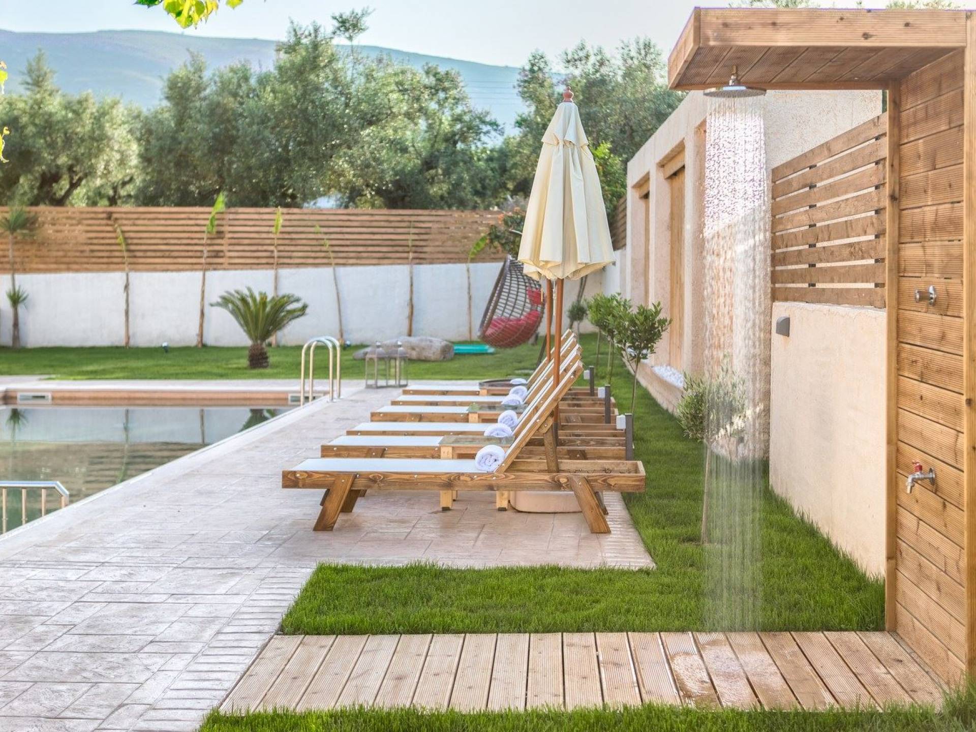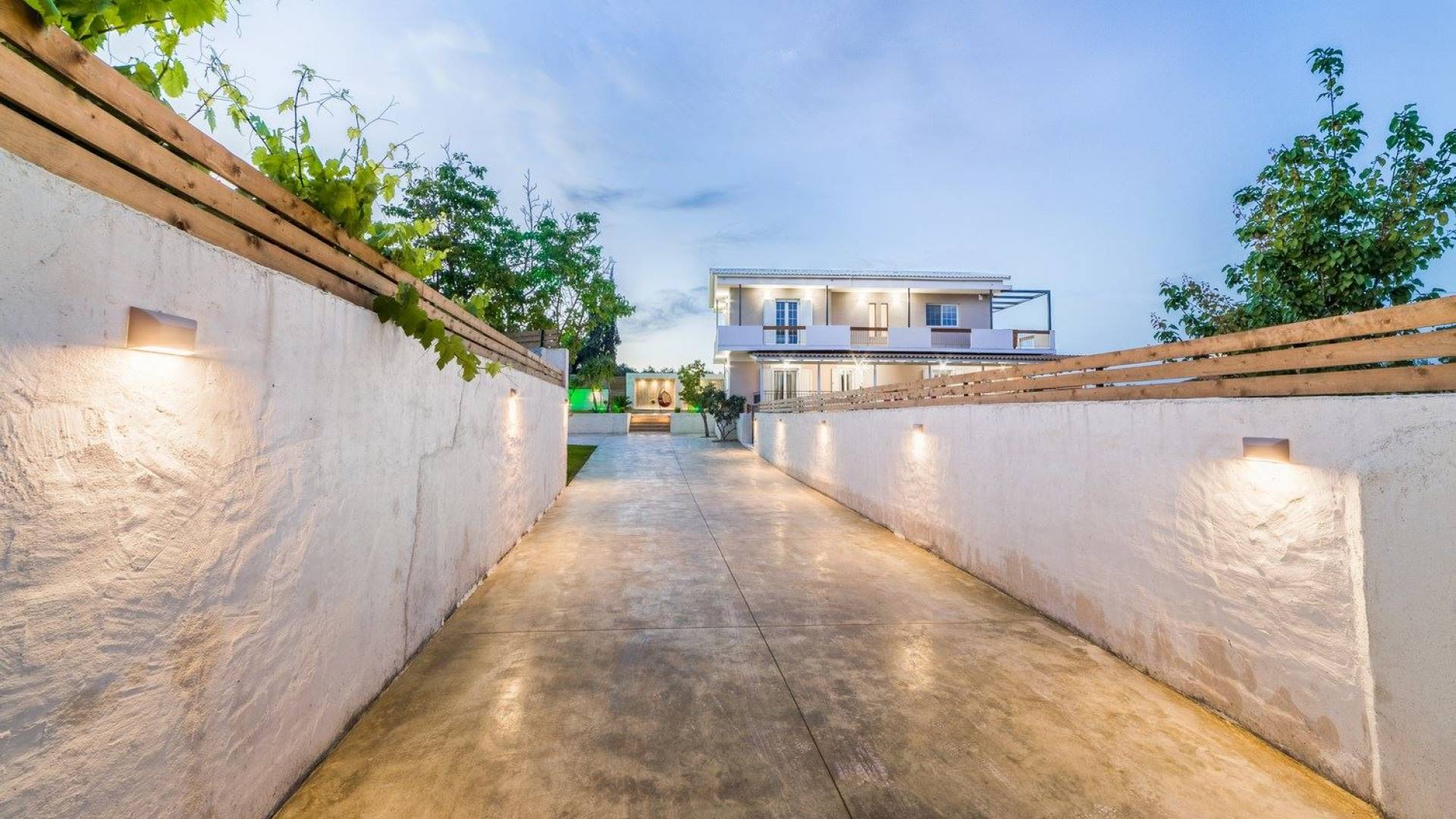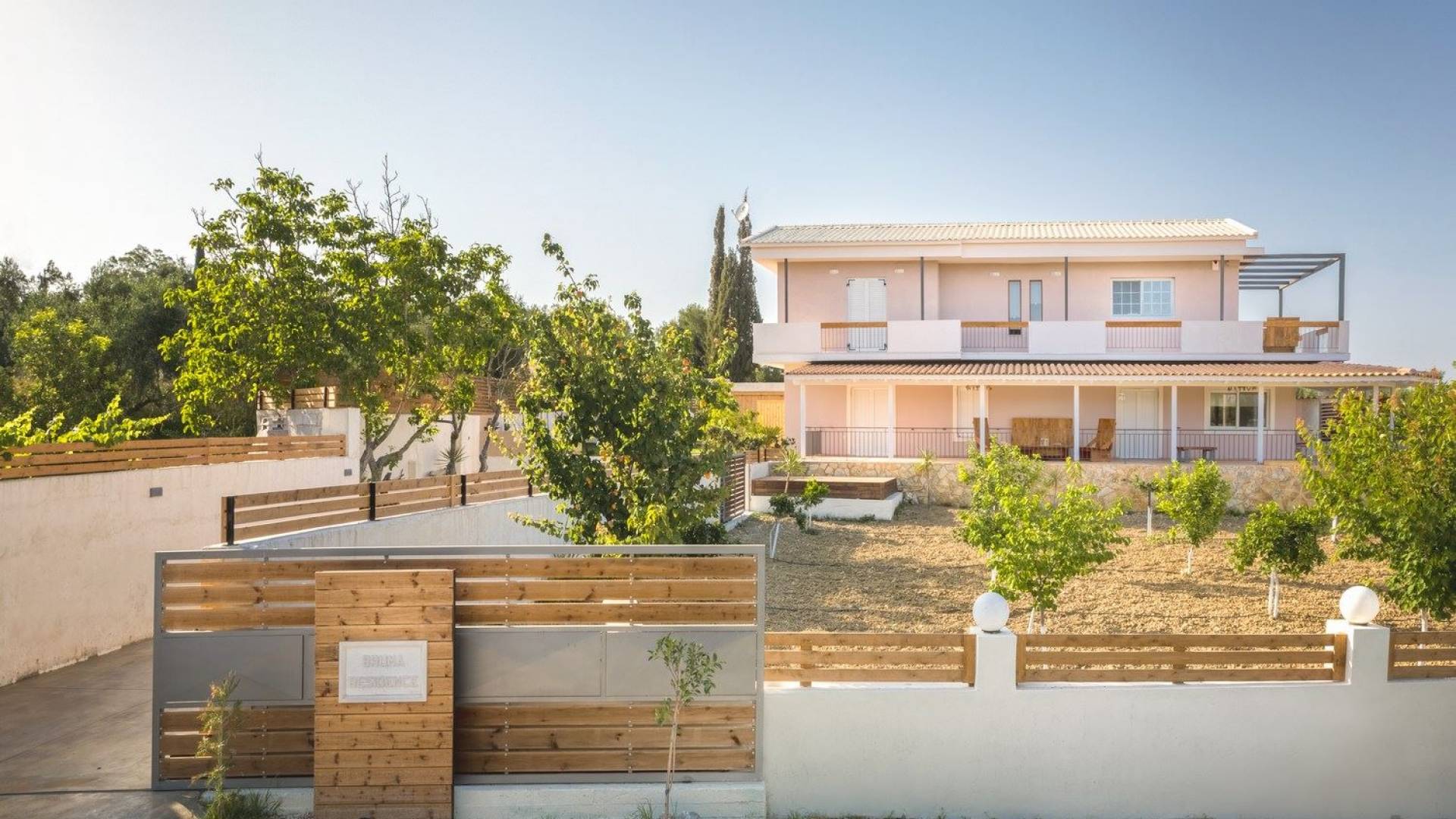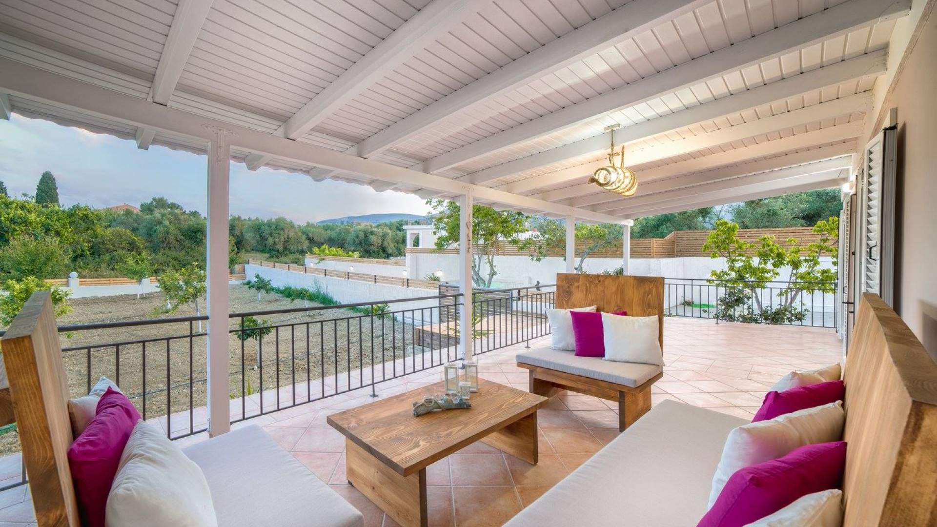 It features five bedrooms, 3 bathrooms, living room with dining area, kitchen, office room, private swimming pool with children’s pool, parking space, barbeque with dining table, and several outdoor sitting areas. It is a beautiful two-story maisonette with special care to detail and luxurious touches. You will find a rich welcome pack upon your arrival including fresh products from the garden. Each room has its own flat-screen satellite tv, luxurious linen, towels, bathrobes and slippers, wifi, and air-conditioning. The kitchen is fully equipped with all modern appliances including fridge, oven/stove, coffee machine, electric kettle, toaster, and microwave. Spacious balconies around the villa are perfect setting for summer evenings with family and friends, overlooking the charming gardens and the serene landscape.