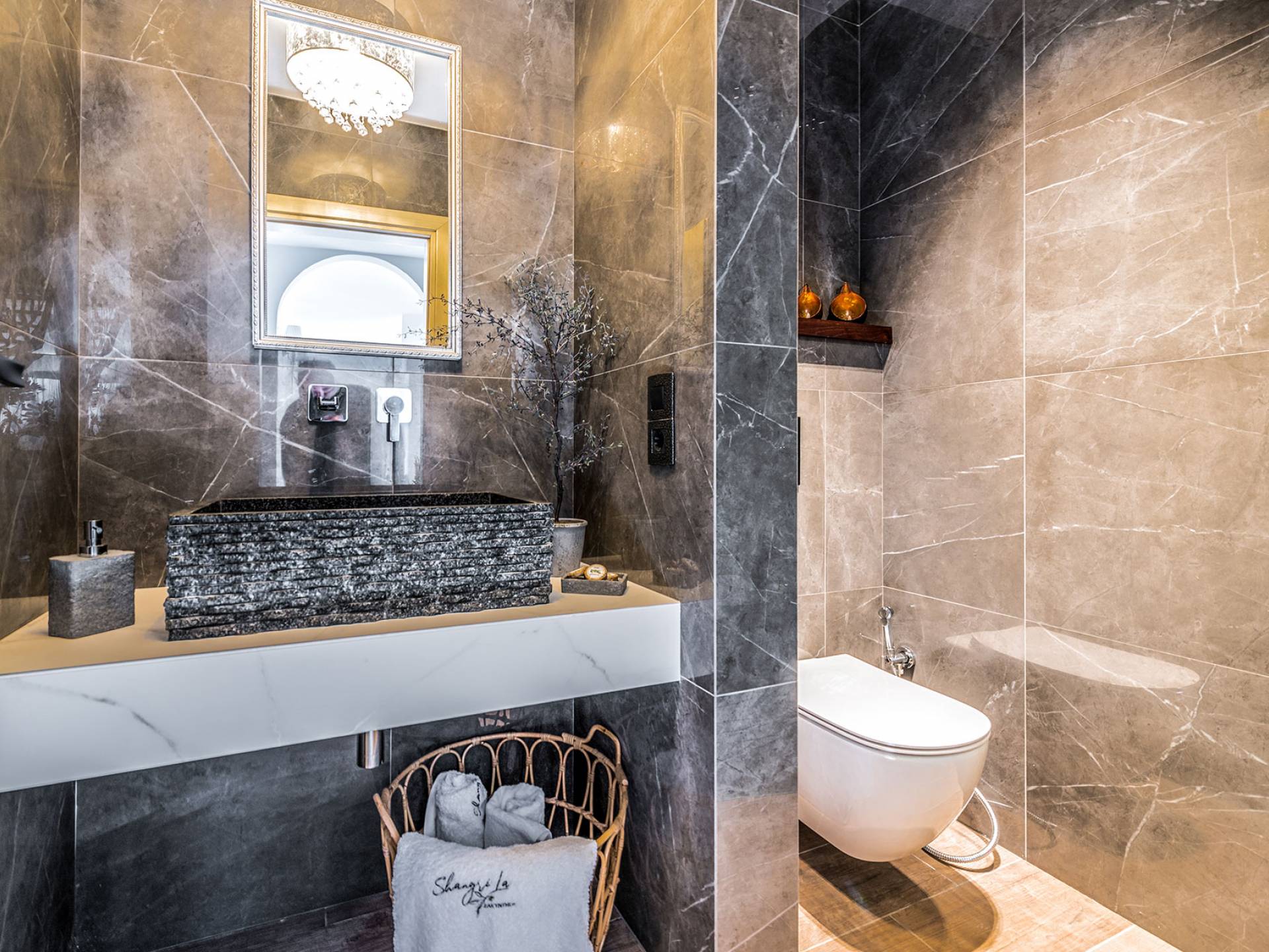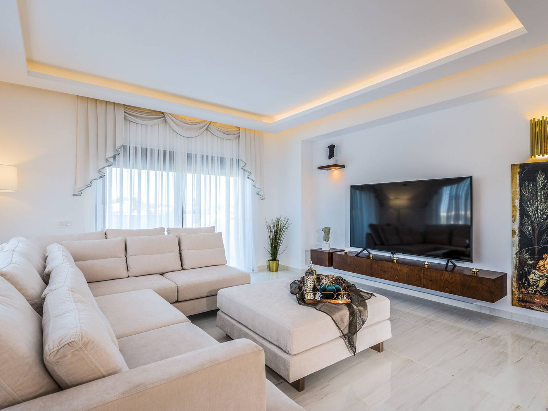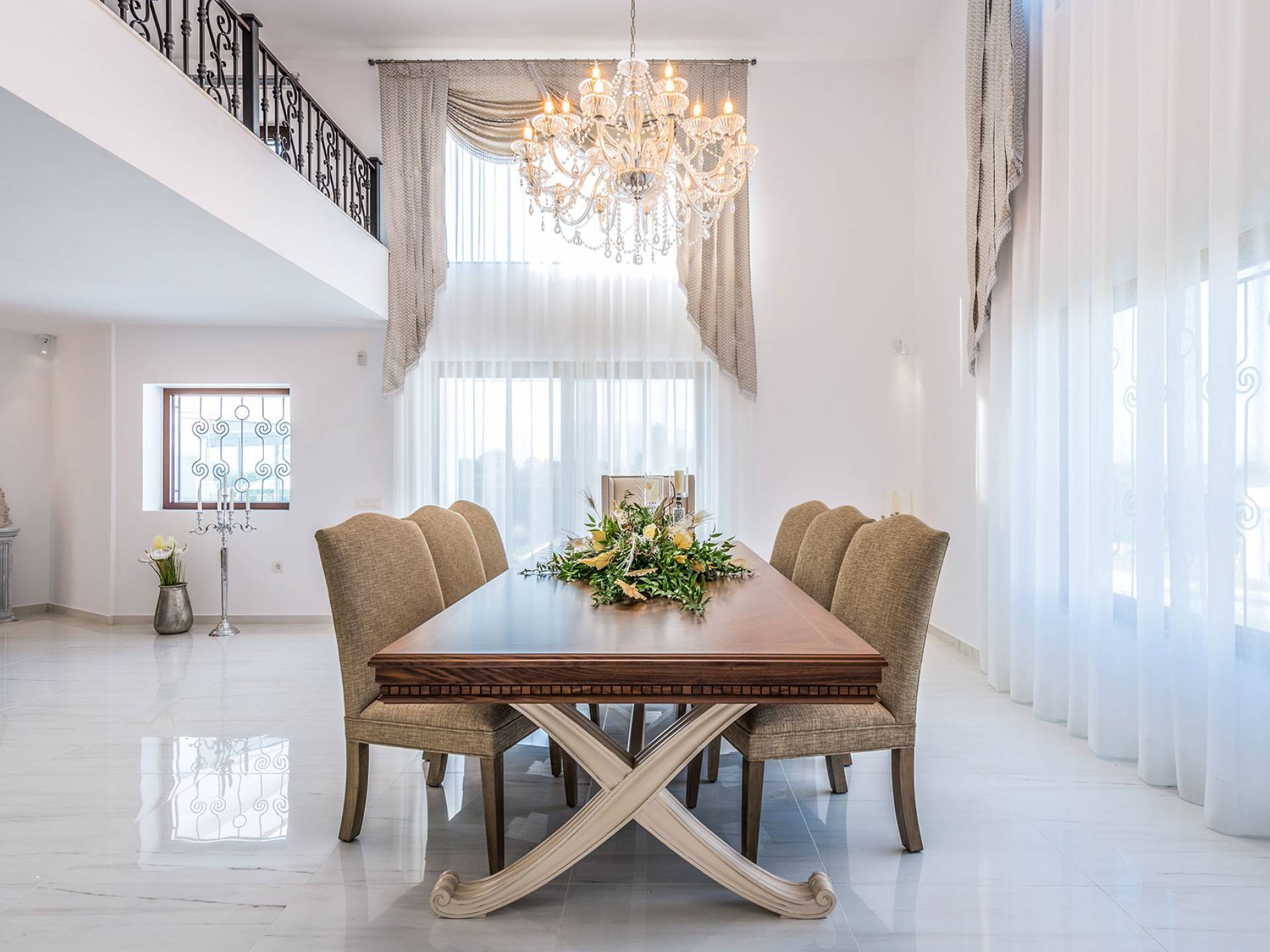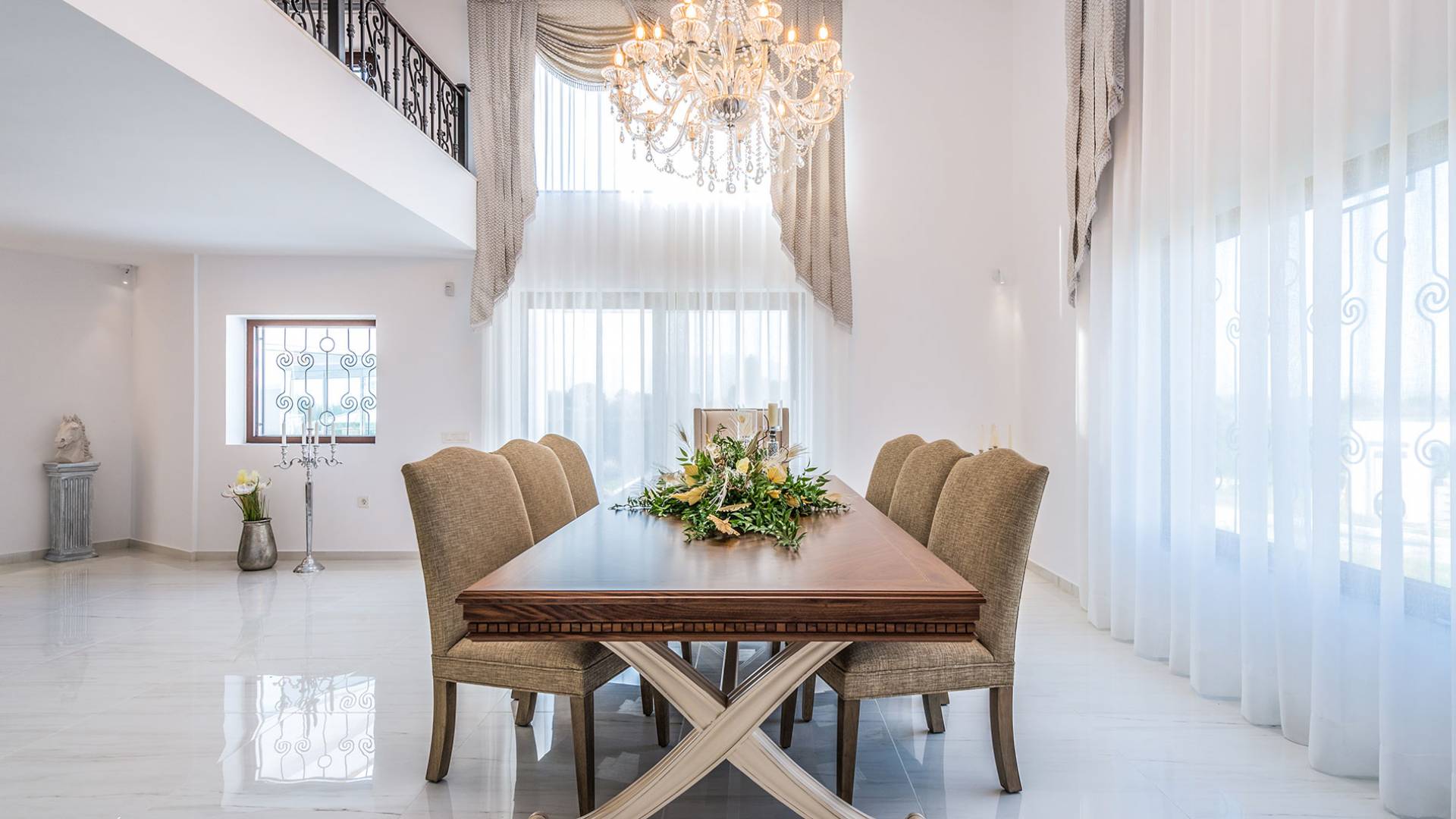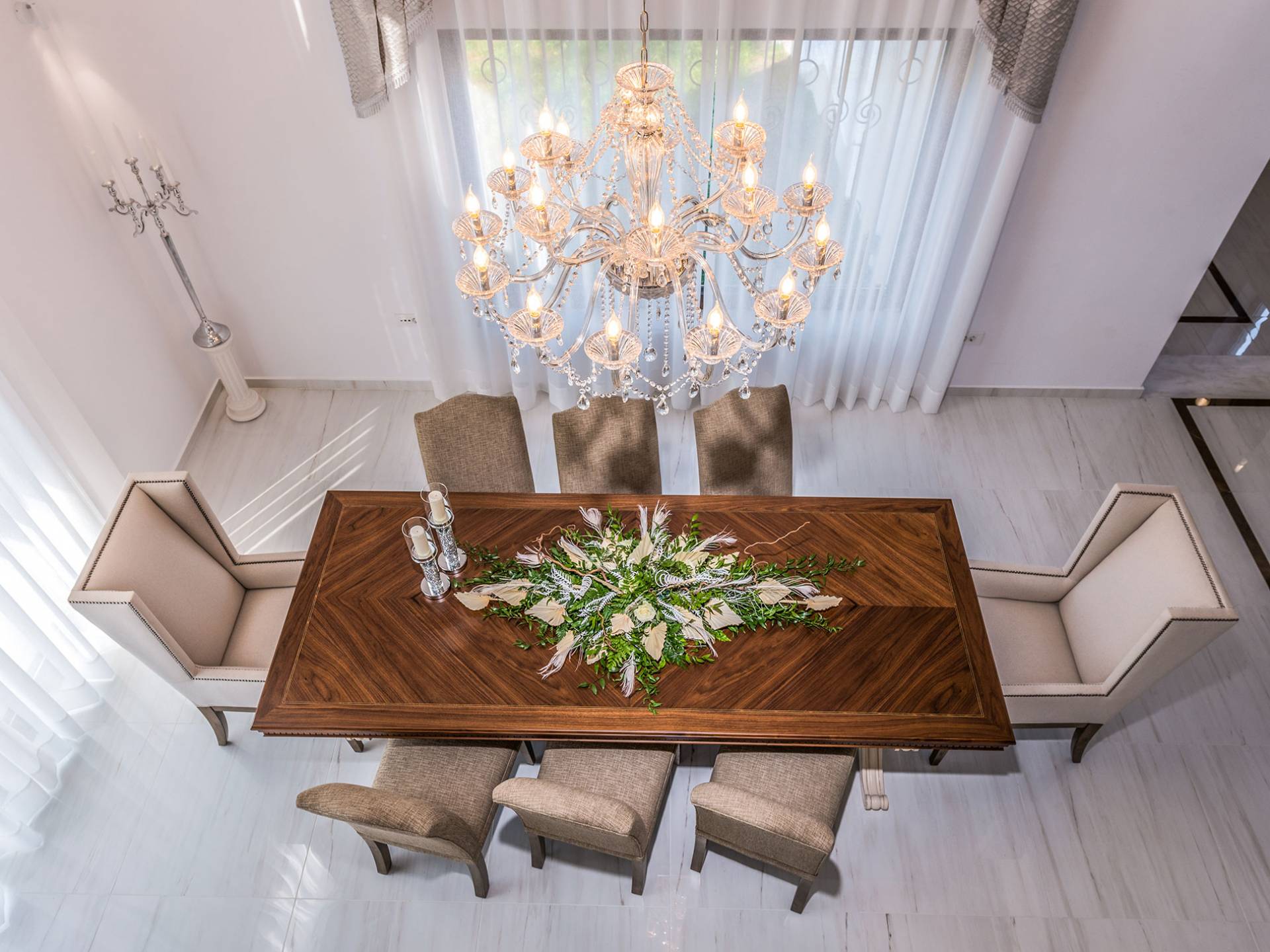 The ground floor of Villa Shangri-La features a grand dining area, which can accommodate the curious palates of 10 guests, and a spacious kitchen, fully equipped with 2 ovens, a microwave, induction hot plates, and kitchenware, while its illuminant glass partition overlooks the stunning BBQ area. Adjacent there is a commodious, modern sitting area with a comfortable couch and a 75 inch Samsung smart, satellite TV, ideal for relaxing moments.