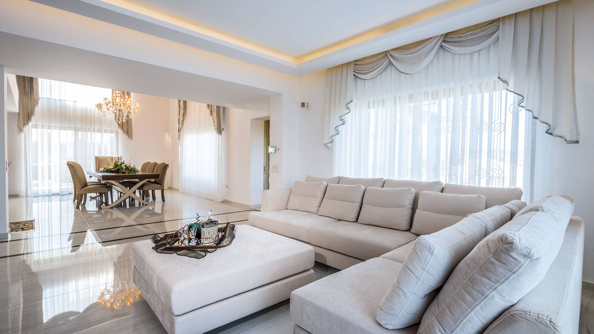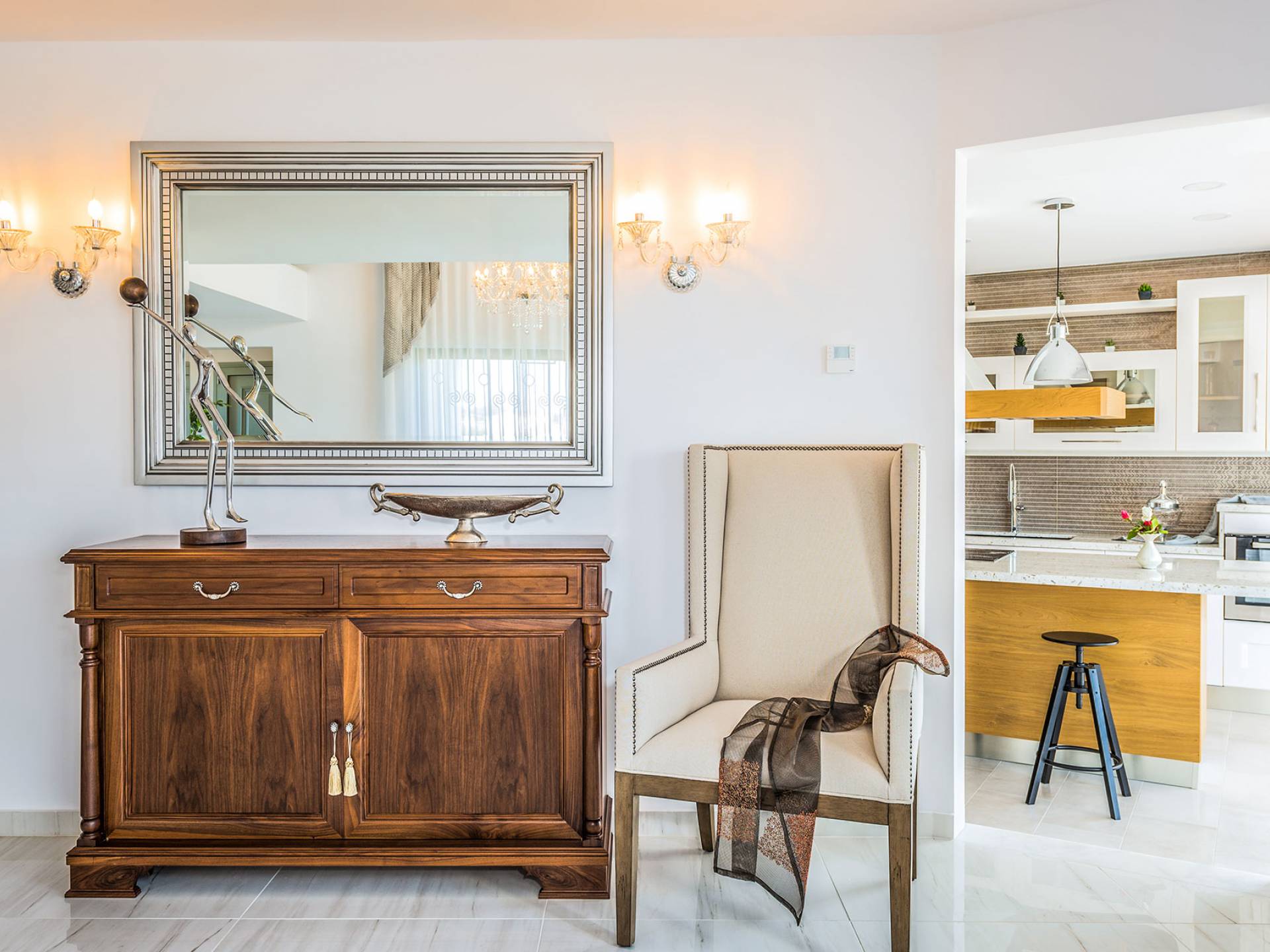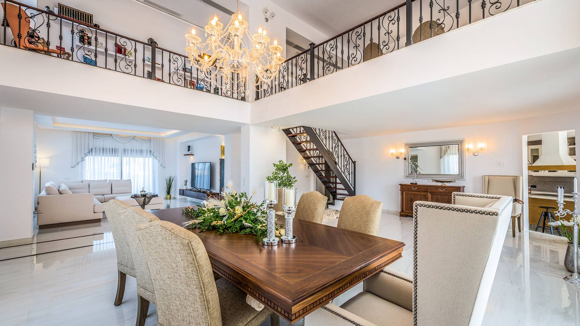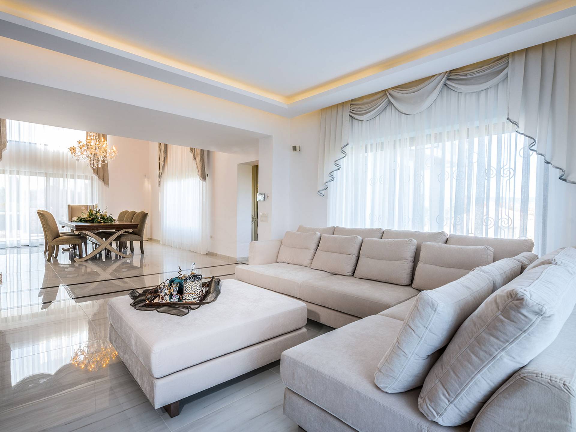 The ground floor of Villa Shangri-La features a grand dining area, which can accommodate the curious palates of 10 guests, and a spacious kitchen, fully equipped with 2 ovens, a microwave, induction hot plates, and kitchenware, while its illuminant glass partition overlooks the stunning BBQ area. Adjacent there is a commodious, modern sitting area with a comfortable couch and a 75 inch Samsung smart, satellite TV, ideal for relaxing moments.