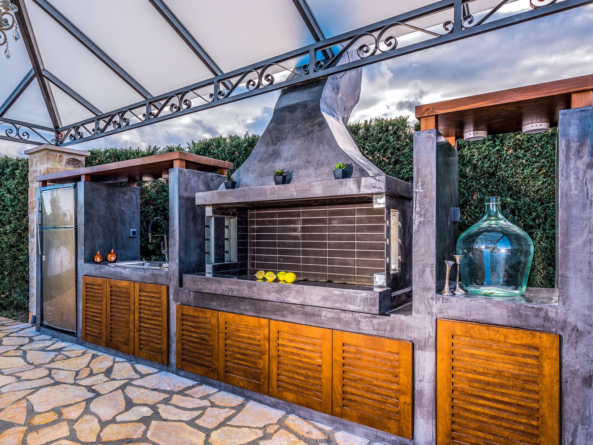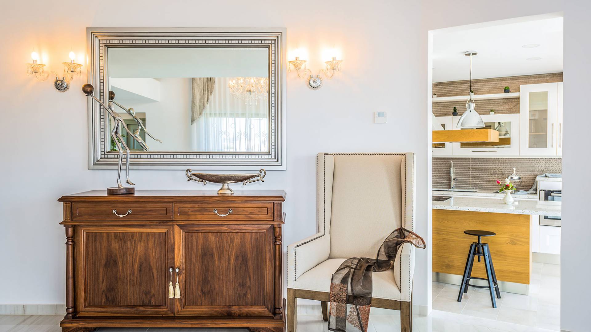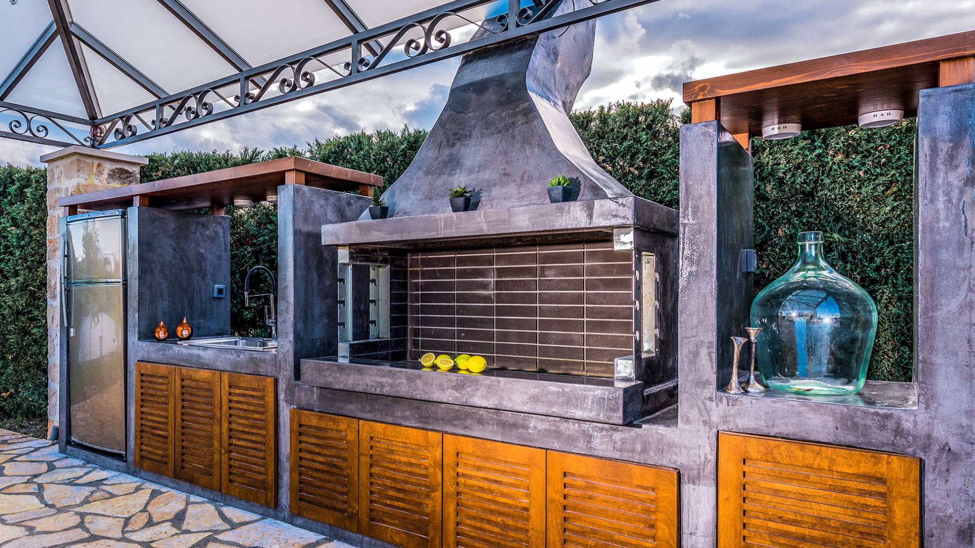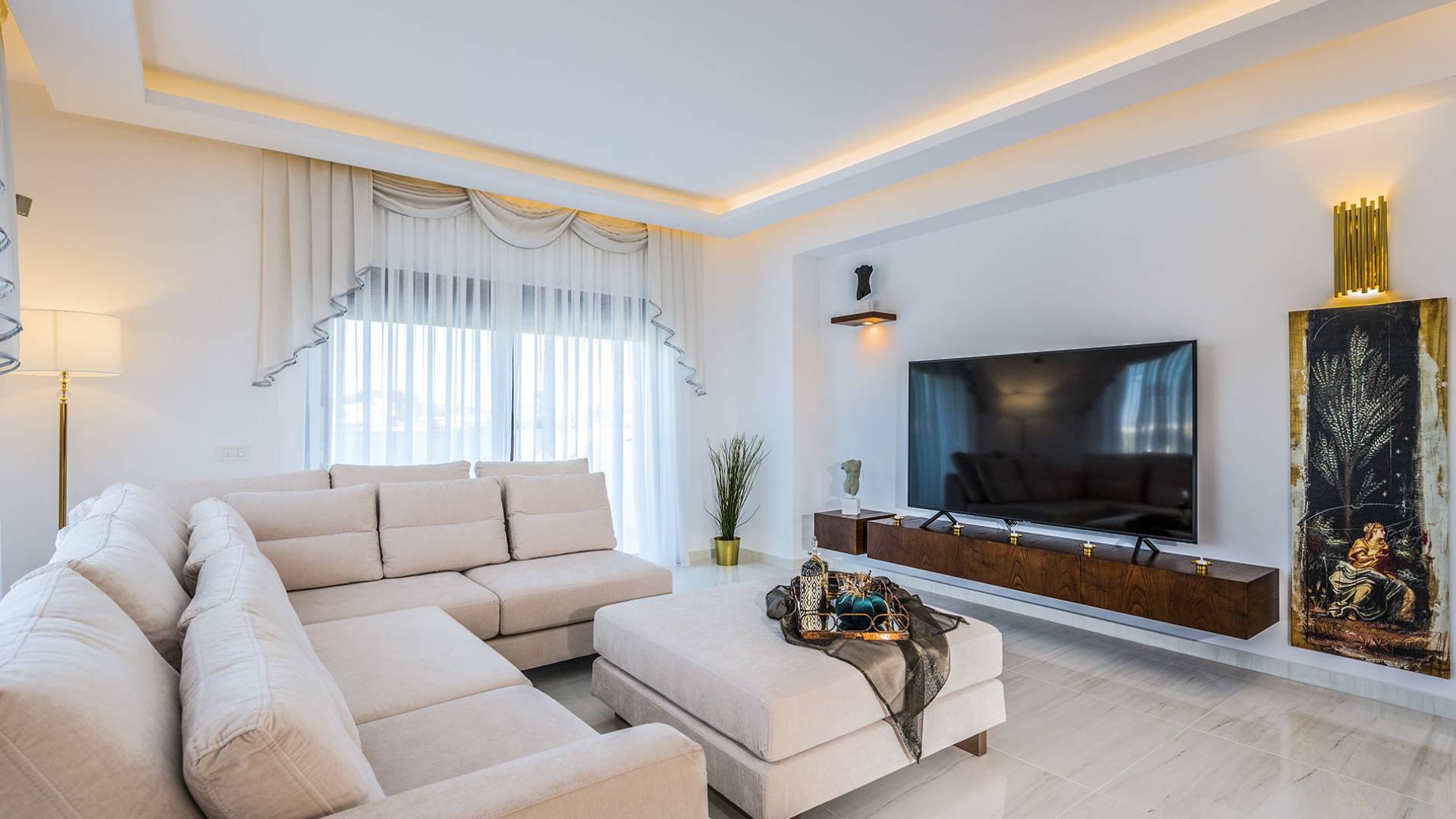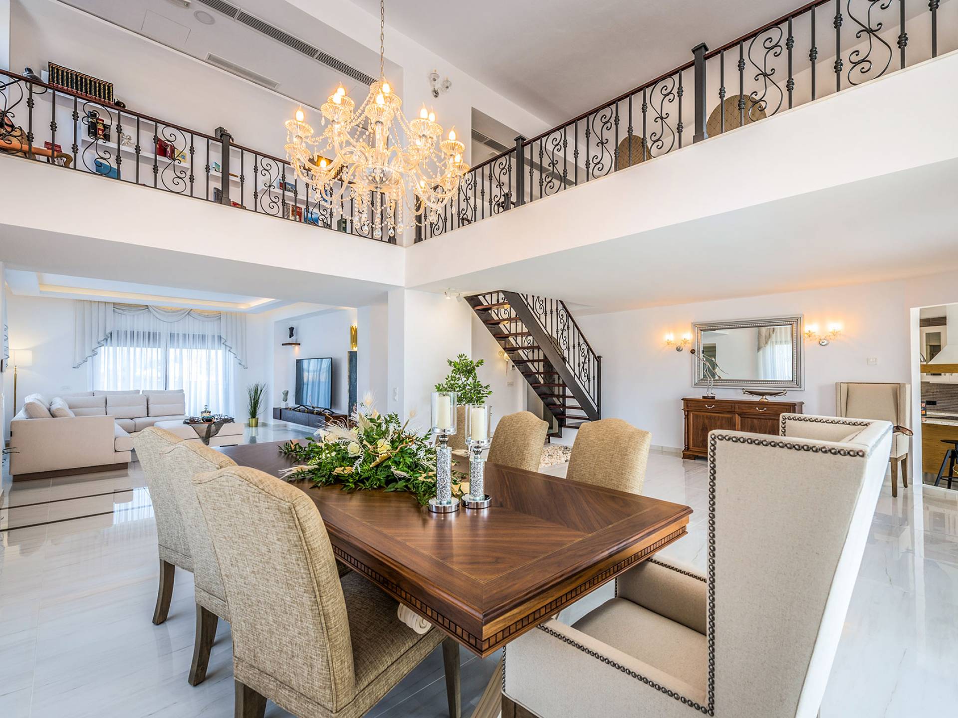 The ground floor of Villa Shangri-La features a grand dining area, which can accommodate the curious palates of 10 guests, and a spacious kitchen, fully equipped with 2 ovens, a microwave, induction hot plates, and kitchenware, while its illuminant glass partition overlooks the stunning BBQ area. Adjacent there is a commodious, modern sitting area with a comfortable couch and a 75 inch Samsung smart, satellite TV, ideal for relaxing moments.