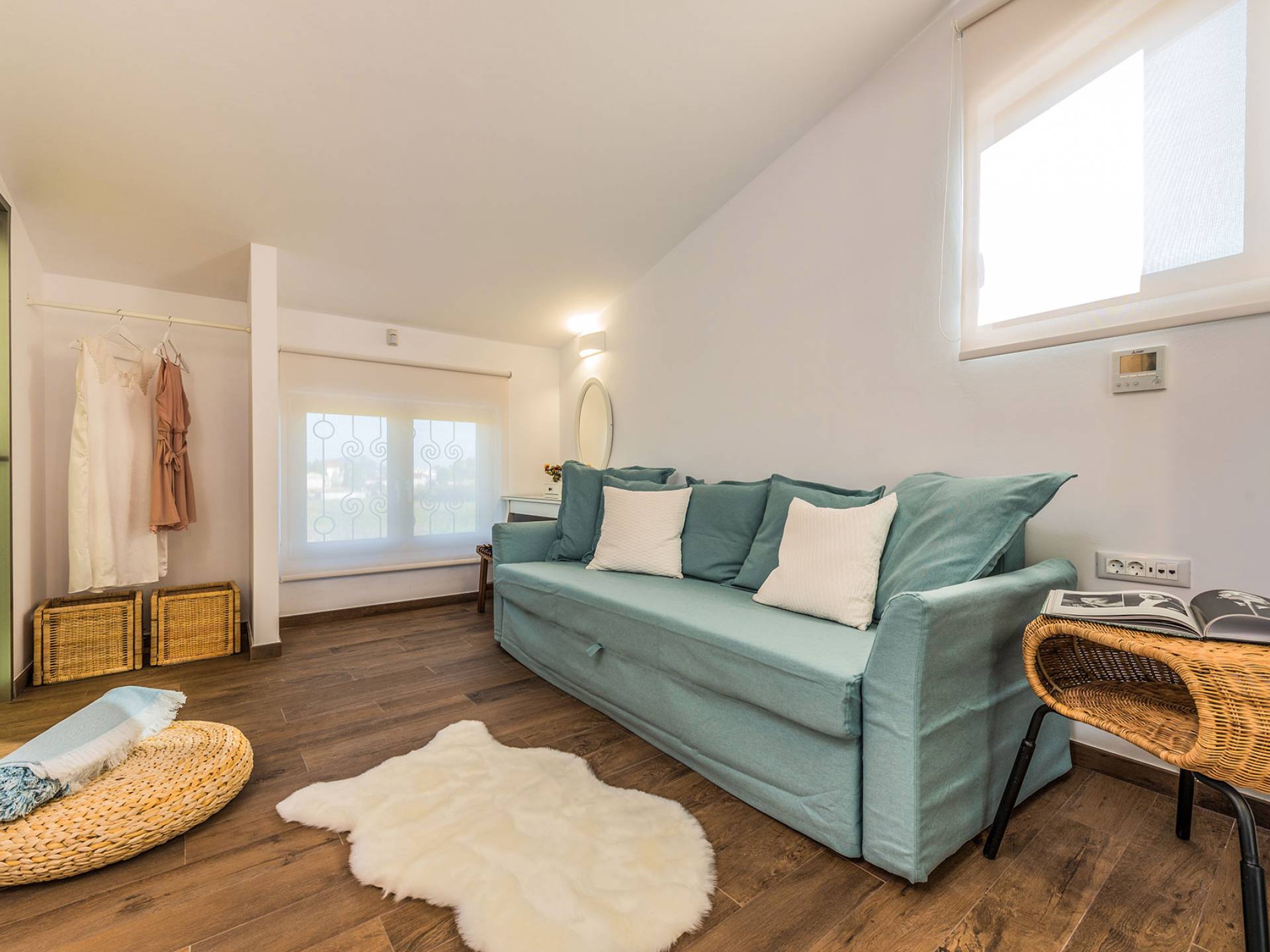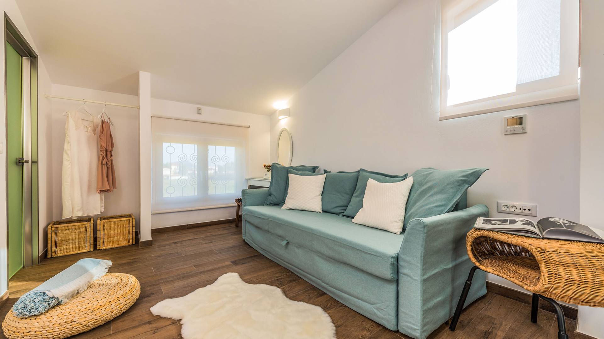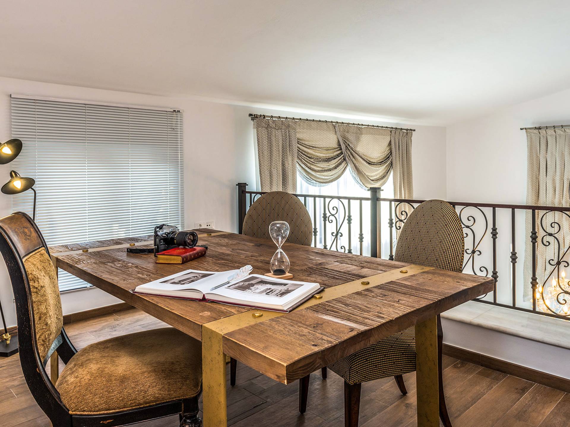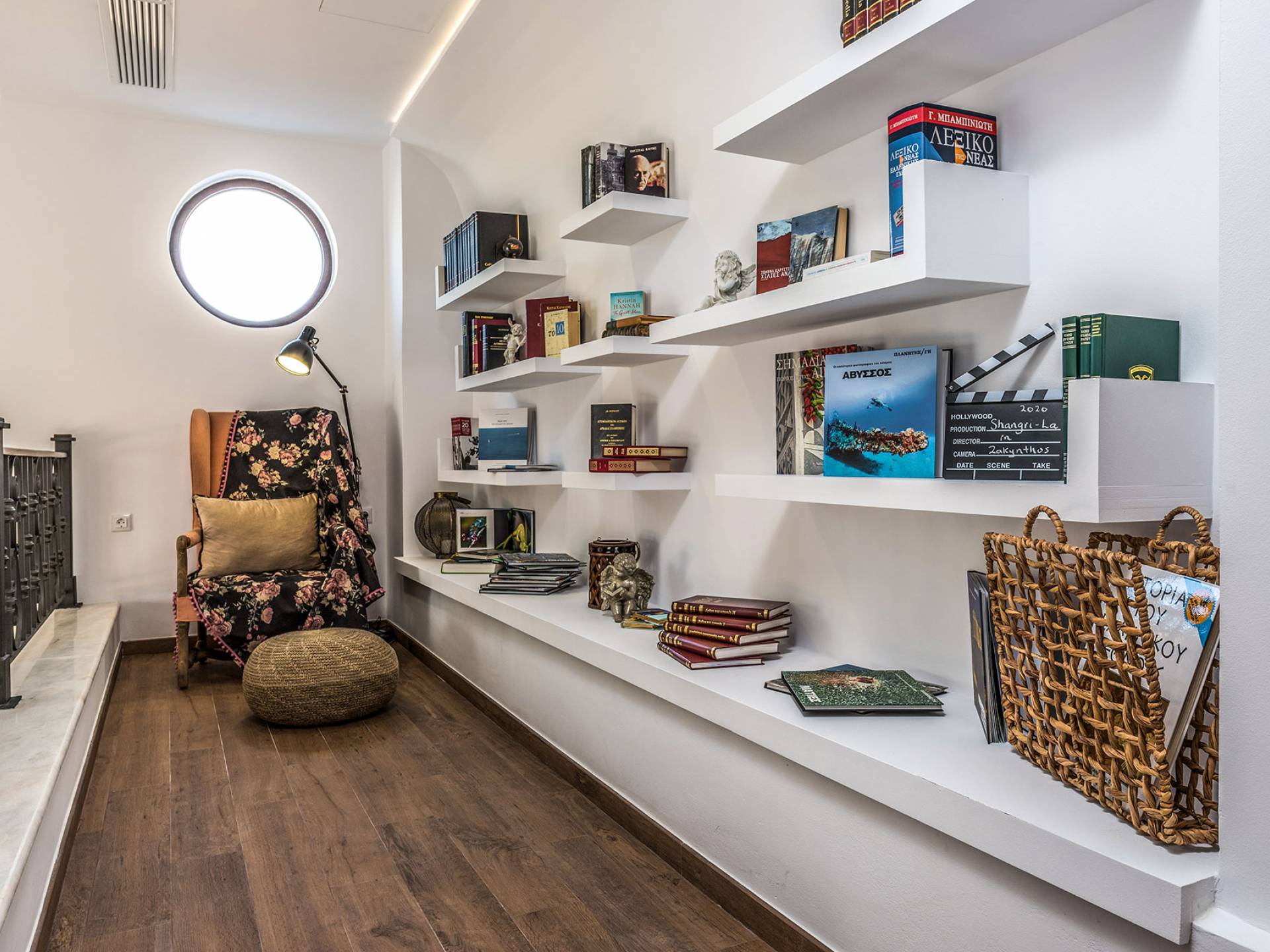 On the first floor, there is a roomy mezzanine office equipped with a sophisticated computer and a printer for any business arrangements our guests wish to take care of. There is also an extra king-size bedroom, a sofa-bed and a TV in the sitting area, as well as a reading area and a library ideal for relaxing moments accompanied by a good read that can make everyone feel at ease