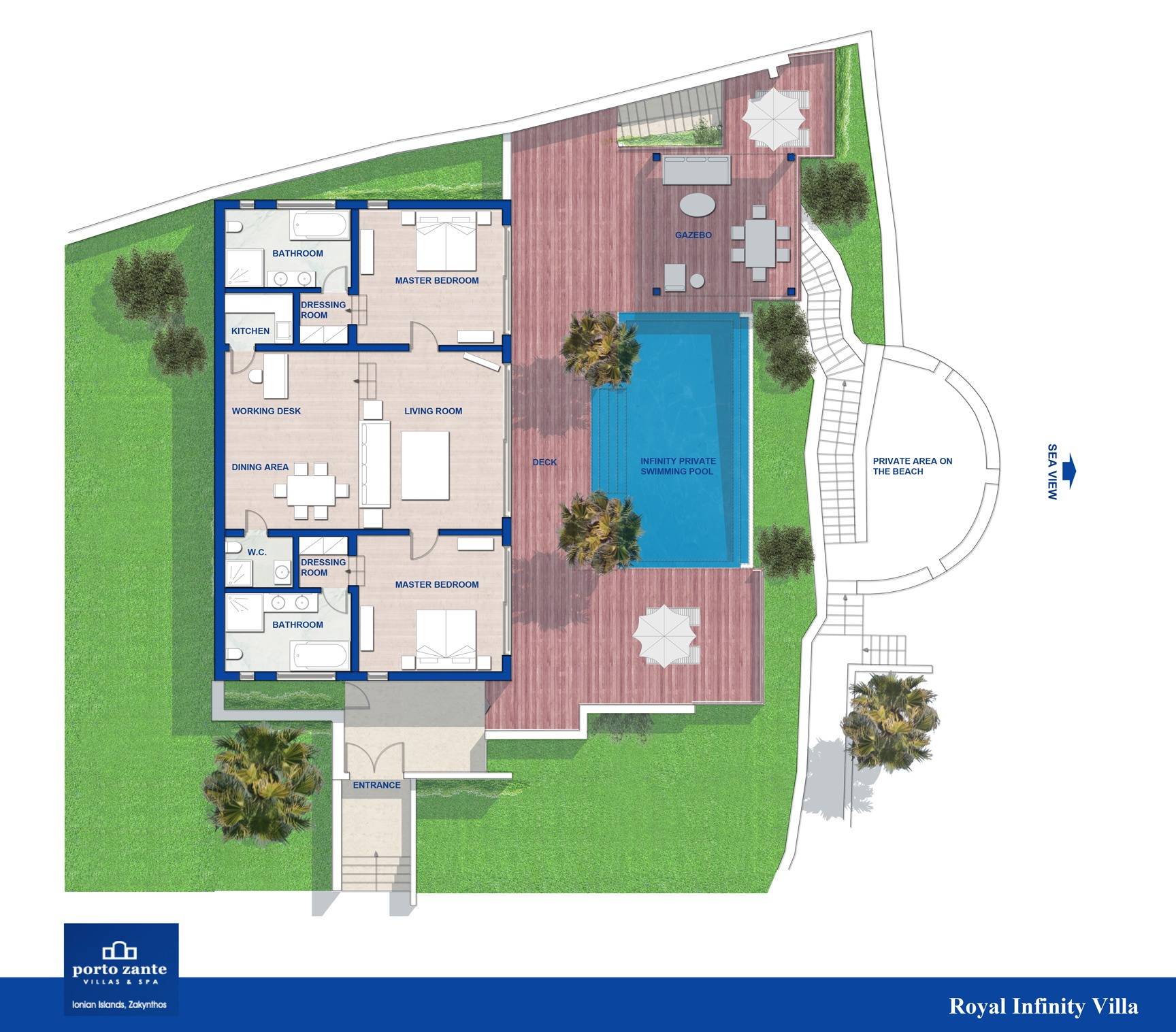 The exclusive beachfront Royal Infinity Villa at Porto Zante Villas comprises an entrance hall, two master bedrooms with king-size beds, two walk-in dressing rooms, a large luxuriously decorated living area that can be converted into a sleeping area, three antique Dionysian marble bathrooms, two Jacuzzis, a personal working desk with and iMac Desktop, and a small kitchen. From your villa's private pool, private stairs lead you directly to the private sandy beach of the resort. A home of opulence and serenity, this majestic villa in Greece defines refined contemporary aesthetic and offers a perfect combination of seclusion and 24-hour five-star hotel services.