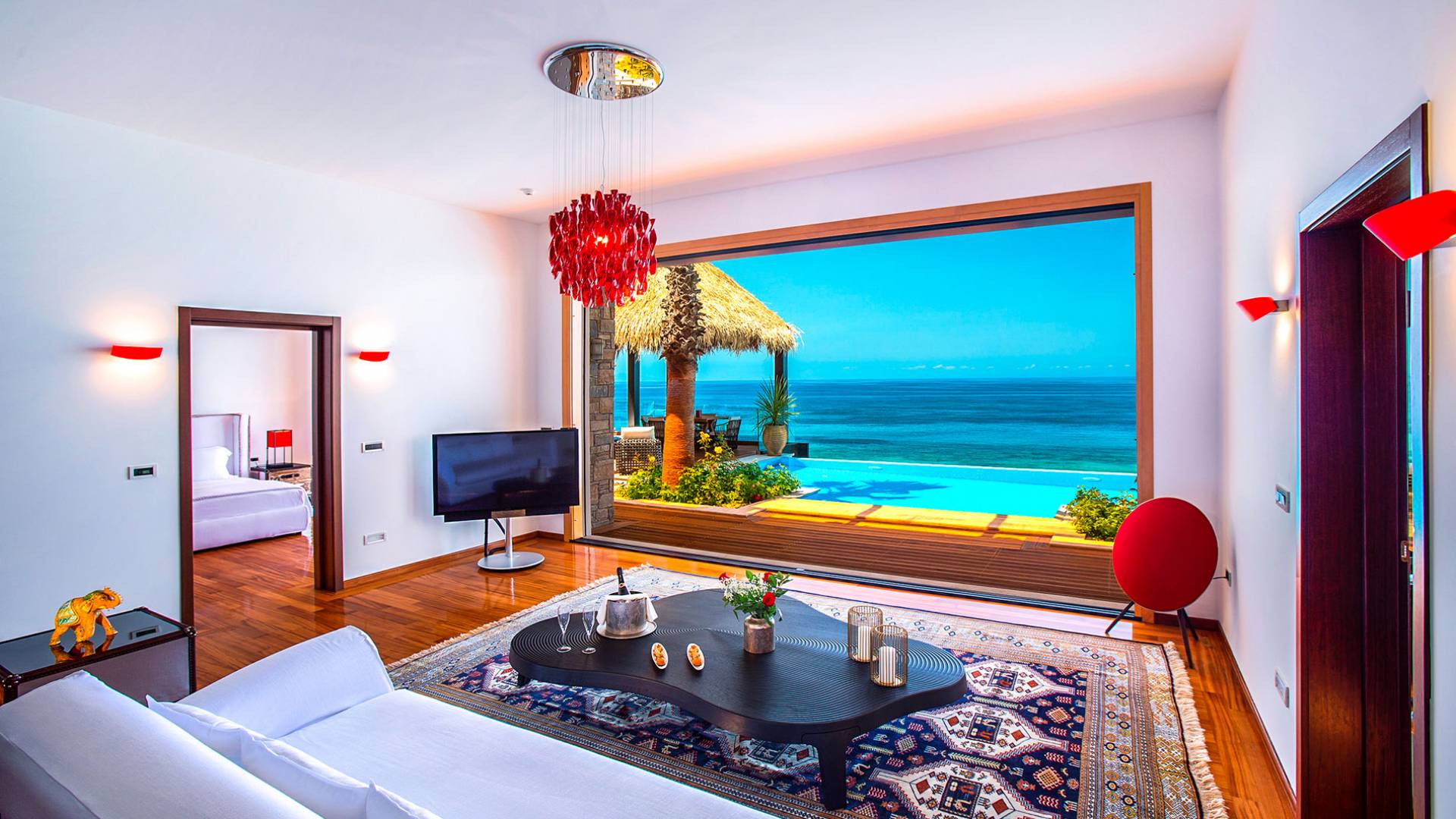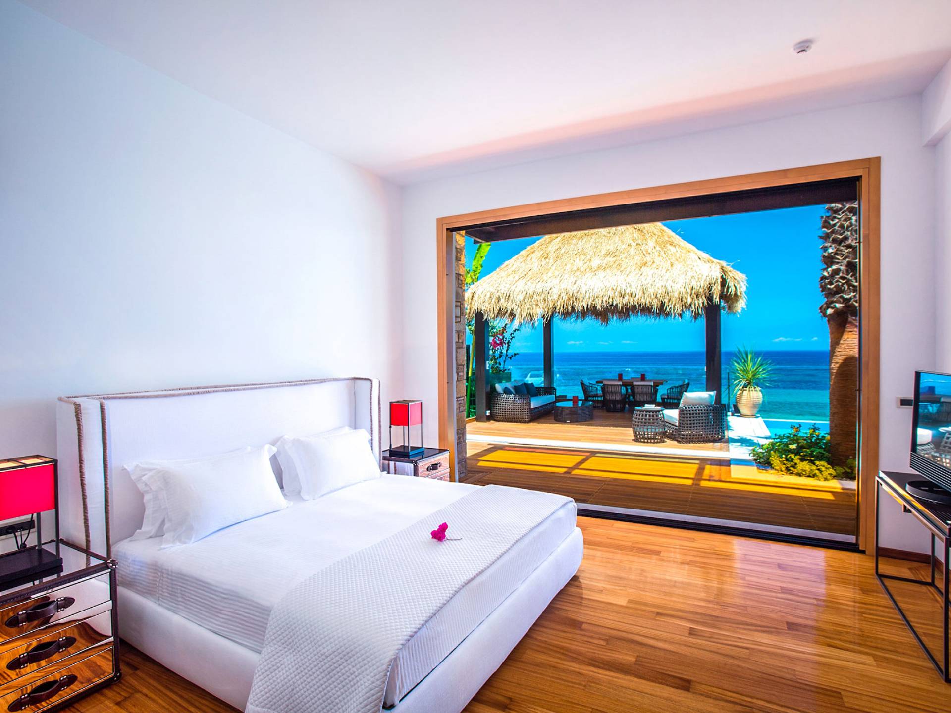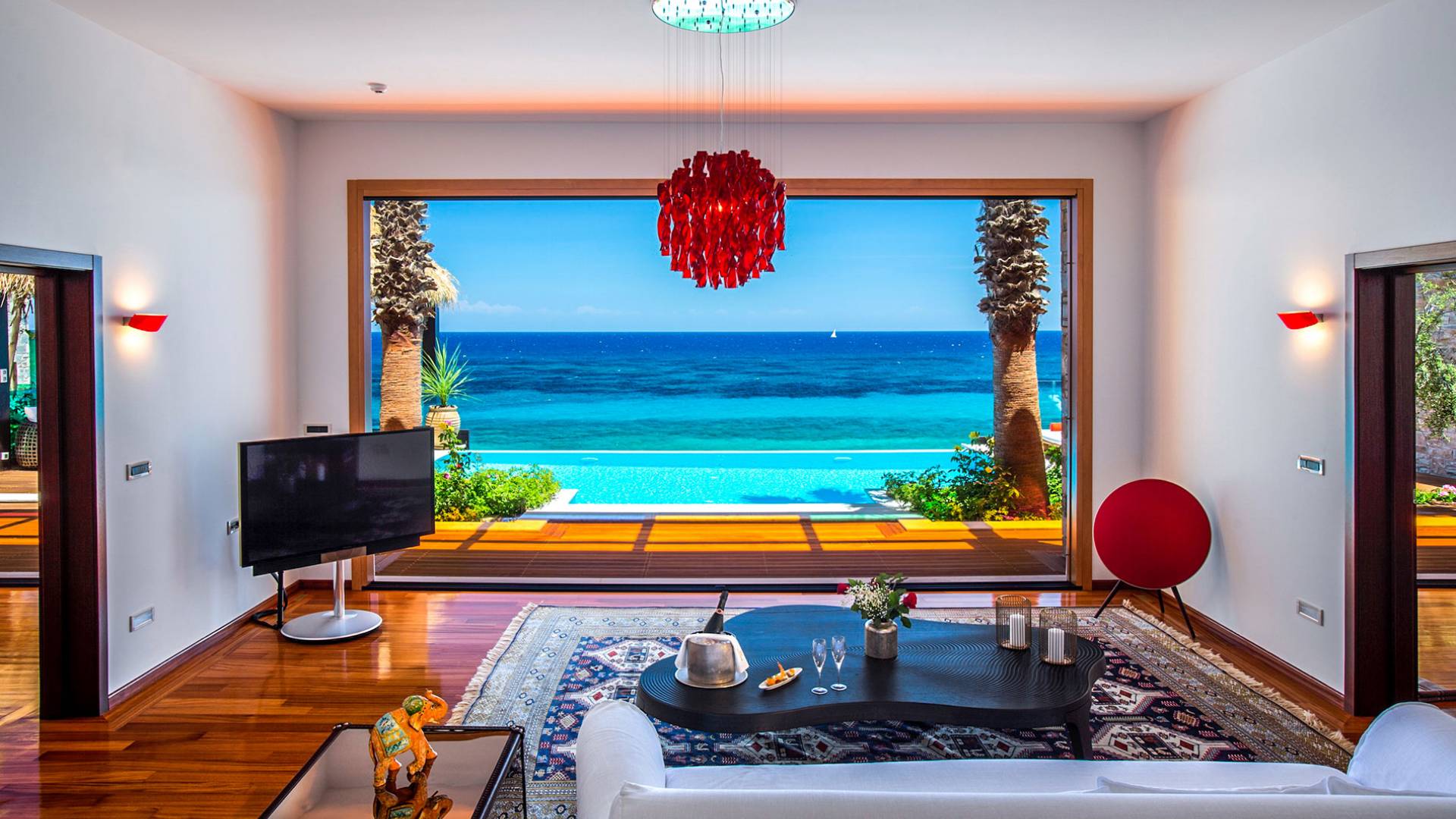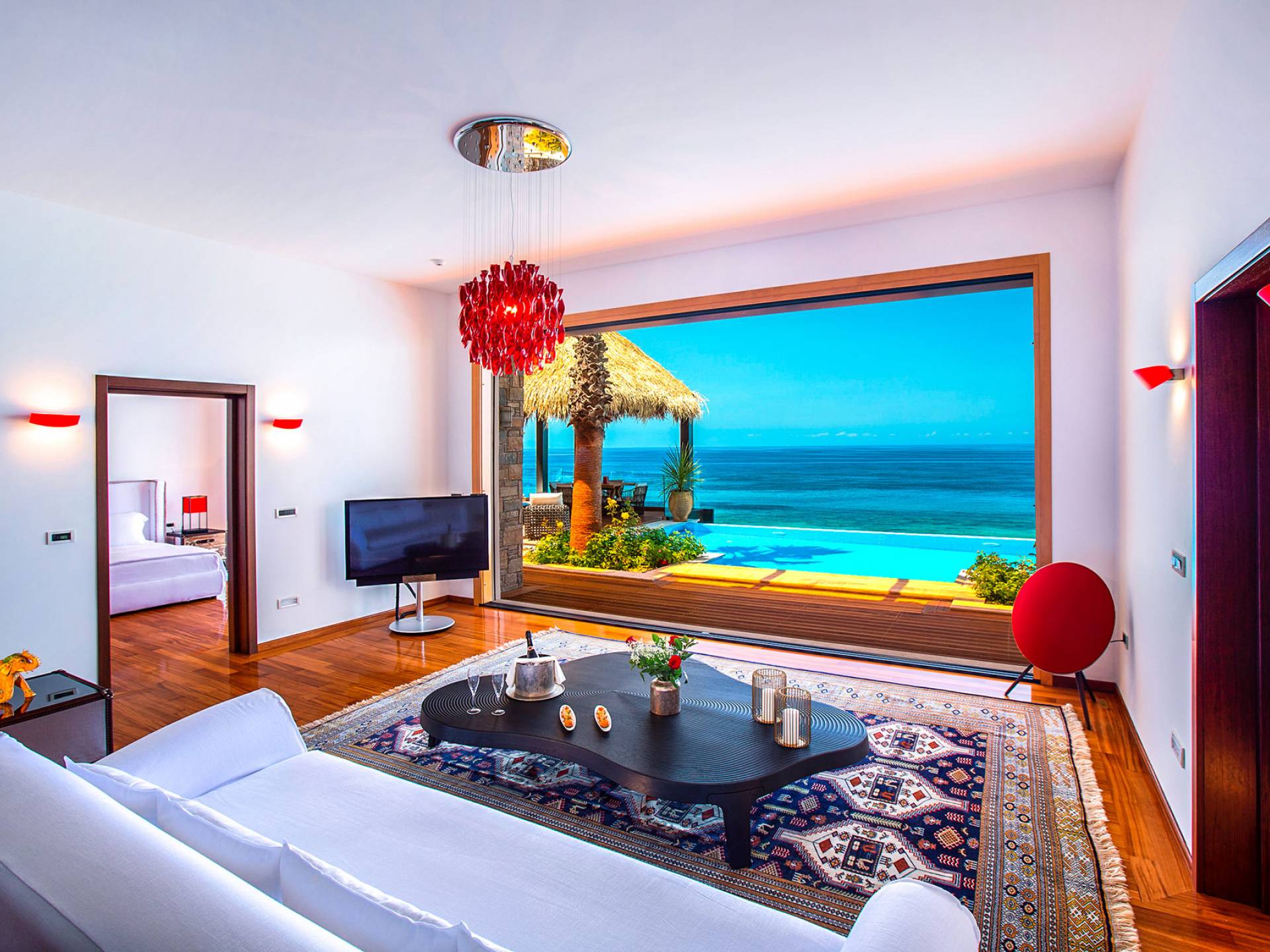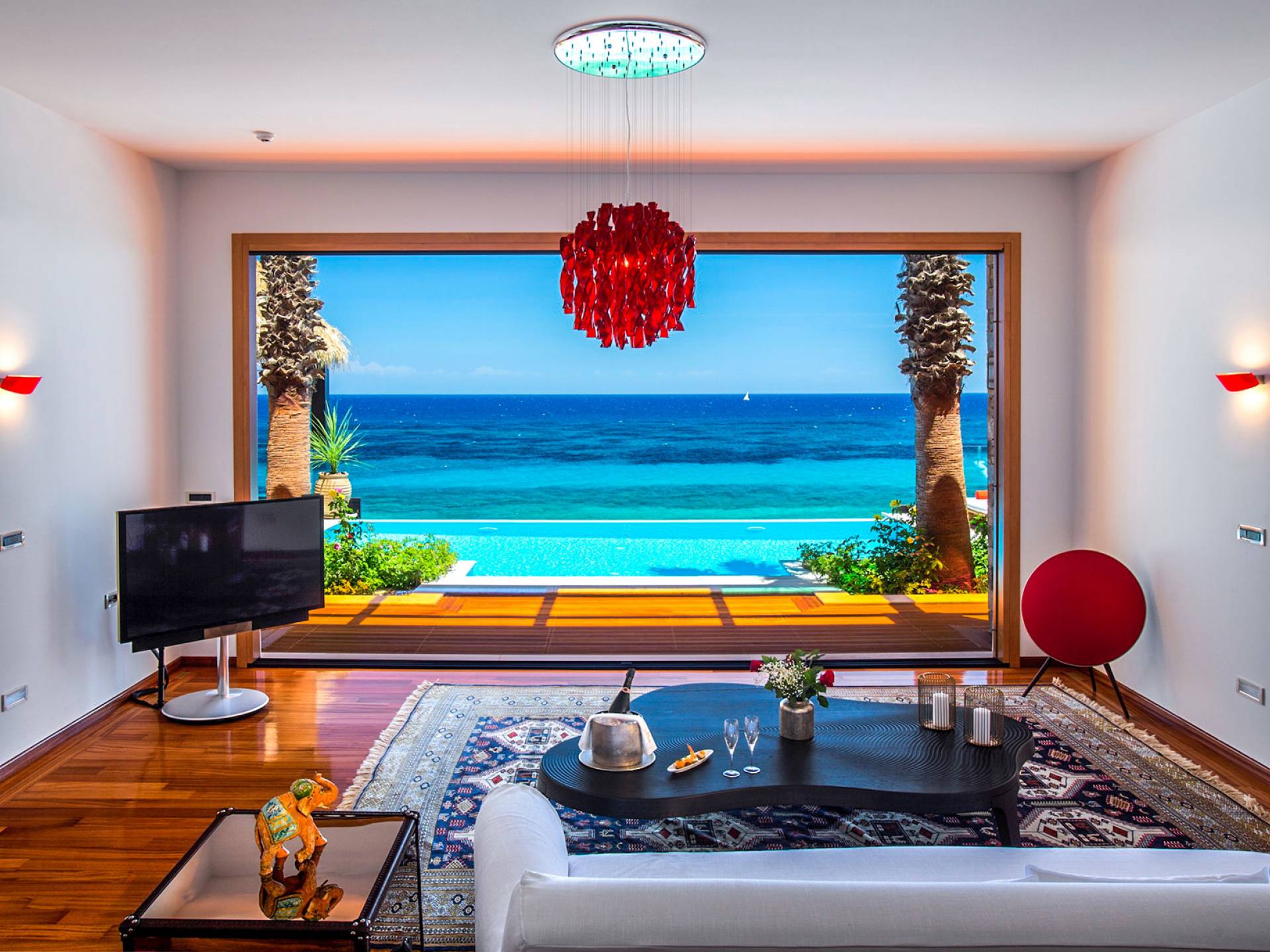 This unique property features exotic architecture, a large private heated swimming pool, and a private area on the beach with personal sunbeds and umbrellas. Throughout this magical villa, state-of-the-art Bang & Olufsen televisions and entertainment systems, Apple TV, and bespoke furniture from leading designers offer the perfect backdrop to unrivaled luxury and outstanding services and amenities.
