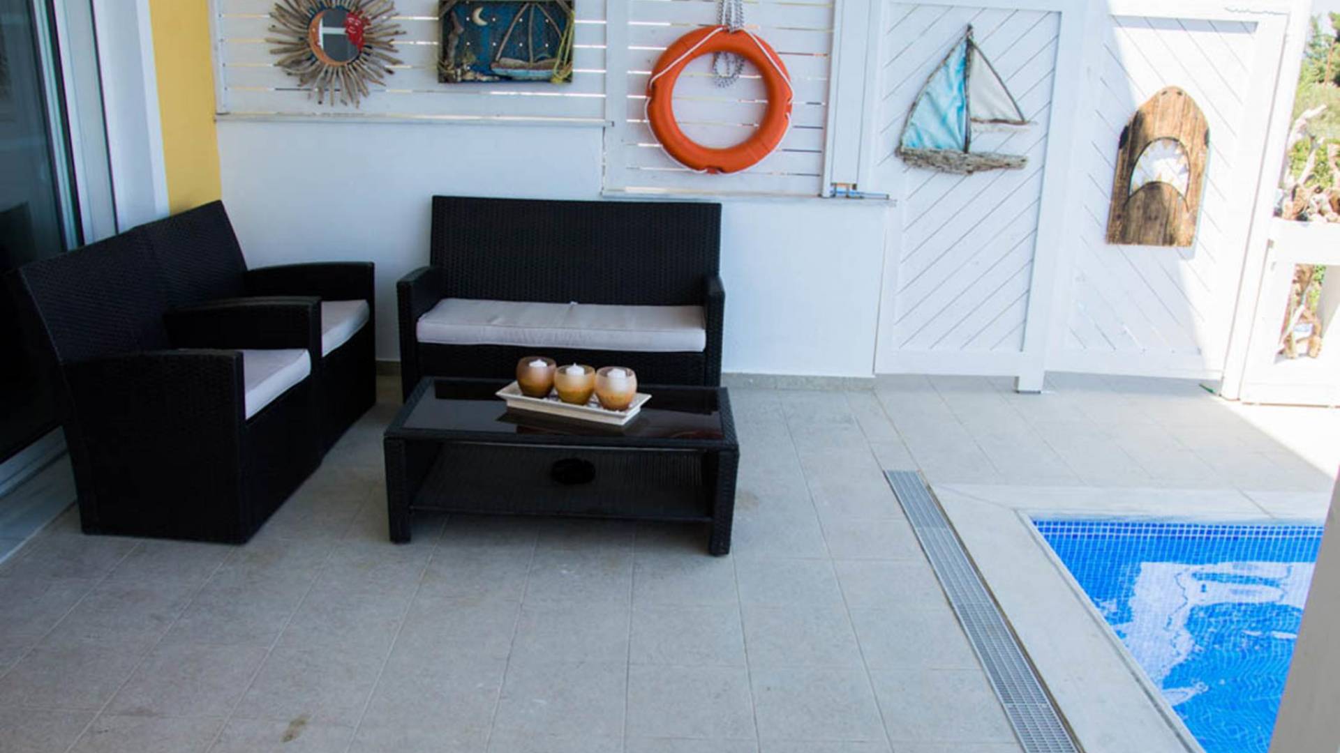 Each villa of 130 sqm, has its own user area 400 sqm, its own parking space, private garden of about 150 sqm. and a private swimming pool with overflow, tangential to the horizon with the sea. In the main terrace of each villa, next to the pool, there is a large wooden dining table, lounge, lounge chairs, and mobile BBQ.