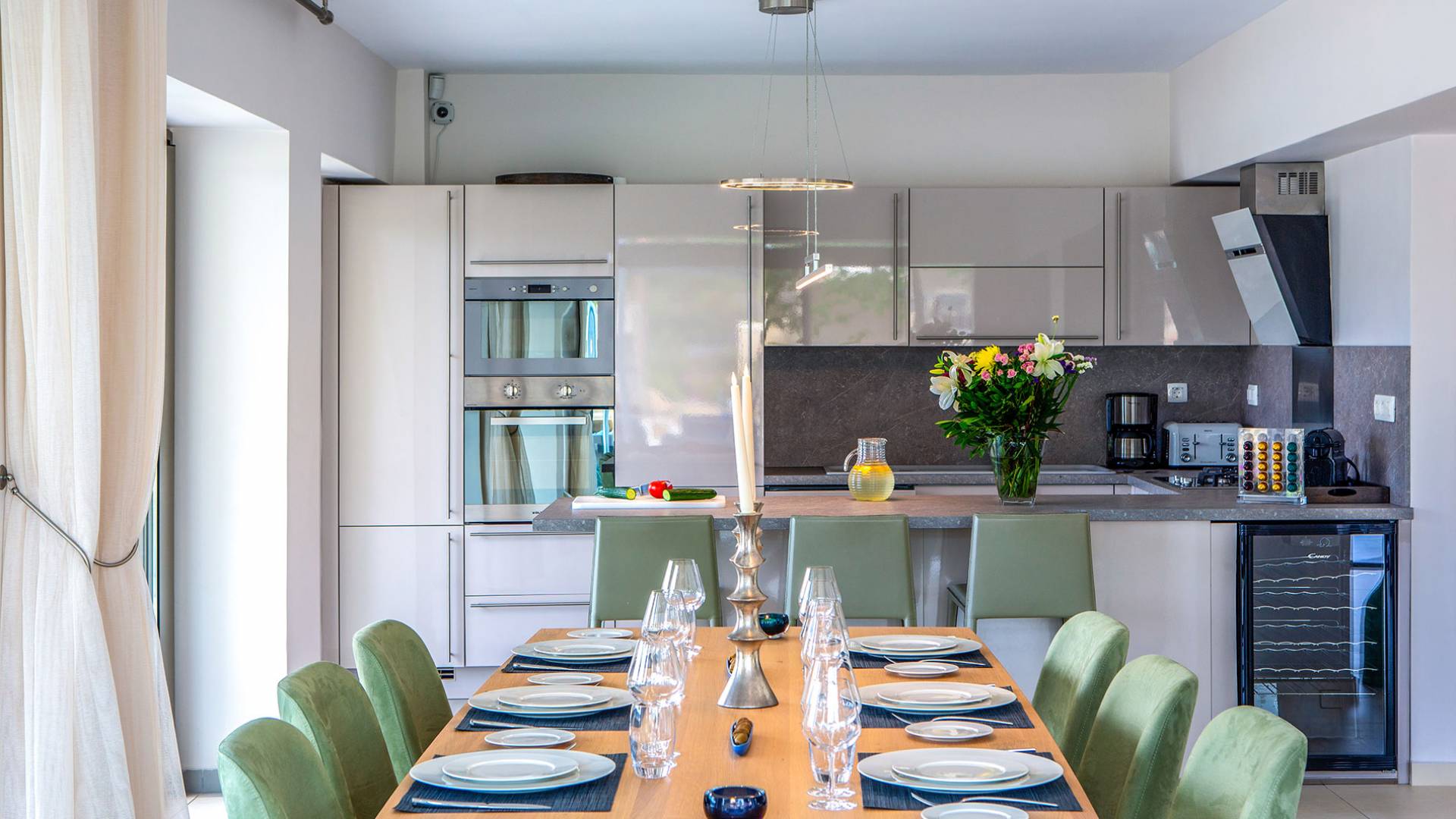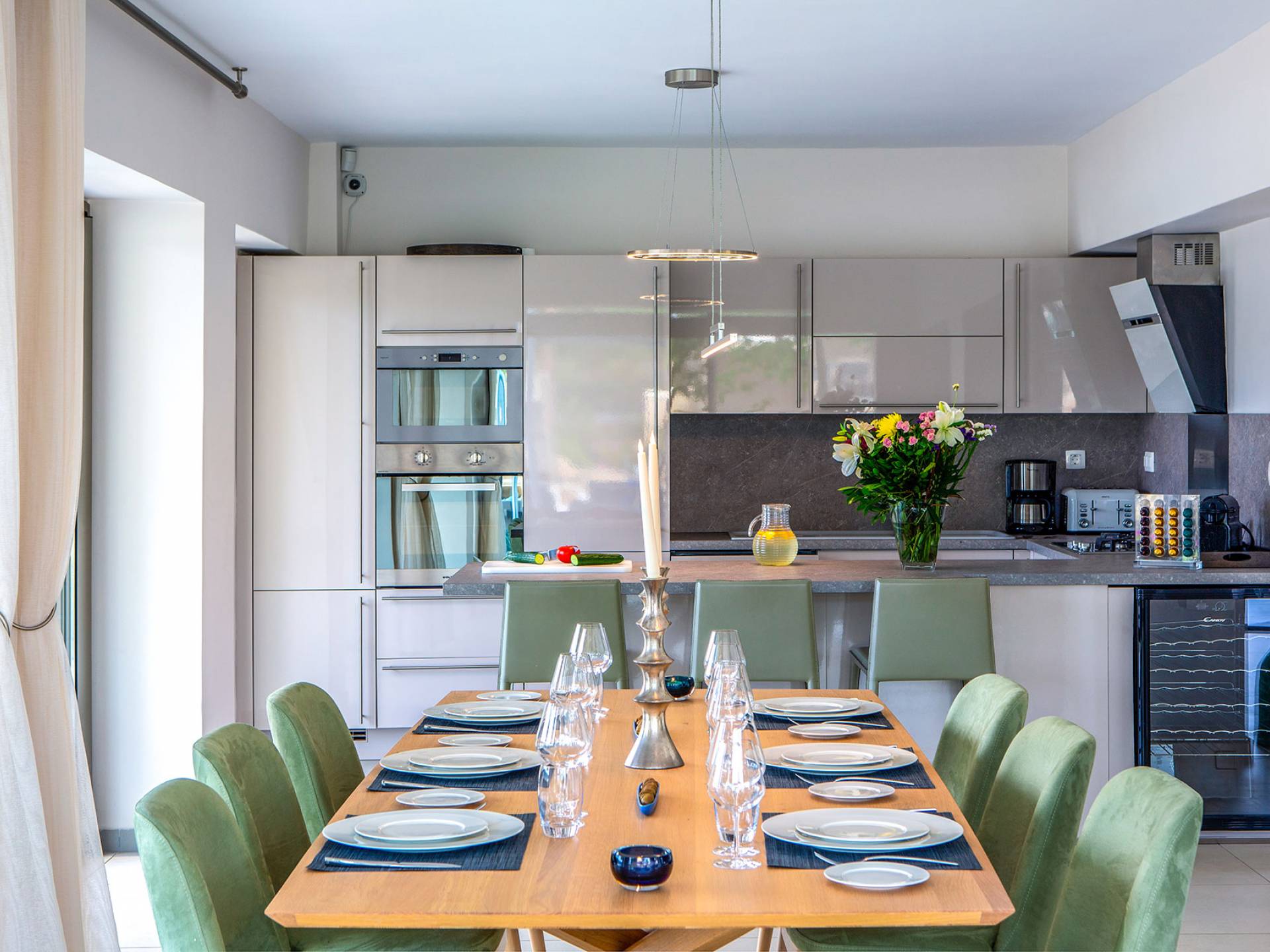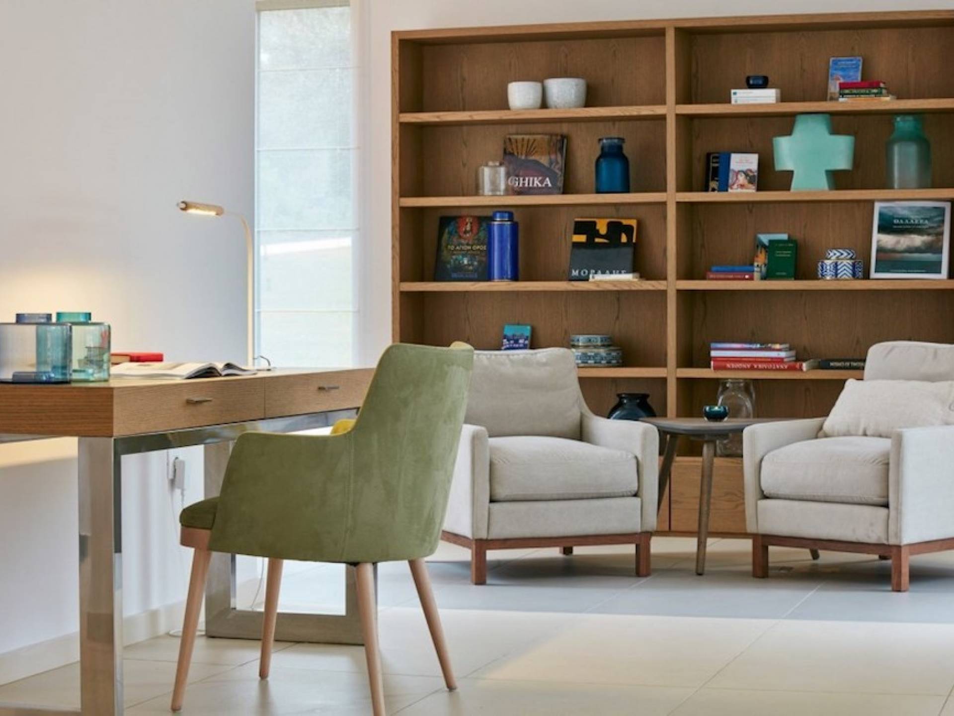 The 107 m2 first floor features 3 bedrooms with en suite bathrooms and majestic views of the sea. The spacious 132 m2 ground floor includes a sitting area, a dining area for 8 people, a library, a fully equipped kitchen, and a desk area. The modern furniture provides a flowing, breathing atmosphere, while equally inspires a complete feeling of luxury and comfort. The modern kitchen is fully equipped to meet high standards with appliances from well-known international brands. The modern furniture has been carefully chosen to symbolize the island’s calm yet enjoyable atmosphere.