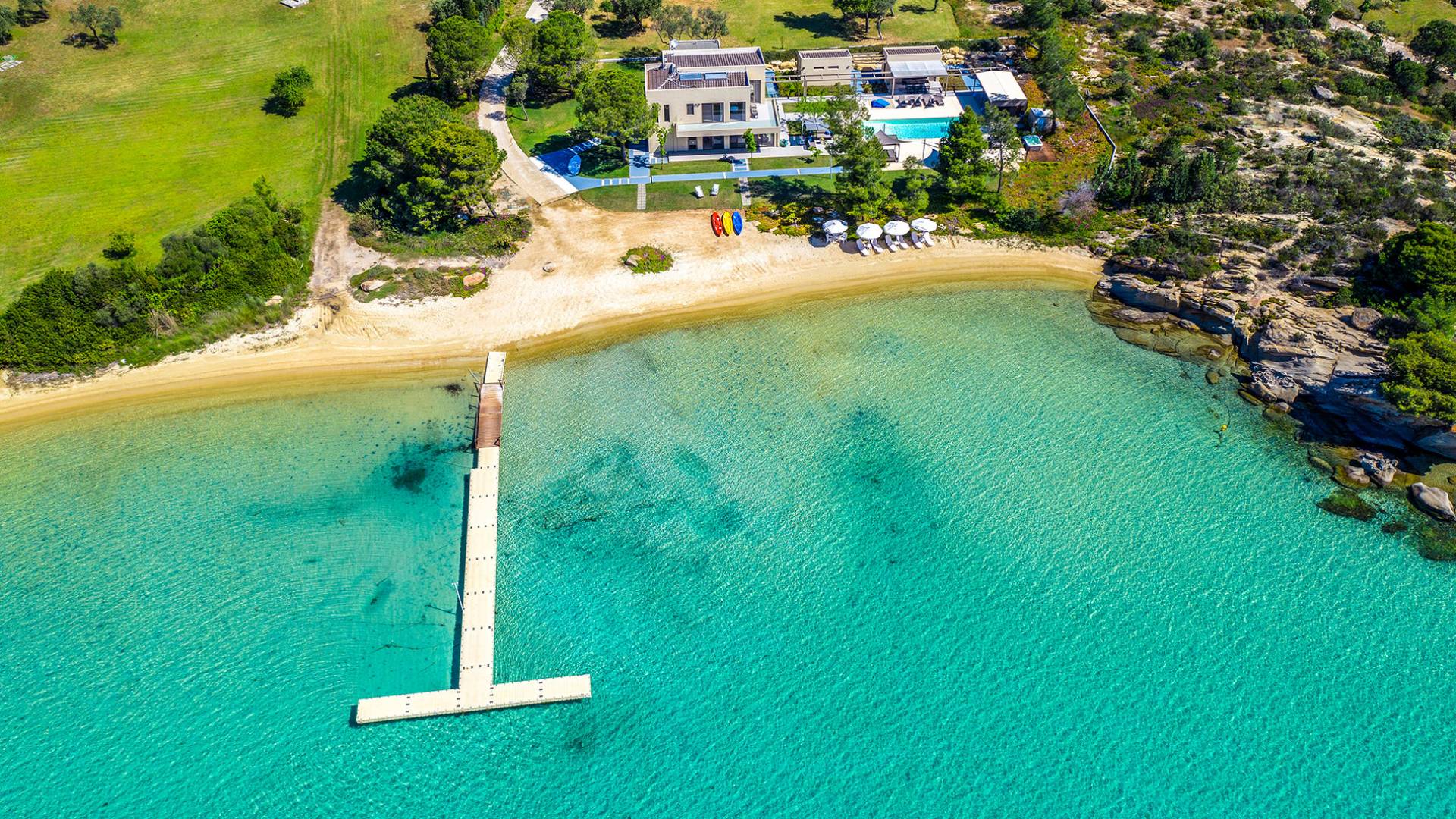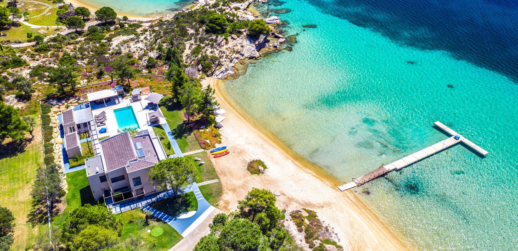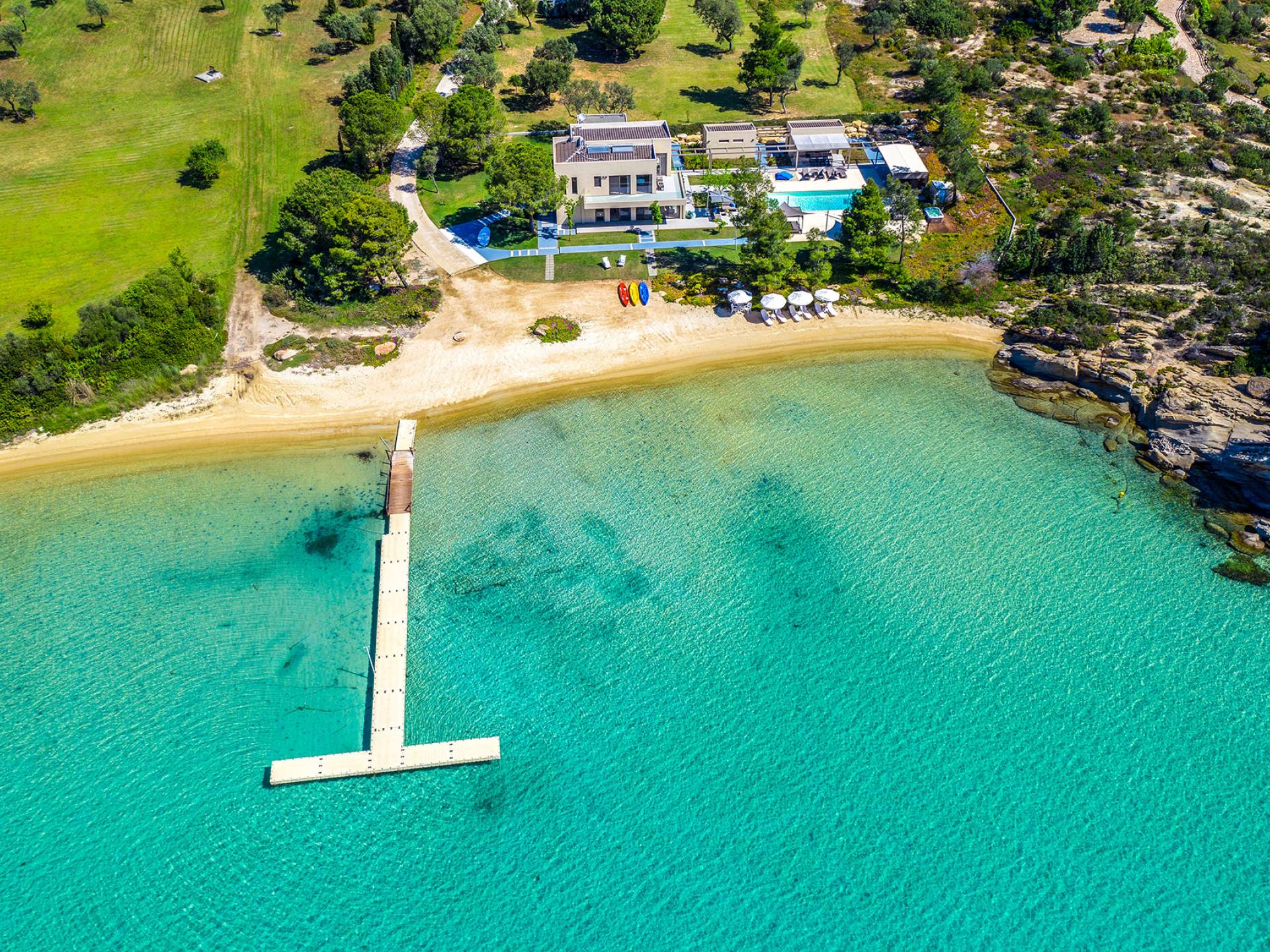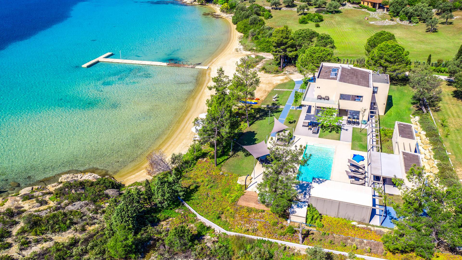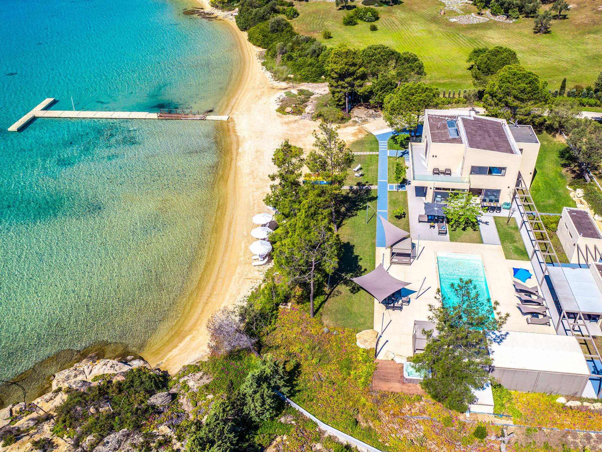 Villa Lagoon Halkidiki, a three-bedroom luxury residence of 240m2 lies on a land of 6.500 m2 on the southwest side of Viaporos Halkidiki. It is settled in a natural cove of a rare aquamarine tint only a few feet from the water with spectacular views to Sithonia and Vourvourou. The distinctive feature of the property is its closeness to the sea. The private beach is an integral part of the internal space. The latest quality standards in construction set the preservation of the island’s resources as their highest priority, while they serve to enhance the natural ecosystem the residence is supplied with solar panel energy.