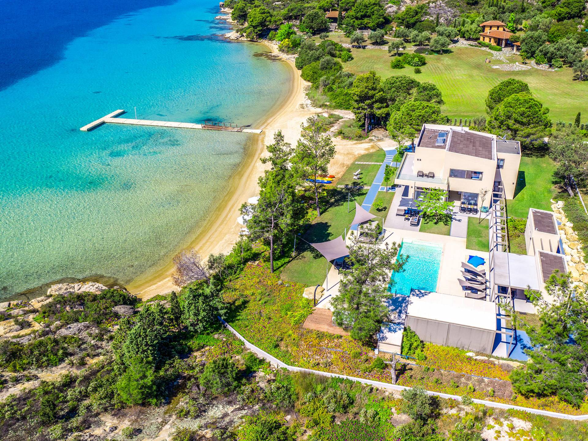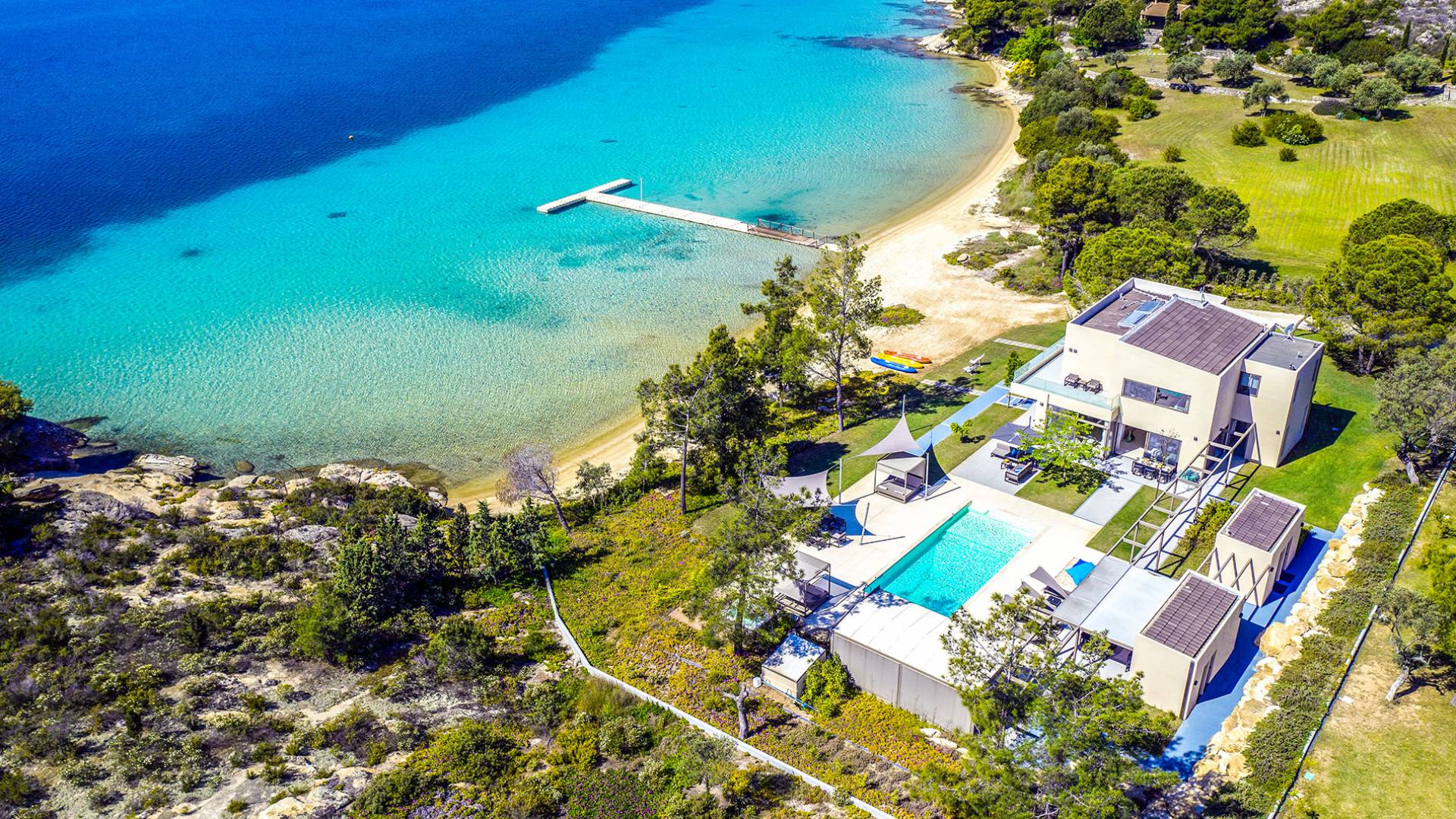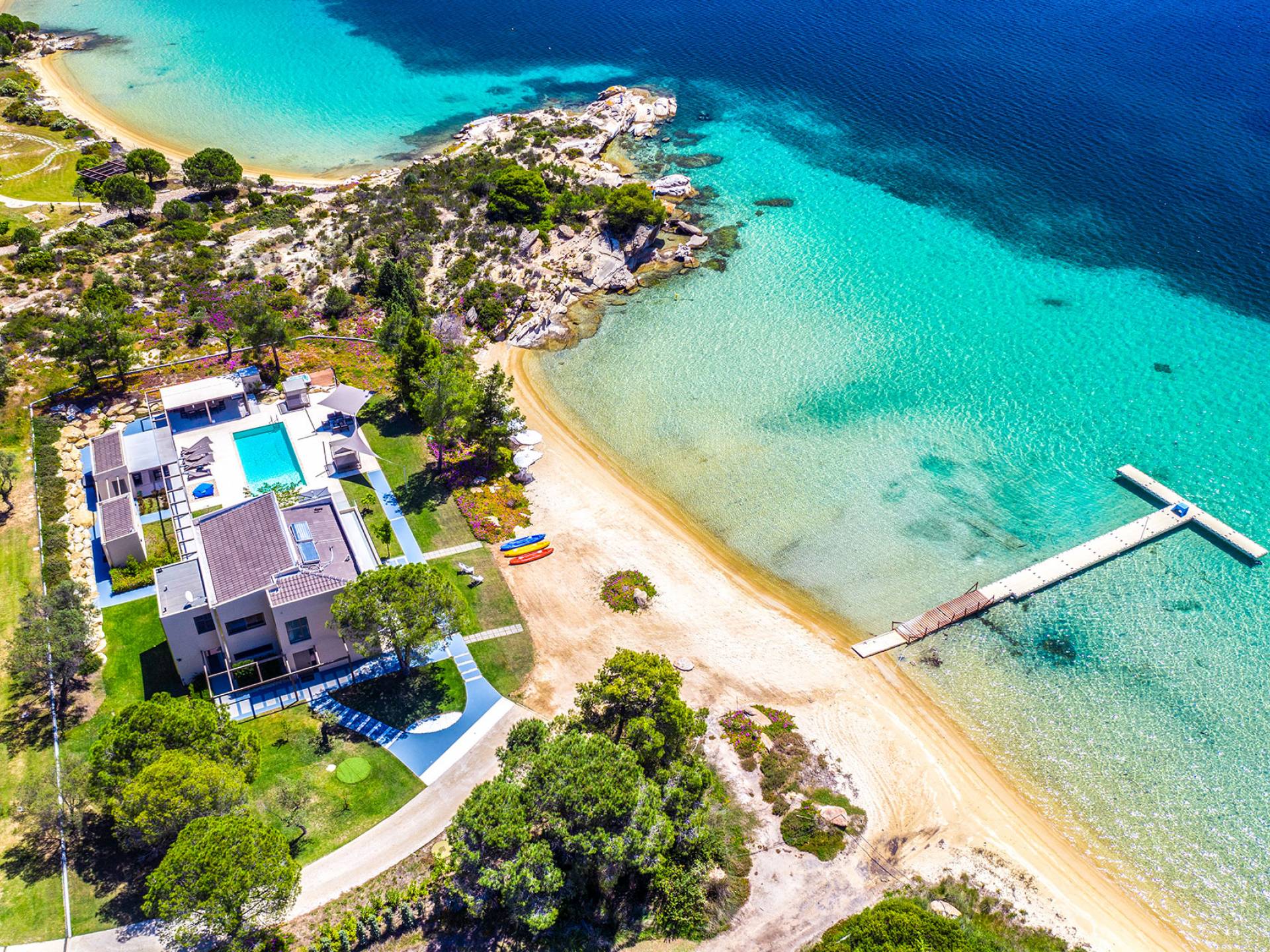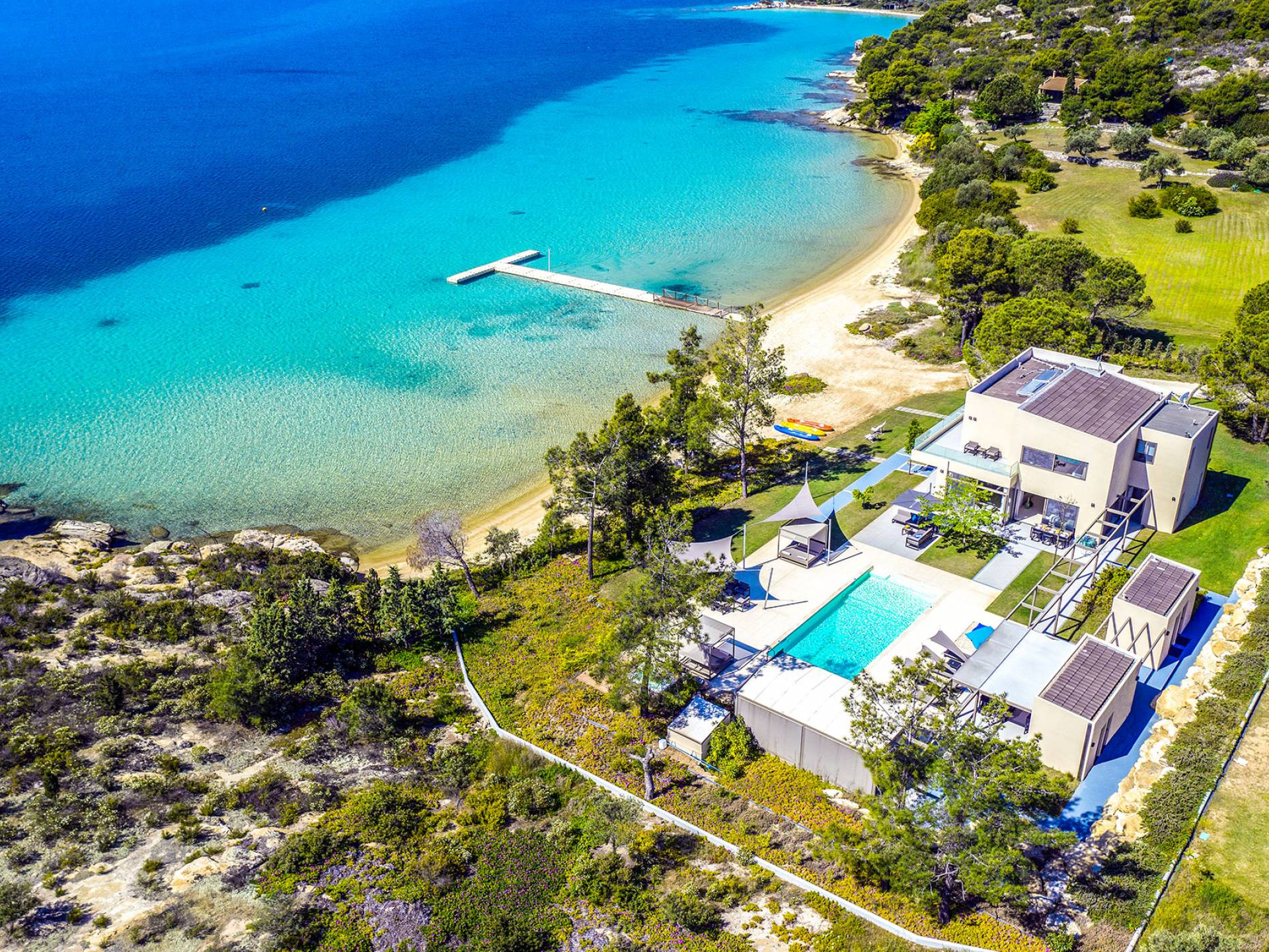 Villa Lagoon Halkidiki, a three-bedroom luxury residence of 240m2 lies on a land of 6.500 m2 on the southwest side of Viaporos Halkidiki. It is settled in a natural cove of a rare aquamarine tint only a few feet from the water with spectacular views to Sithonia and Vourvourou. The distinctive feature of the property is its closeness to the sea. The private beach is an integral part of the internal space. The latest quality standards in construction set the preservation of the island’s resources as their highest priority, while they serve to enhance the natural ecosystem the residence is supplied with solar panel energy.