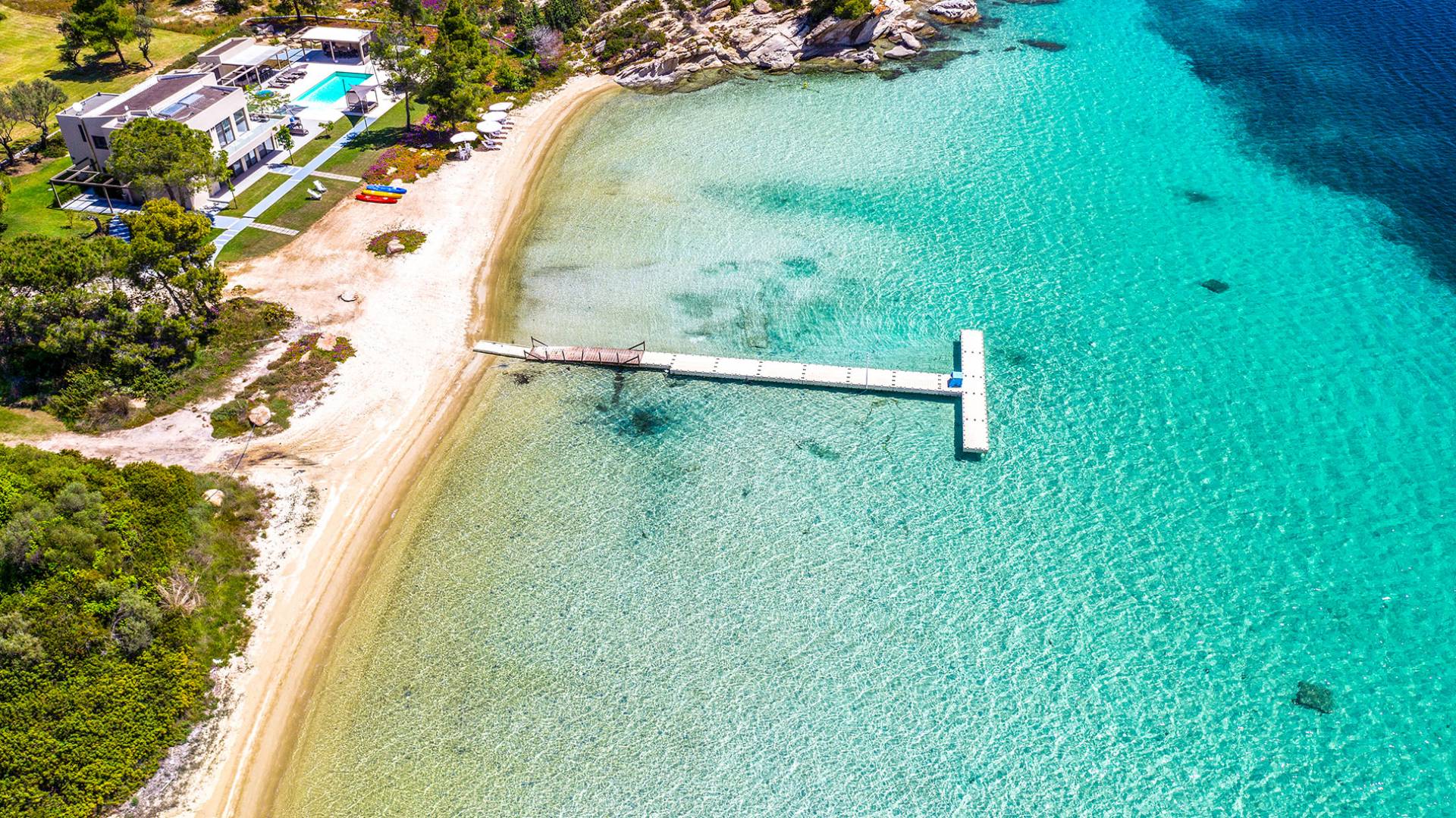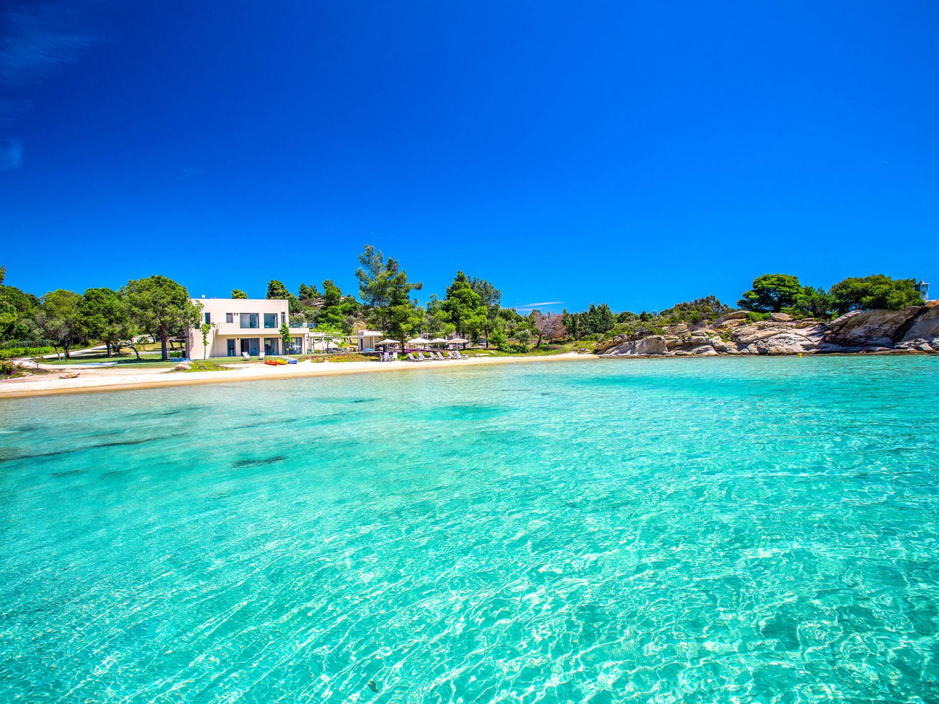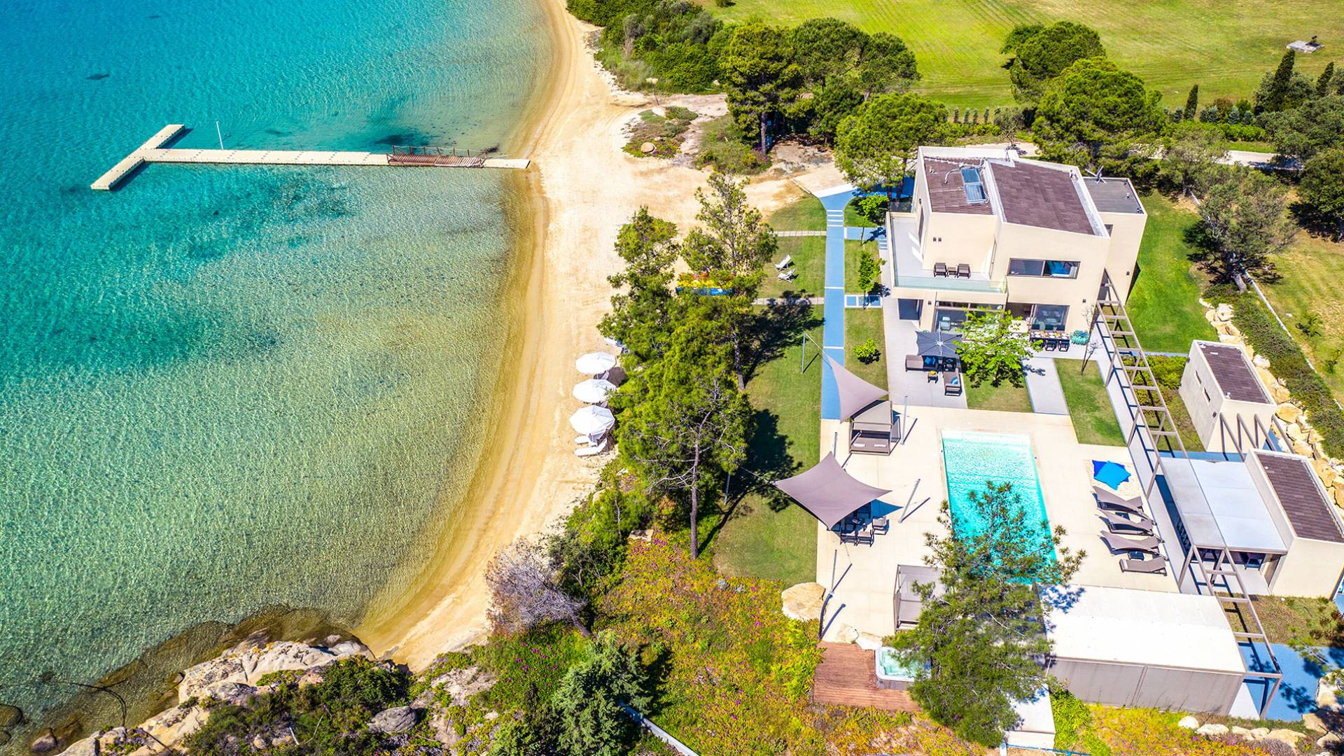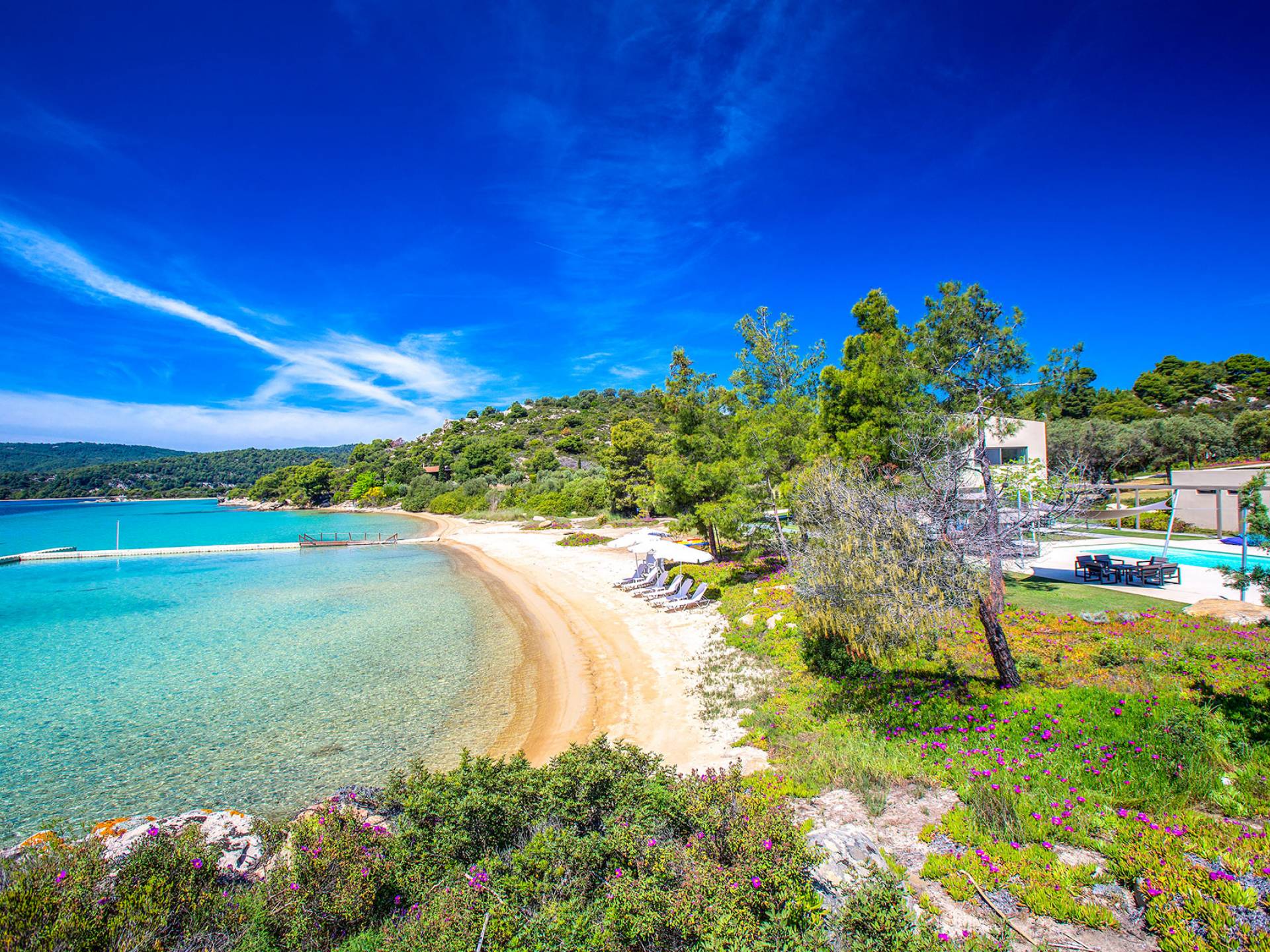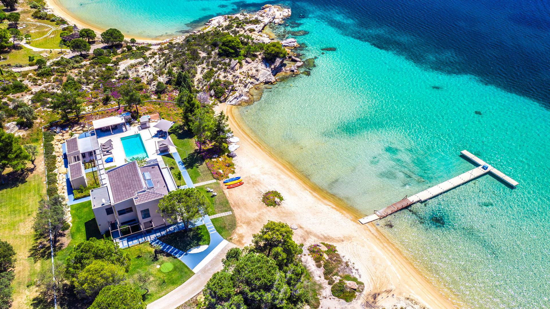 Villa Lagoon Halkidiki, a three-bedroom luxury residence of 240m2 lies on a land of 6.500 m2 on the southwest side of Viaporos Halkidiki. It is settled in a natural cove of a rare aquamarine tint only a few feet from the water with spectacular views to Sithonia and Vourvourou. The distinctive feature of the property is its closeness to the sea. The private beach is an integral part of the internal space. The latest quality standards in construction set the preservation of the island’s resources as their highest priority, while they serve to enhance the natural ecosystem the residence is supplied with solar panel energy.