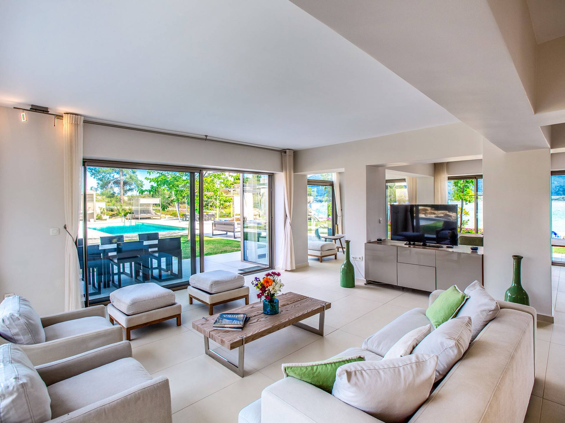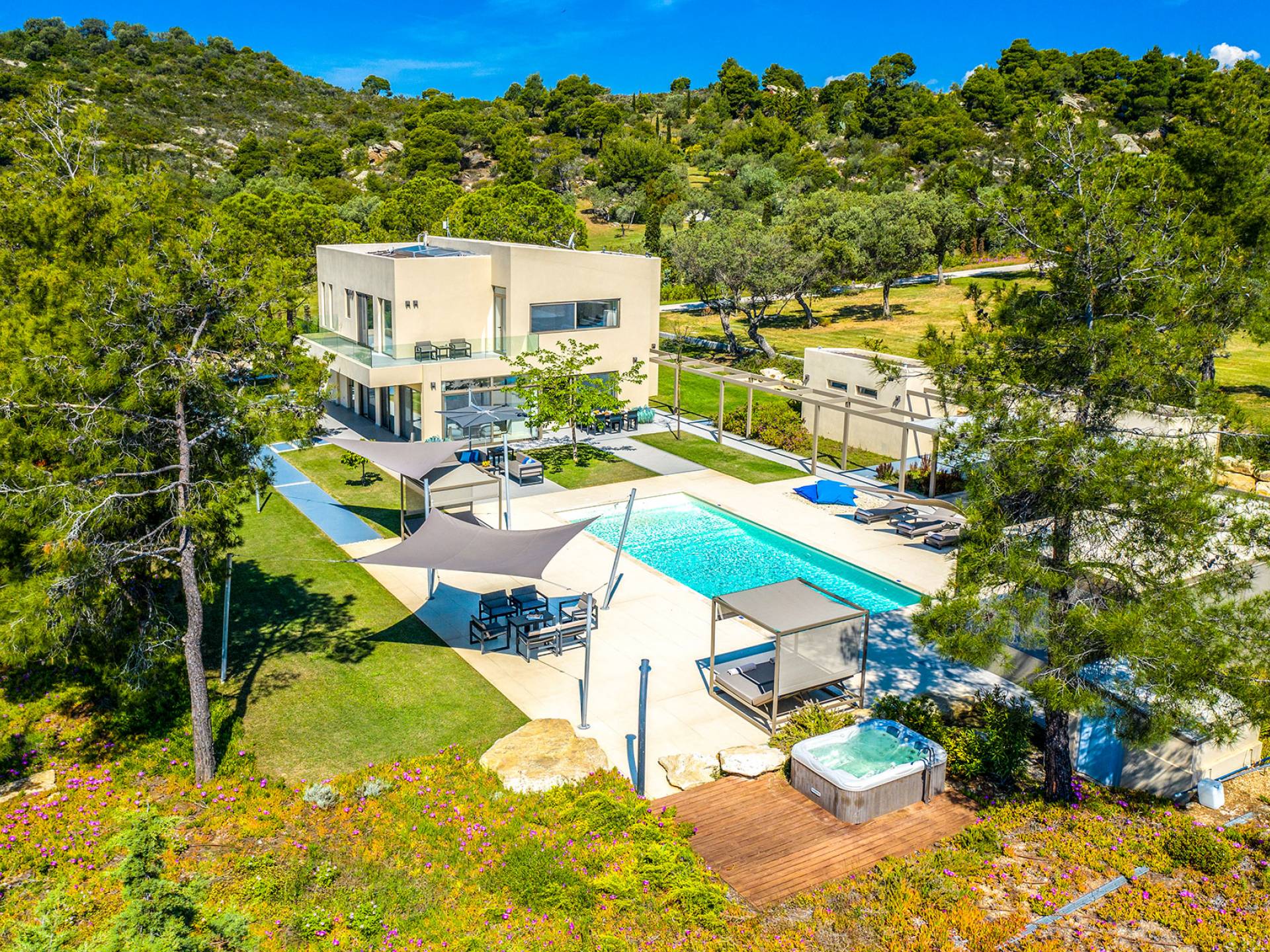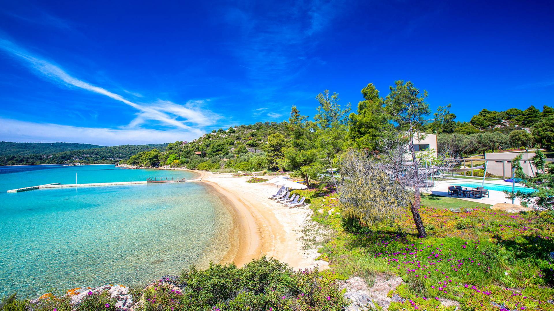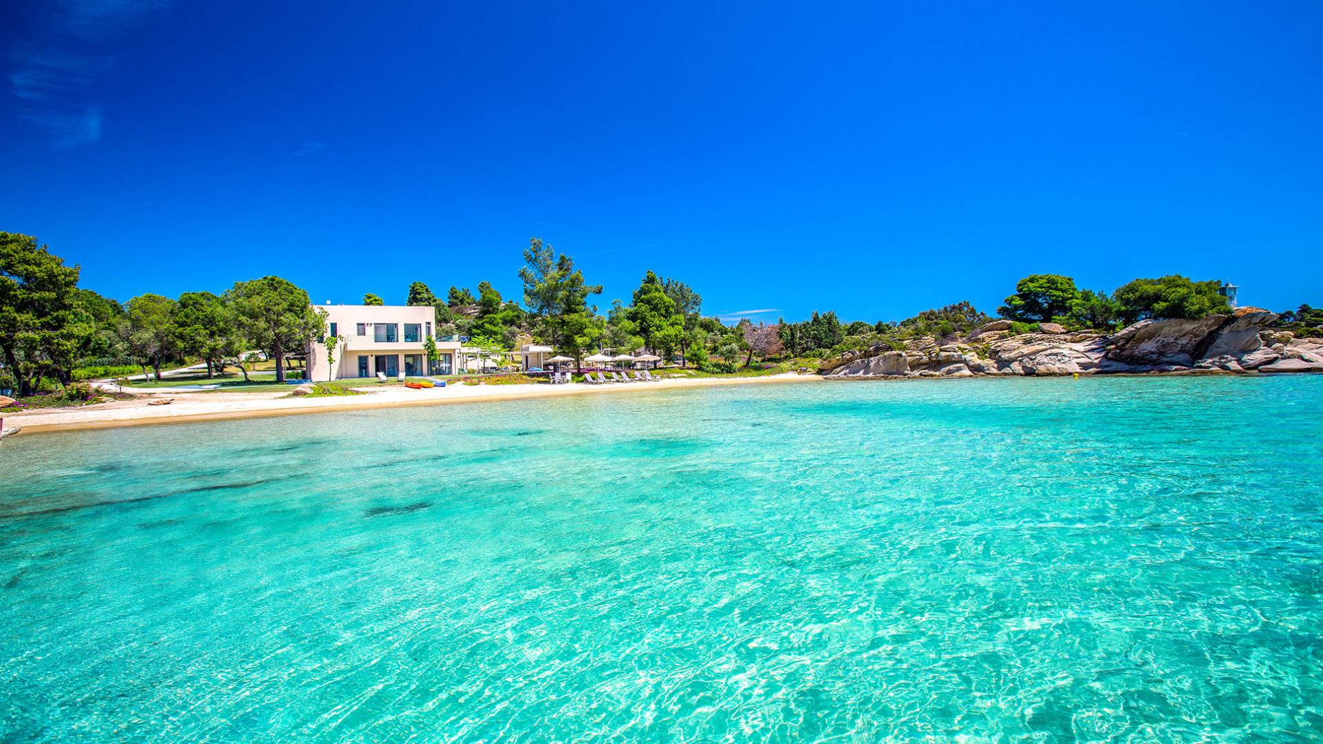 Villa Lagoon Halkidiki, a three-bedroom luxury residence of 240m2 lies on a land of 6.500 m2 on the southwest side of Viaporos Halkidiki. It is settled in a natural cove of a rare aquamarine tint only a few feet from the water with spectacular views to Sithonia and Vourvourou. The distinctive feature of the property is its closeness to the sea. The private beach is an integral part of the internal space. The latest quality standards in construction set the preservation of the island’s resources as their highest priority, while they serve to enhance the natural ecosystem the residence is supplied with solar panel energy.