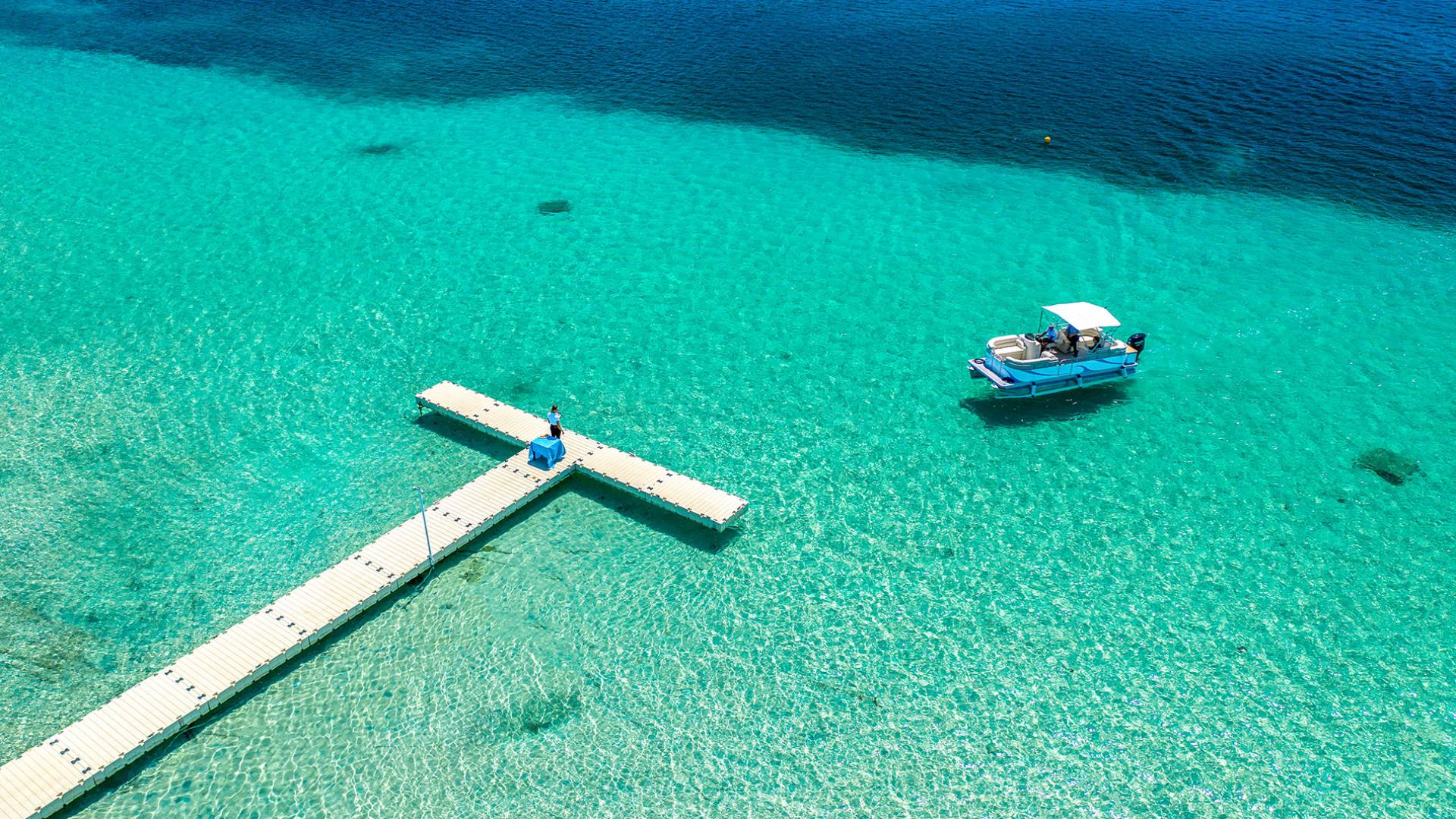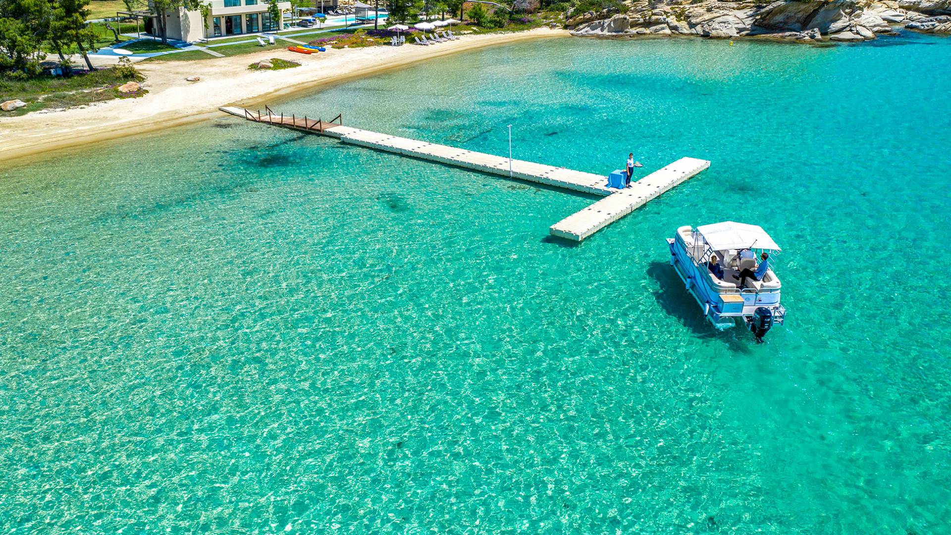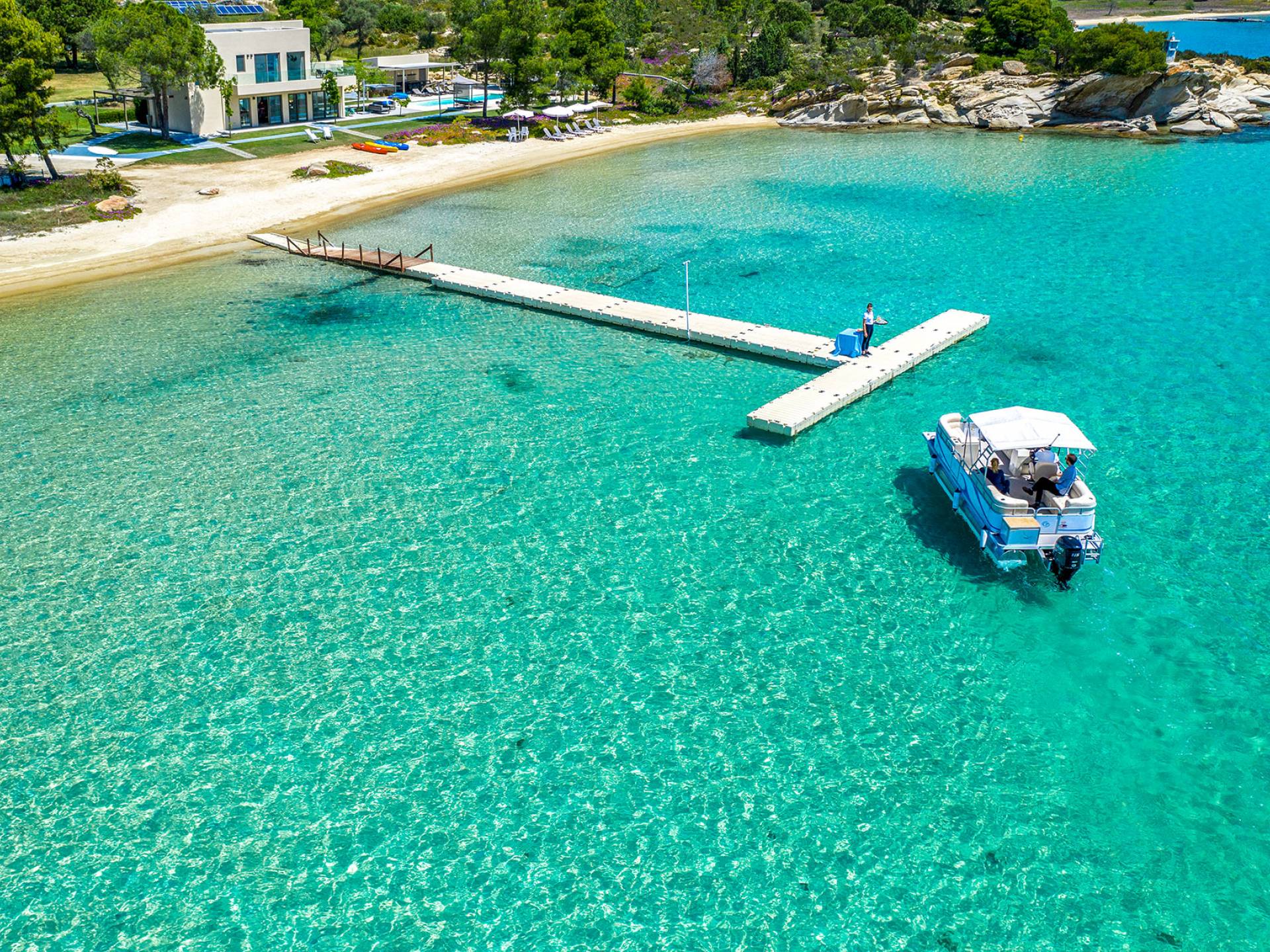 This service is private, complimentary, and available at any time. The journey between the meeting point and the island lasts about 10 minutes on the quiet and soft sea all year round. A private beach with pontoon access awaits and is ideal for secured anchorage. The natural protection from winds is offered by the closed wind-resistant cove and the calm waters that offer privacy and safety to a wide range of boats, under any conditions and in all seasons. Upon your arrival at the island, the residence lies only a few meters away from your arrival point. You will have at your disposal and included in the price of each villa a self-service 5m boat with an outboard 30hp engine.