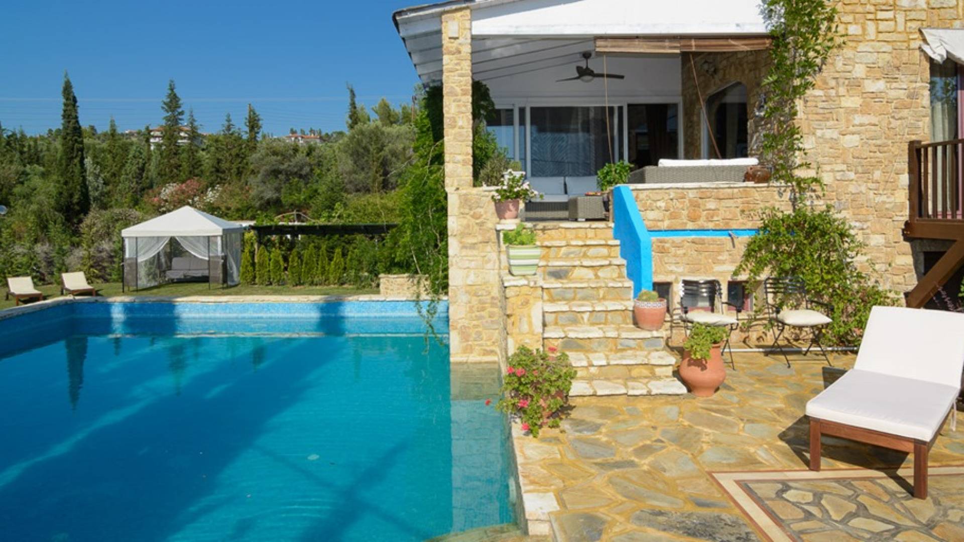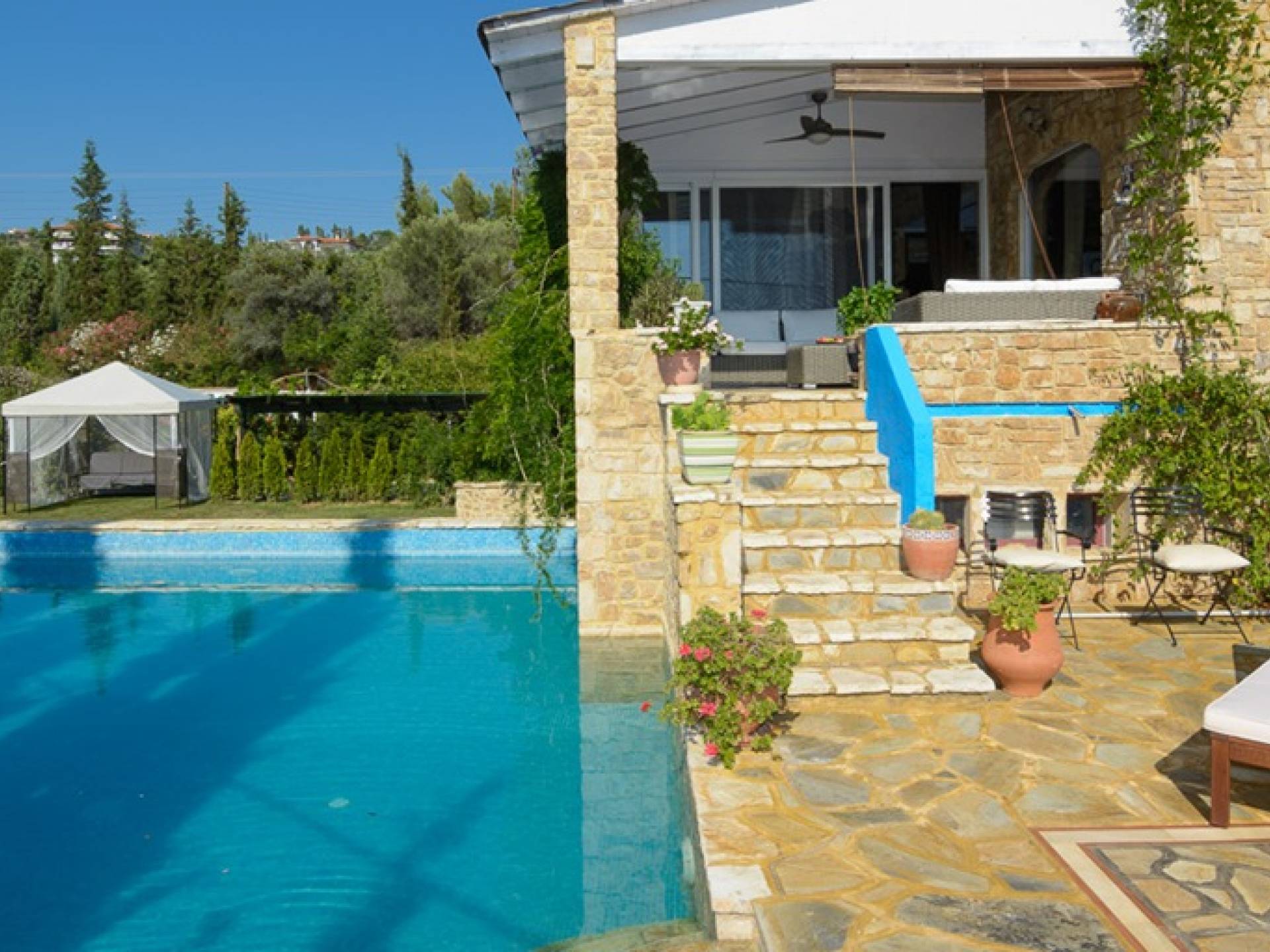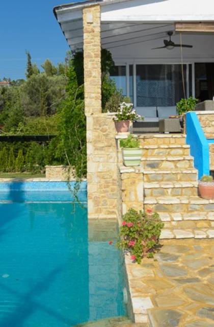 All the villas have got private swimming pools and provide every sense of comfort for friends, couples and families. Just a few km away from New Marmaras and Nikiti and very close to Mount Athos, one can indulge in a variety of activities such as water sports, intense nightlife, luscious dishes, shopping and spiritual immersion to the history and monastic life of Mount Athos. Villa Athena at Maria Elena Villas Halkidiki is a luxury villa rental with 7 bedrooms and a private pool. This luxurious villa can easily accommodate up to 12-14 people, has all the comforts of home and is a distinctive suggestion/proposal for luxurious vacations.