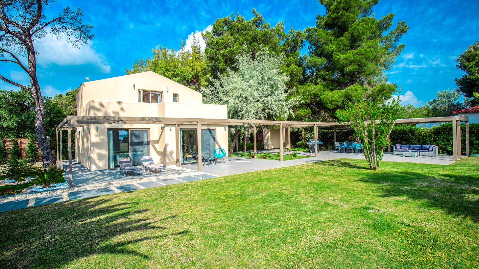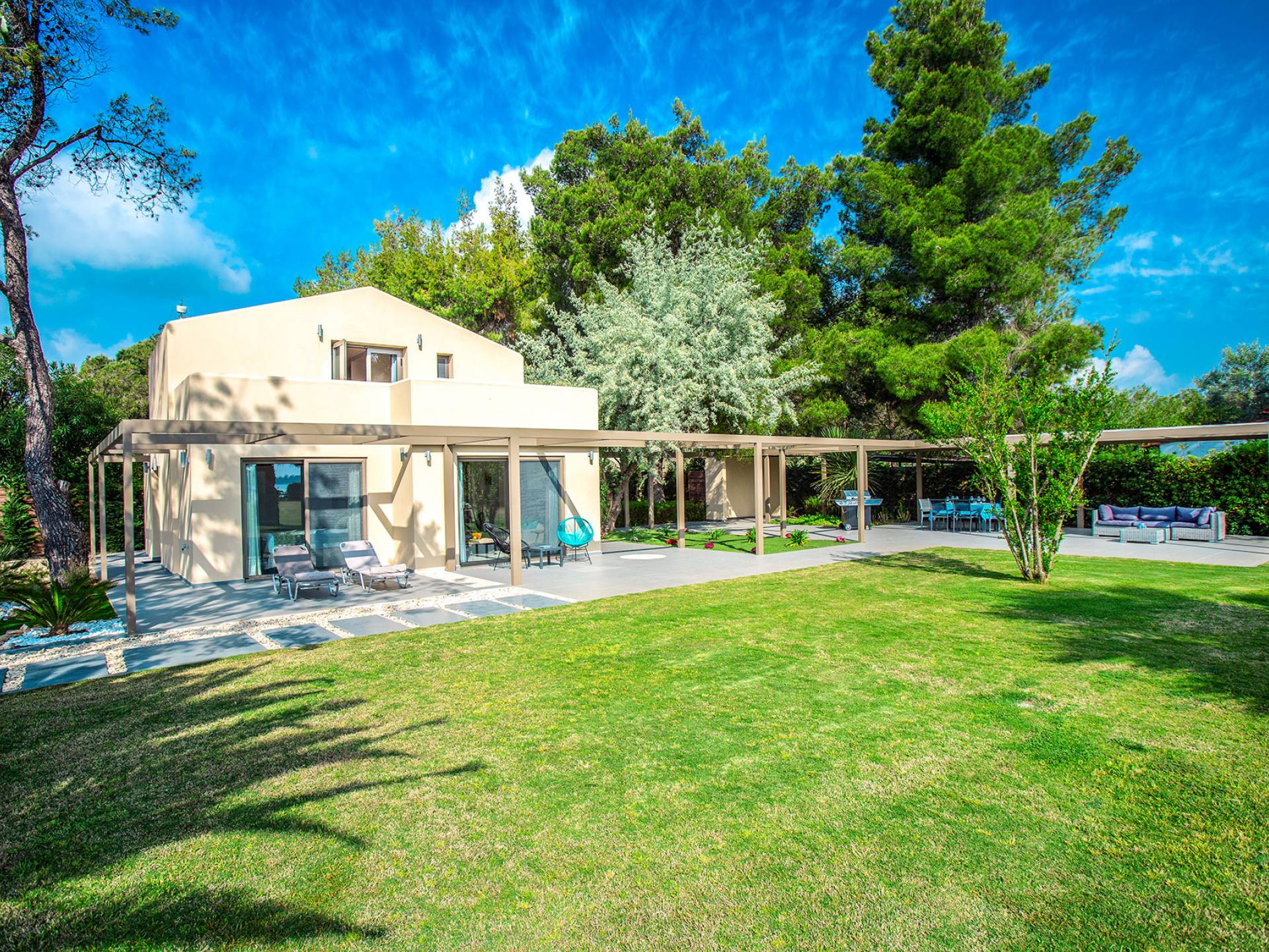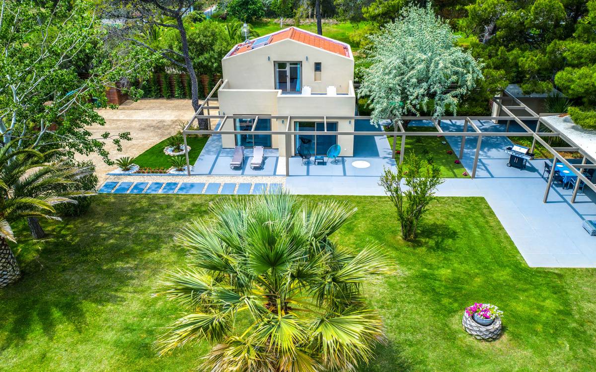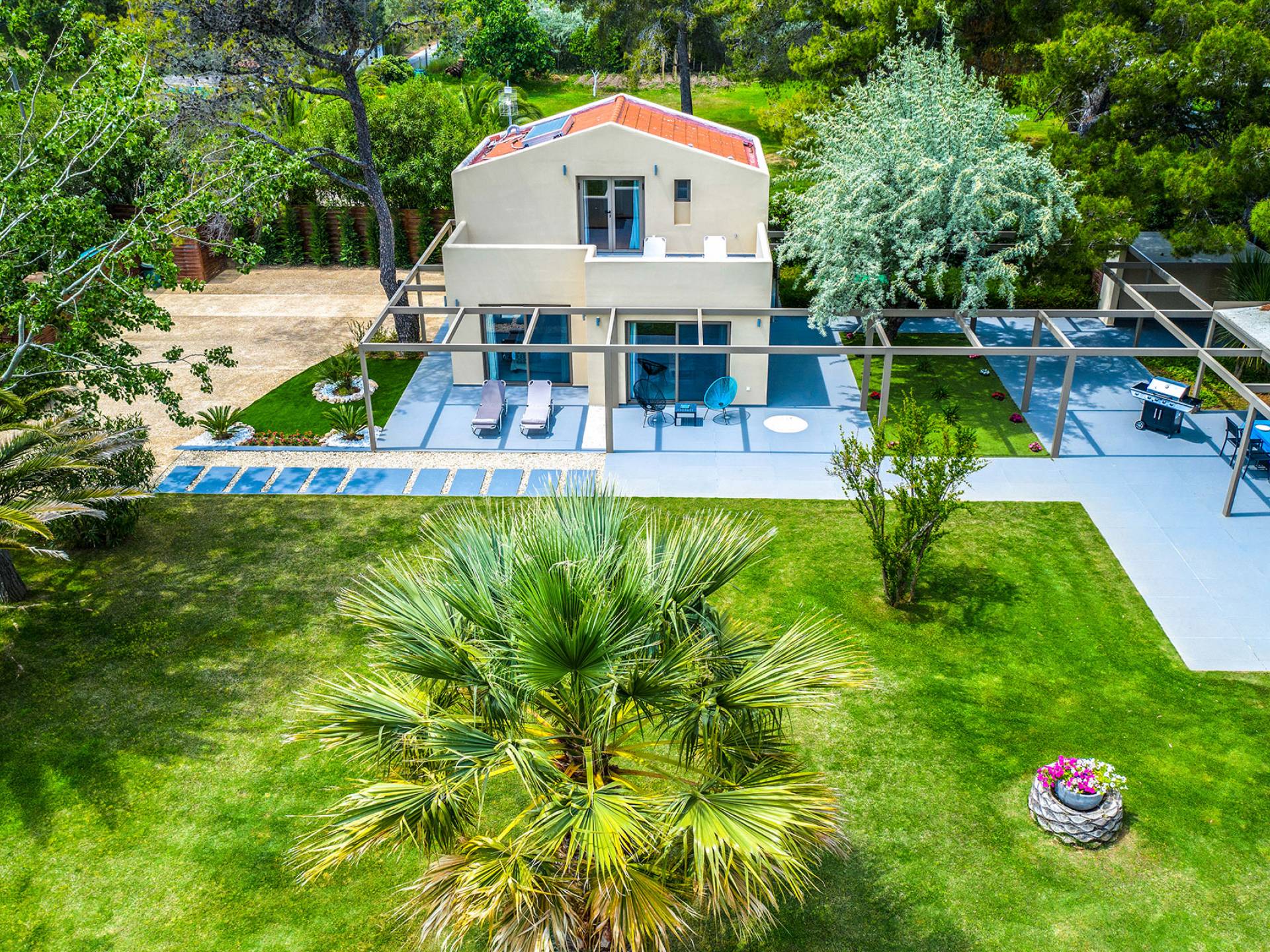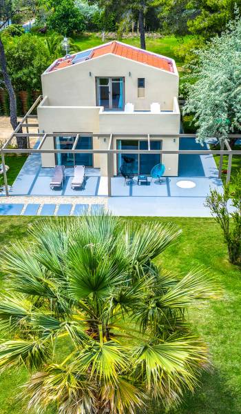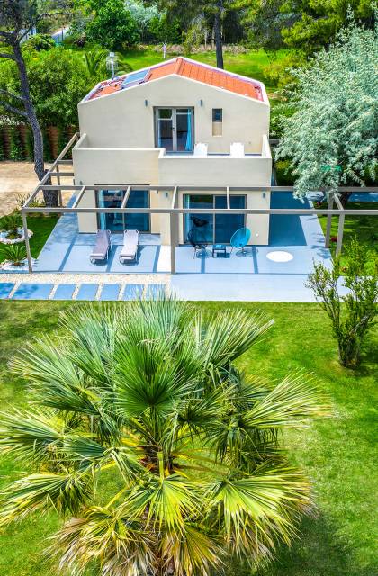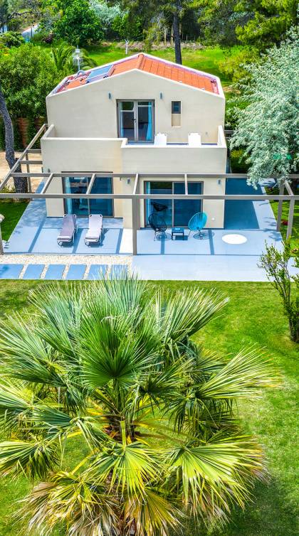 Palm Garden Villa Halkidiki is equipped with satellite TV, Wi-Fi, air conditioning, safe and security system. The latest quality standards in construction gave the highest priority to preserve natural resources. The beautiful garden and terraces, the barbecue area, and the outside seating provide endless possibilities for relaxing and joyful activities. The rooftop terrace offers a majestic view over the 1000m2 property. Diaporos Island can be seen on the horizon. The beautiful beach with crystal clear waters is available for a refreshing dive.