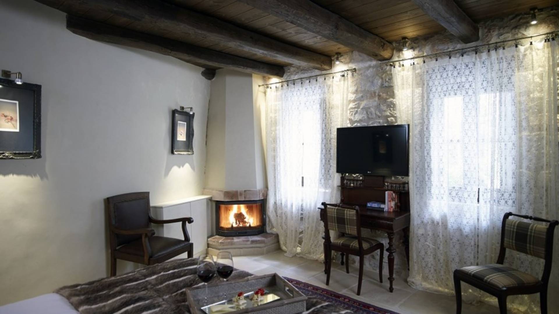 The unique view of the hotel, even from the open-air Hydropool spa, the Polaris ATV rides in the mountain after a rich breakfast, the evening coffee served in the backyard in the summer or by the fireplace in the winter, all can have a relaxing effect on the visitor, awakening his senses. Kastania Suite is a very cozy Junior Suite. It is a one-bedroom room with a beautifully designed fireplace. It is designed and built to provide the utmost satisfaction for our guests. This room features a sumptuous Queen-size American bed with fine linen and goose-down duvets.