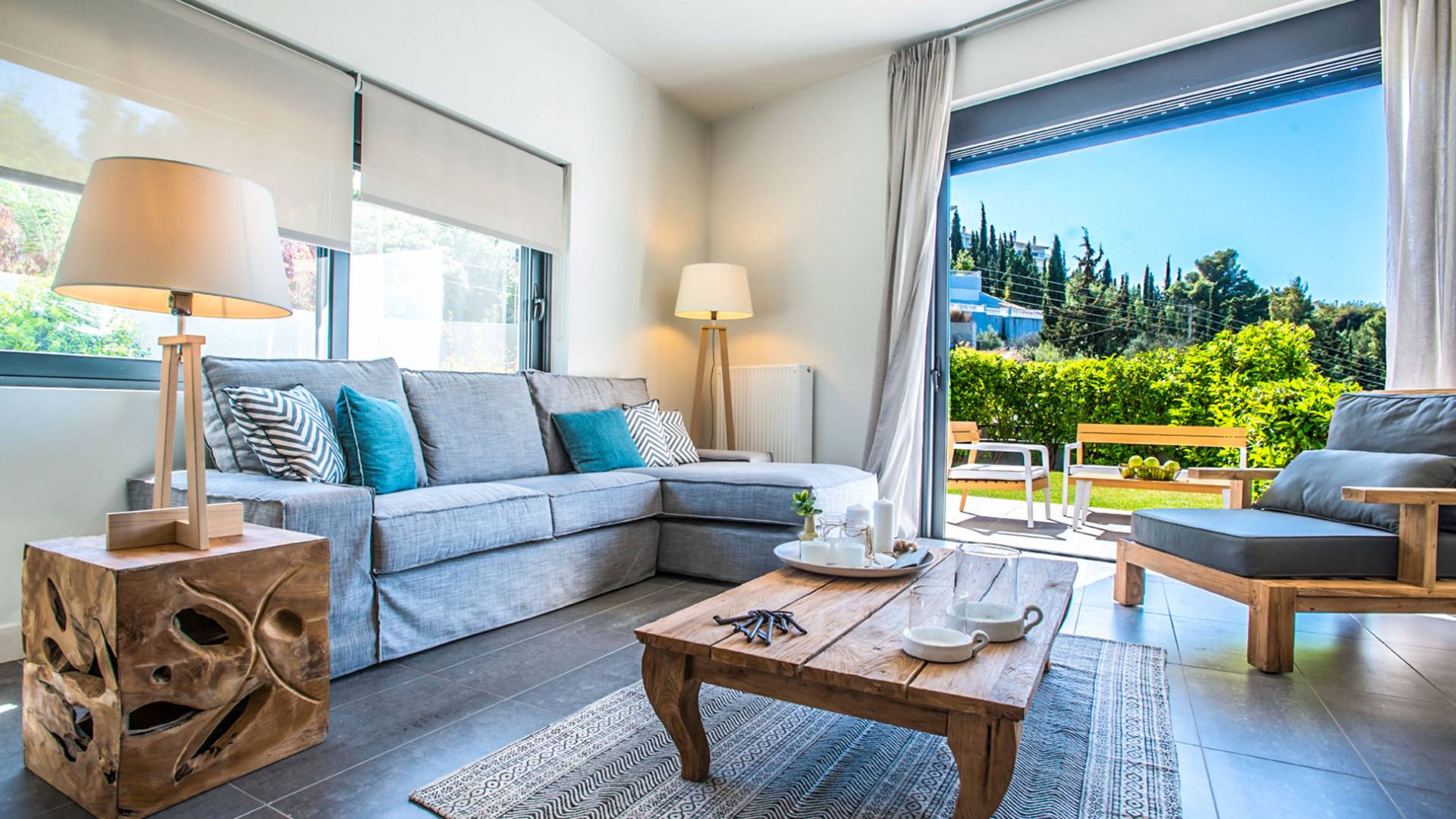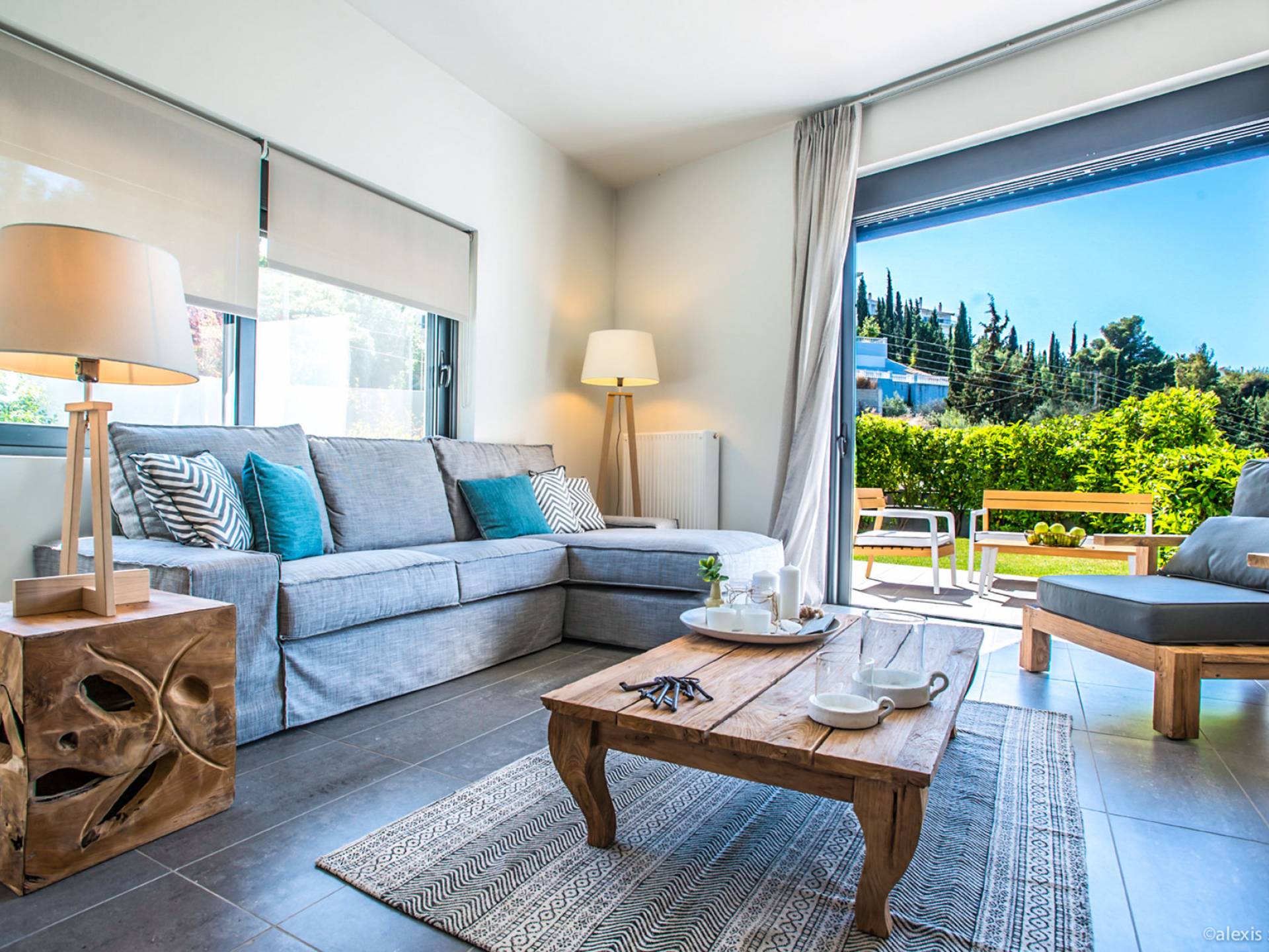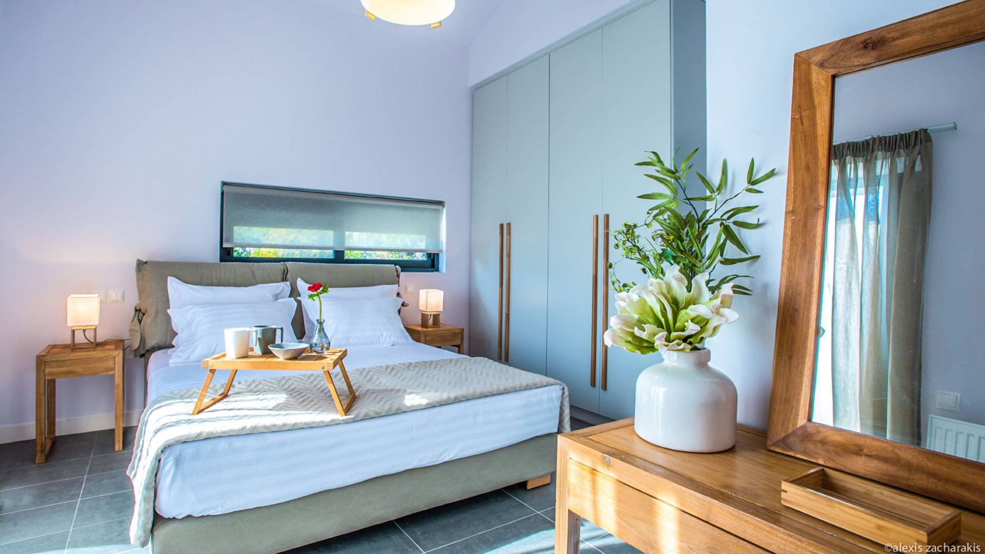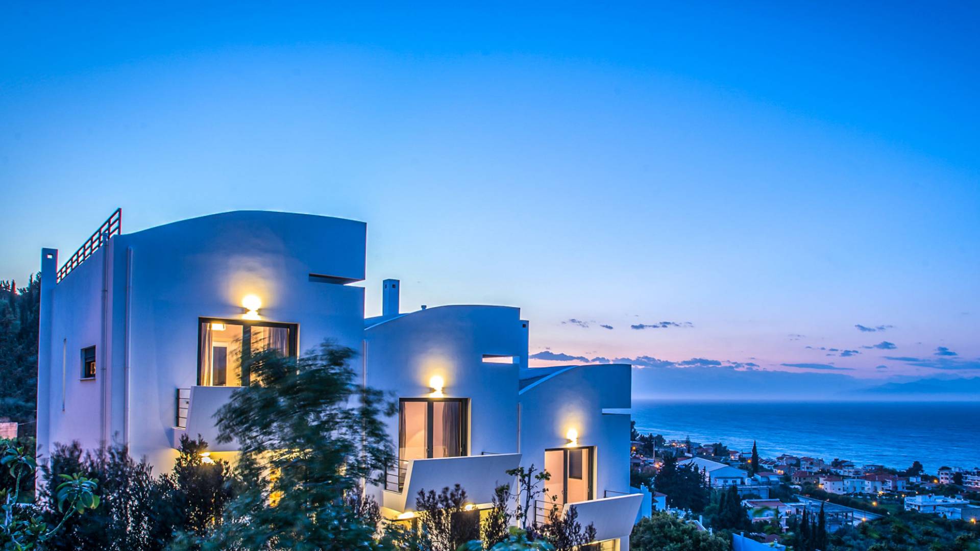 This luxury rental consists of eight bedrooms and can accommodate up to 19 guests. It is located in the picturesque village of Melissi, on the north-east shore of the Corinthian Gulf in the Peloponnese, between Xylokastro and Kiato, you will be amazed by the immediate connection with the surrounding natural beauty and the calmness of the place. The residence faces north-west to offer an amazing panoramic, unobstructed view to the Corinthian Gulf and an unforgettable spectacle every time the glorious Greek sunsets in the sea.