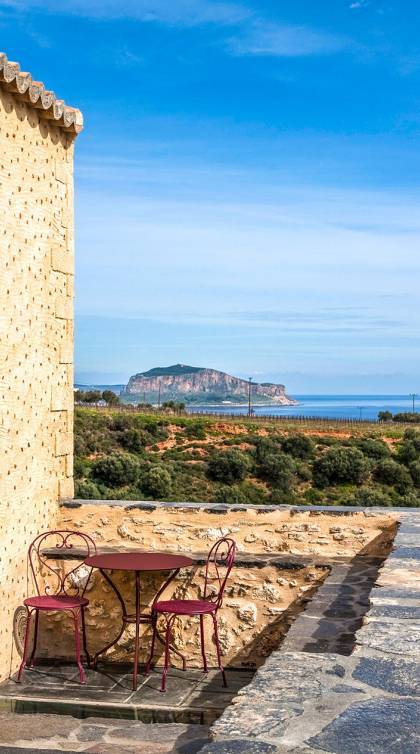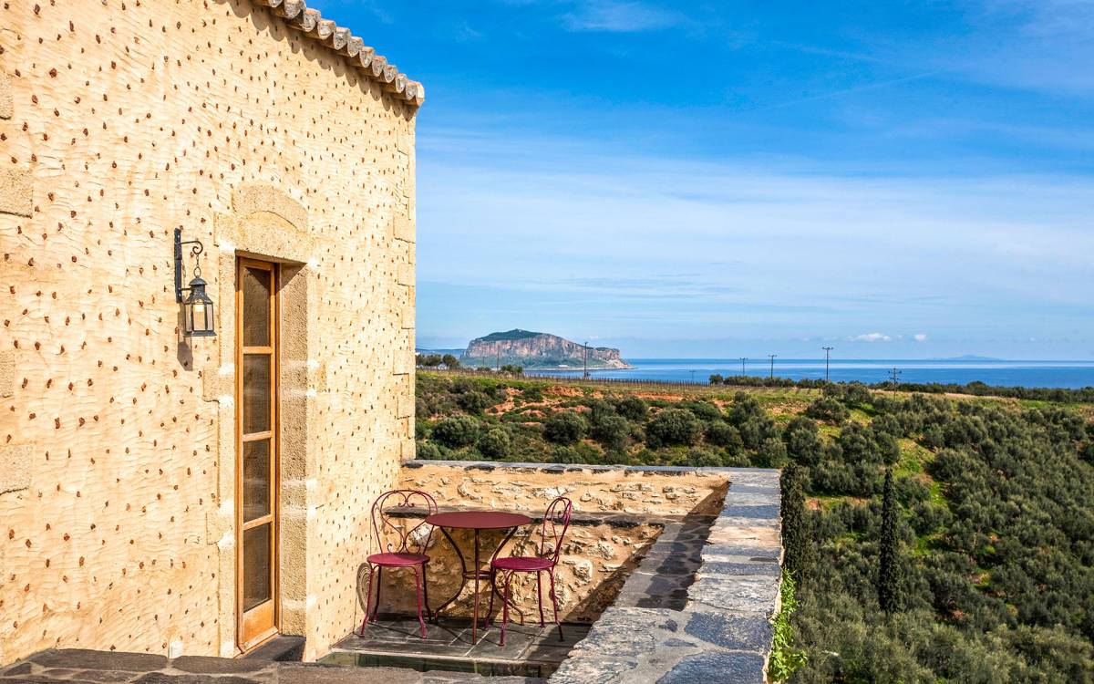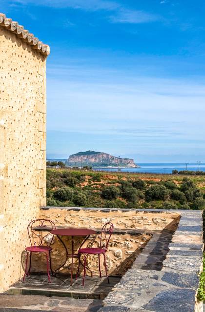 With a view of the medieval fortress town of Monemvasia, which is listed among the ten most popular monuments in Greece (Tripadvisor Traveller’s Choice Awards 2018), the Byzantine-era Kinsterna mansion has been restored with the utmost respect for its long history and now is an entire settlement unto itself, with a central manor house, adjacent out-buildings, and nearby dwellings. At the same time, the owners have also set out to restore the estate’s rich natural environment, emphasizing various traditional agricultural activities such as harvesting grapes, producing olive oil, distilling tsipouro, and making soap –with the aim of making the estate as autonomous and self-sustaining as possible. Today, the Kinsterna produces its own wine, extra-virgin olive oil and table olives, tsipouro (traditional Greek spirits), bread, marmalade and other fruit preserves, soap, and much more. The fruit-bearing trees and fertile vegetable gardens, the beds of aromatic herbs and flowers, and the springs with their fresh, flowing waters all contribute to this ethos and model of sustainability.
