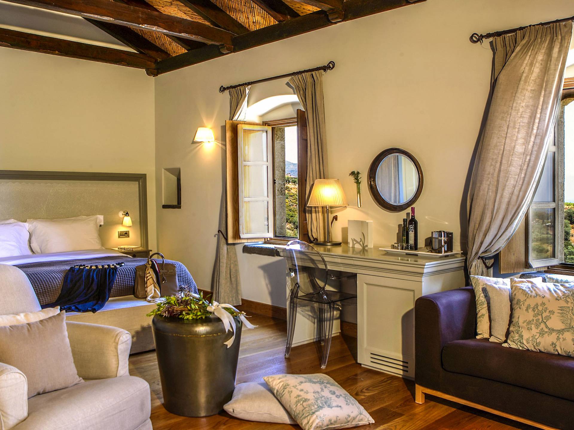 Each and every room is different and unique, with individualized layout, design, styling, and decoration. All the rooms and suites, however, share certain common characteristics, such as traditional hand-made embroideries on the walls, custom headboards and lamps, impressive wooden ceilings covered with herringbone-patterned reeds, luxurious marble baths, traditional wooden doors and shutters, new and antique design objects, top-quality linens and personal-care bath products. At the same time, all rooms come equipped with such modern comforts as flat-screen TV, wireless internet service, king or queen-size beds, and a choice of top-of-the-line pillows from Cocomat.