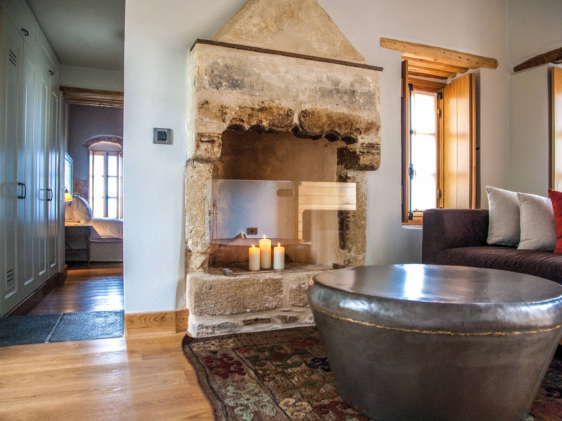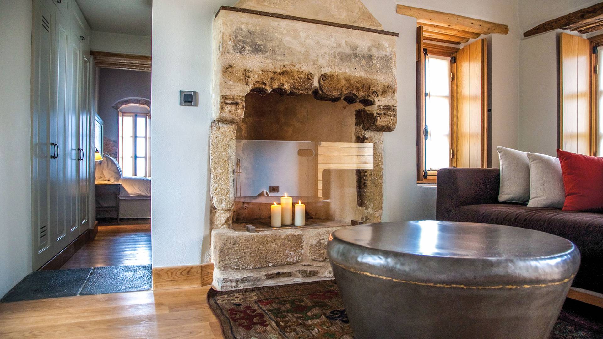 You are sure to appreciate your stay in the Kinsterna Suites, which offer an amazing view of the Aegean Sea and the estate’s private vineyards, while most of the suites have balconies. One of these suites is particularly interesting, thanks to its finely carved old fireplace and a balcony built above the old wine press, where the grapes were most likely trodden for wine, and must be gathered for other uses. The mansion’s defensive cannon was also positioned here (Kinsterna Suite 39).