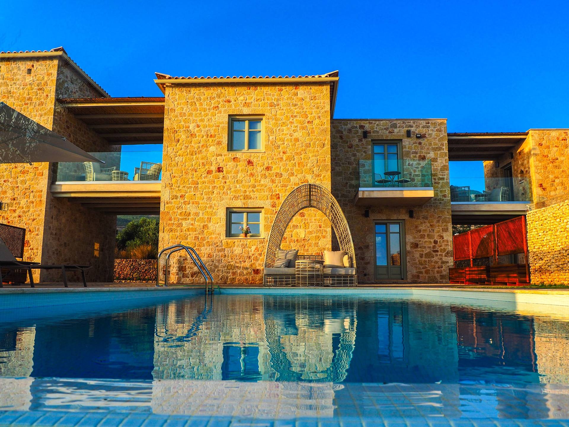 Katergo Luxury Villas Stoupa consists of 3 independent stone houses with a special style of architecture, located just 800 meters from the famous beach of Stoupa (Kalogria). Each villa has a spacious living room with a fully equipped kitchen and a private pool.