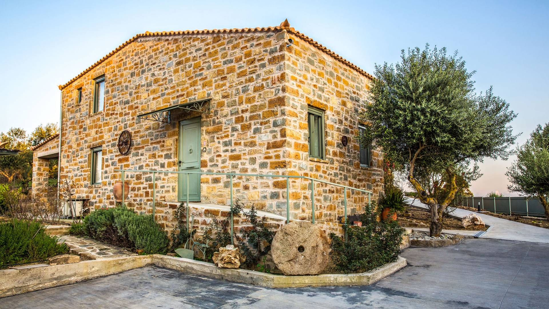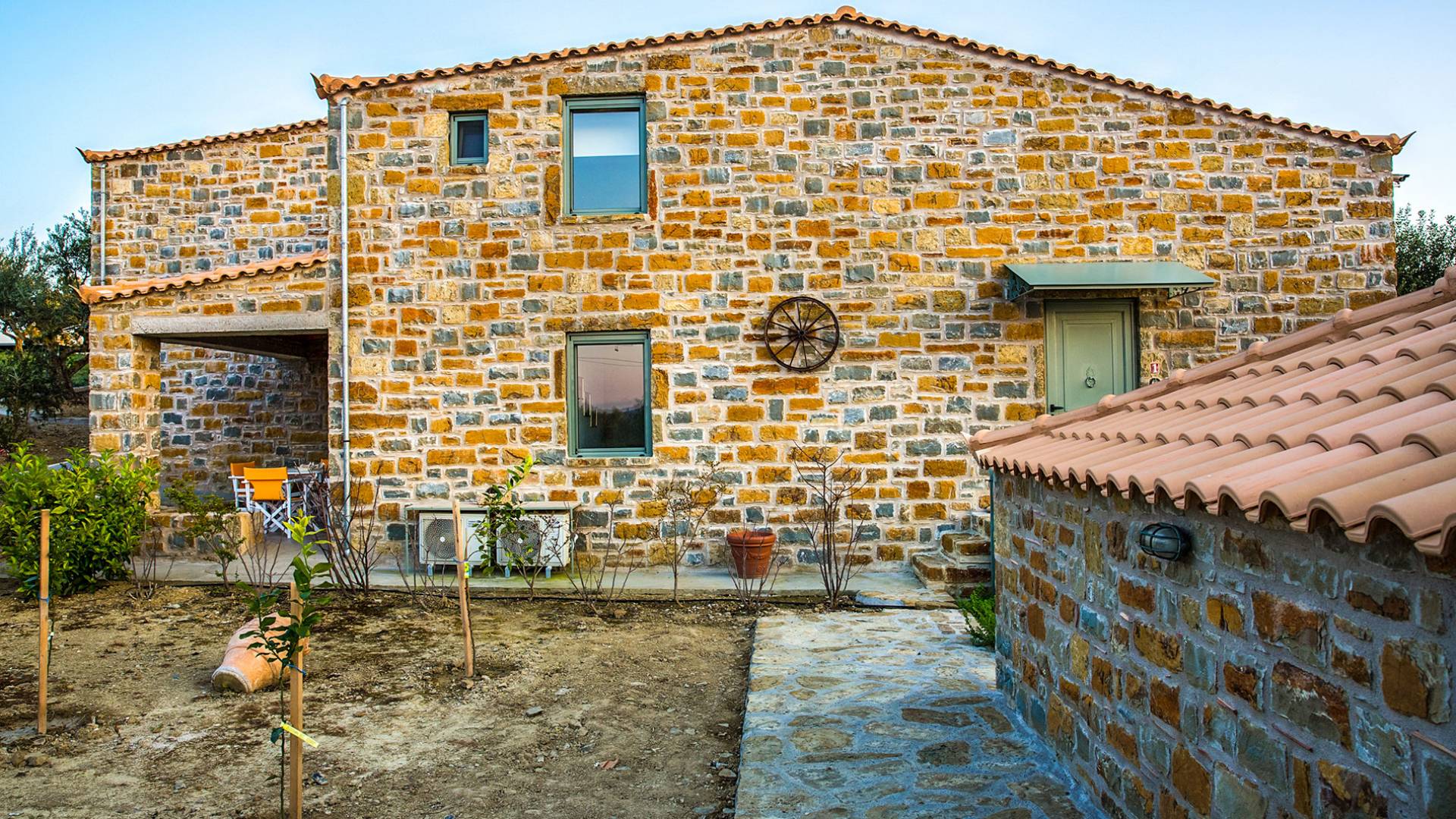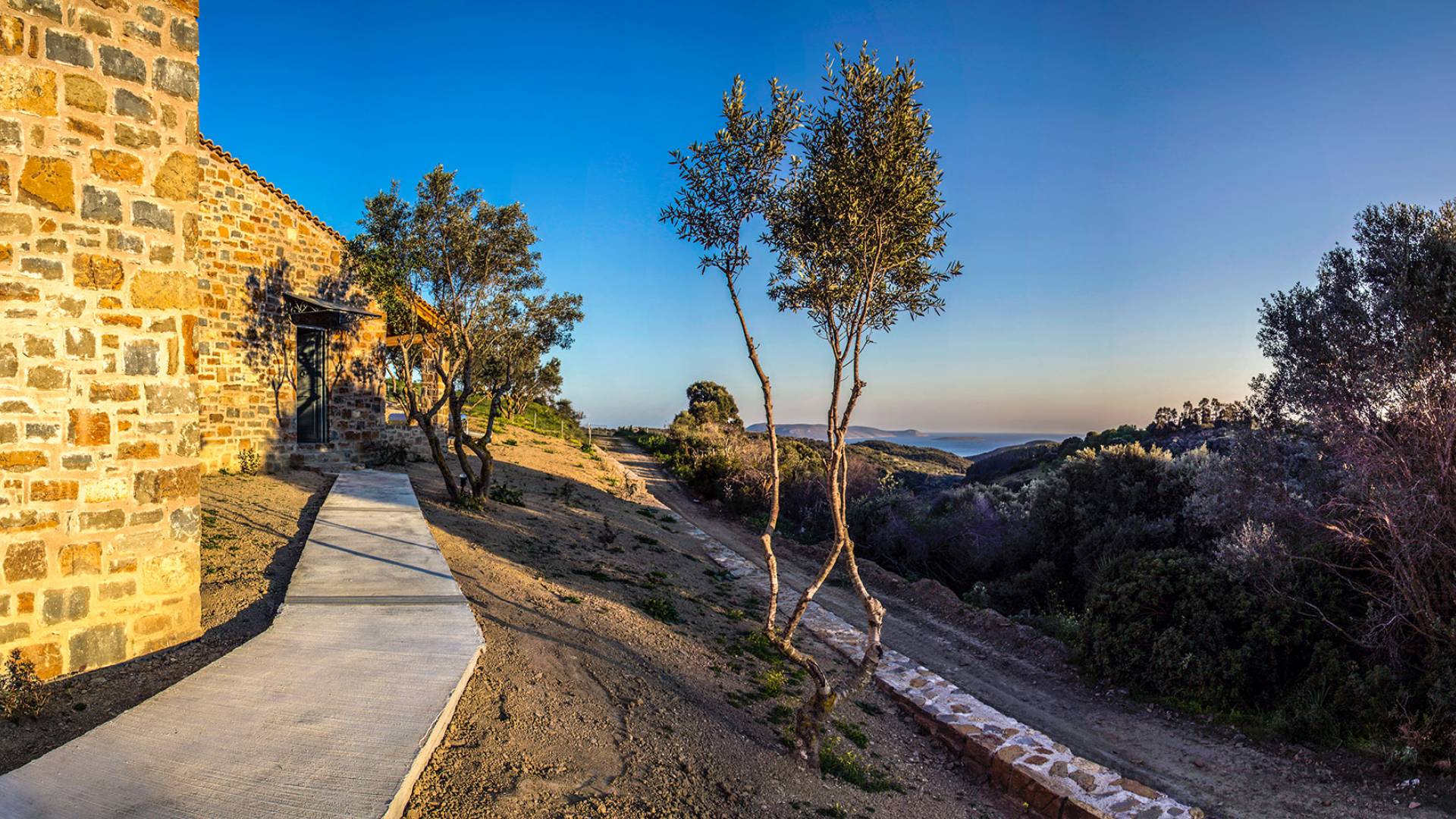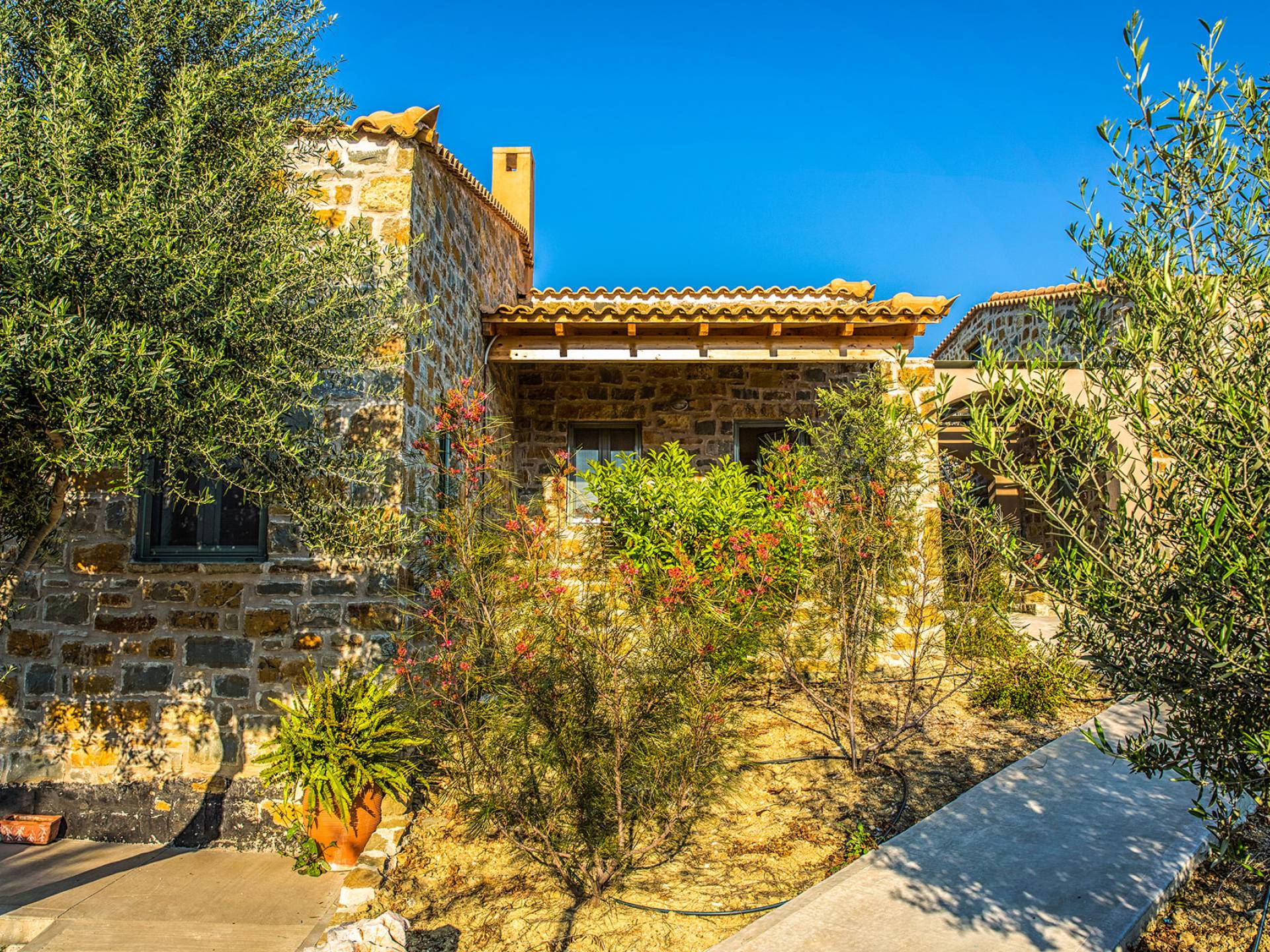 Surrounded by endless rows of silver-green olives trees, Afentiko Pigadi’s four independent villas are located on a serene hillside overlooking the Ionian sea. Made from local stone sourced in nearby areas and with great respect to the unique Peloponnesian landscape, the villas are designed as a natural continuation of their surroundings. The famous perennial olive groves, mix with Afentiko Pigadi’s herb garden. The smell of lavender, thyme and oregano surround the visitor, and the eye travels from the small bunches of orange and lemon trees down to the crystal clear blue of the sea and Methoni’s little islands – Sapienza, Agia Marina, and Schiza.