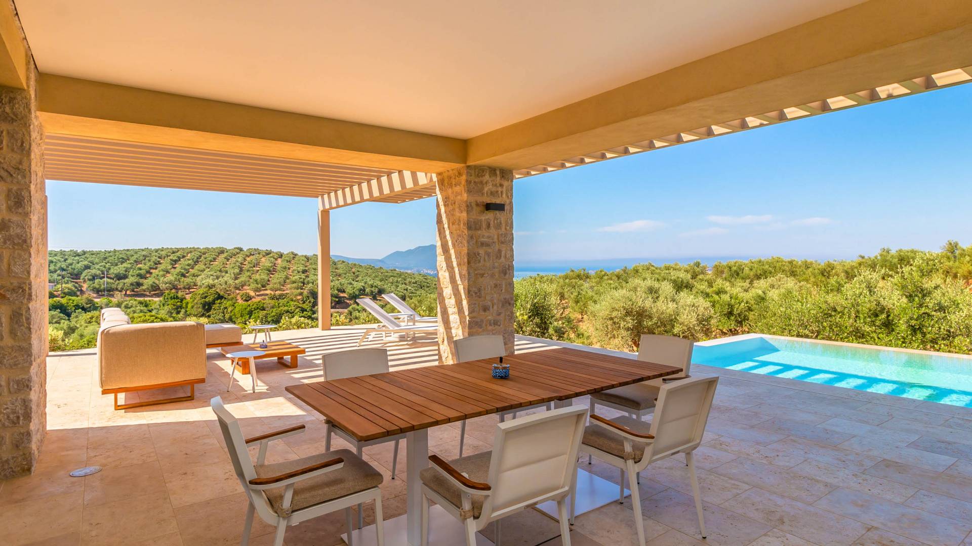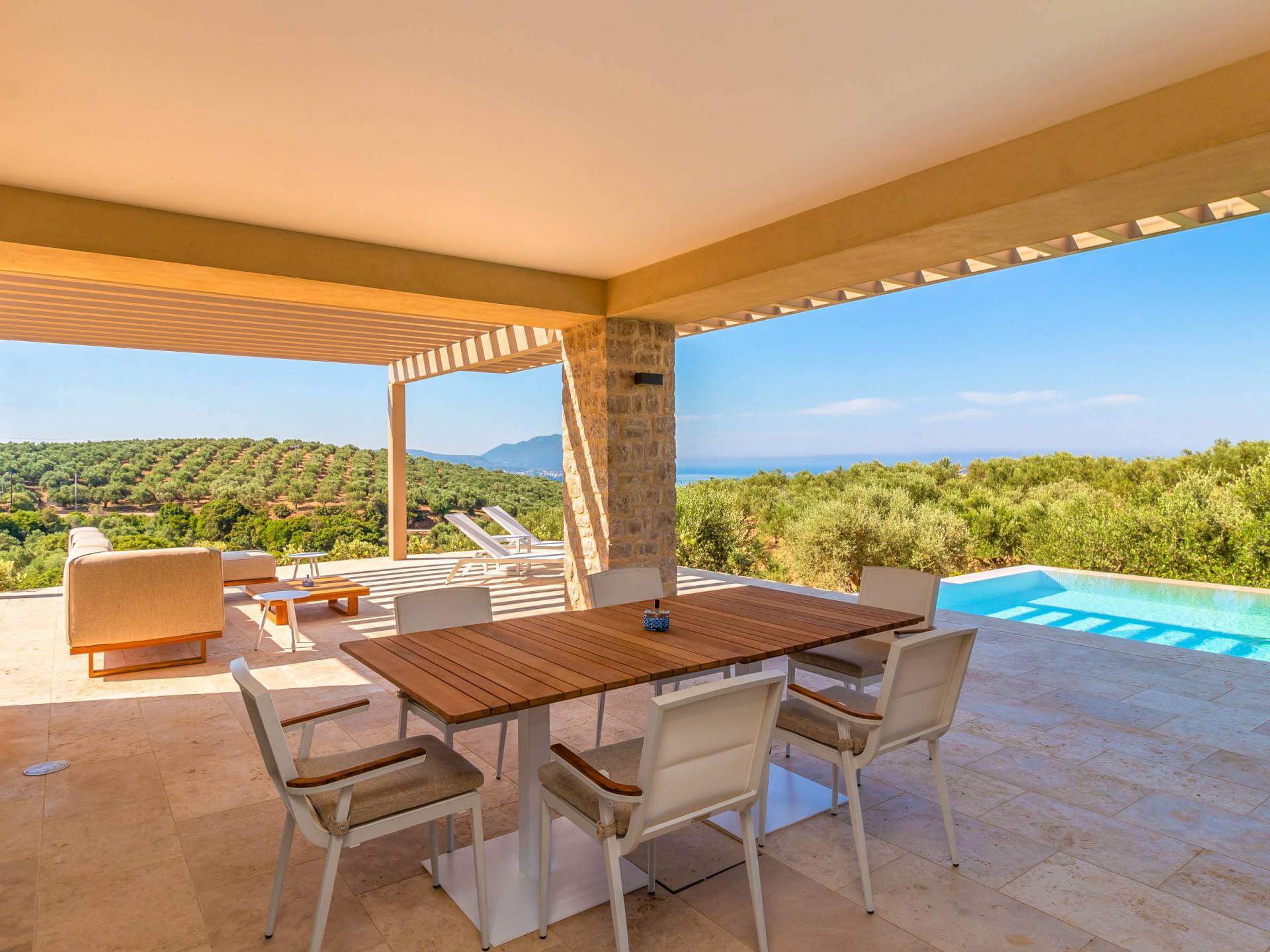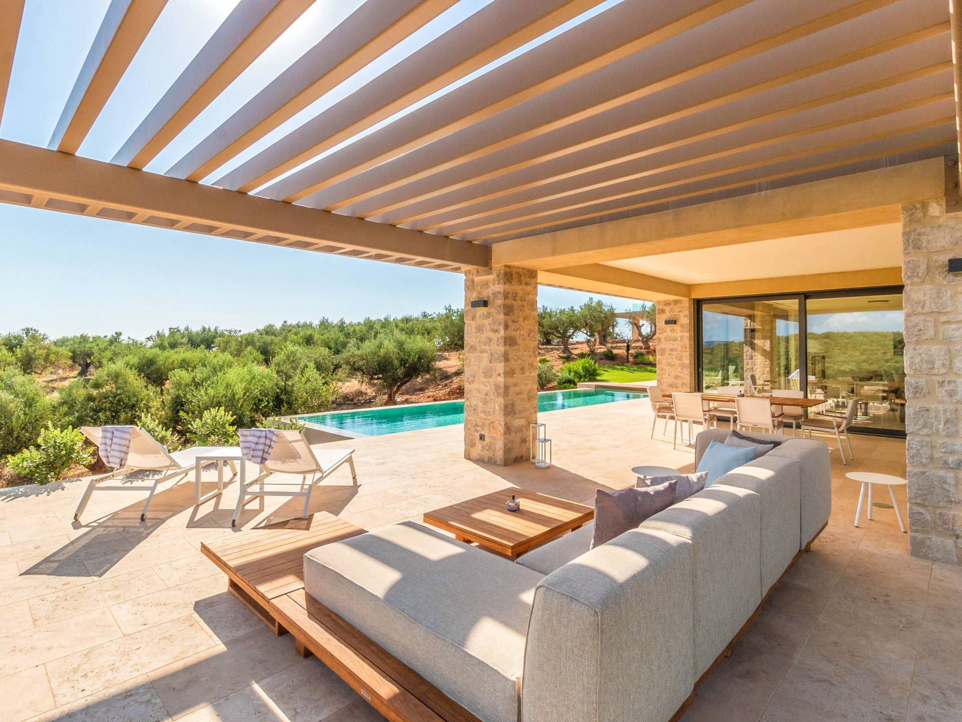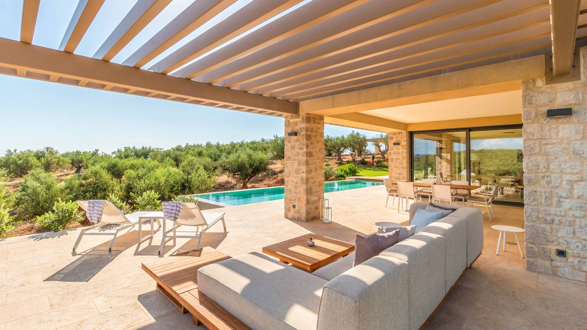 Villa Coral features a cleverly designed outdoor space, including a private pool area, a pergola-covered lounge, and a dining area. Its supreme location on top of the hills gives an impression of total privacy since it is situated in the middle of an olive tree grove. Nevertheless, the beaches, restaurants, and the proclaimed Navarino golf courses are just a few minutes' drive away.