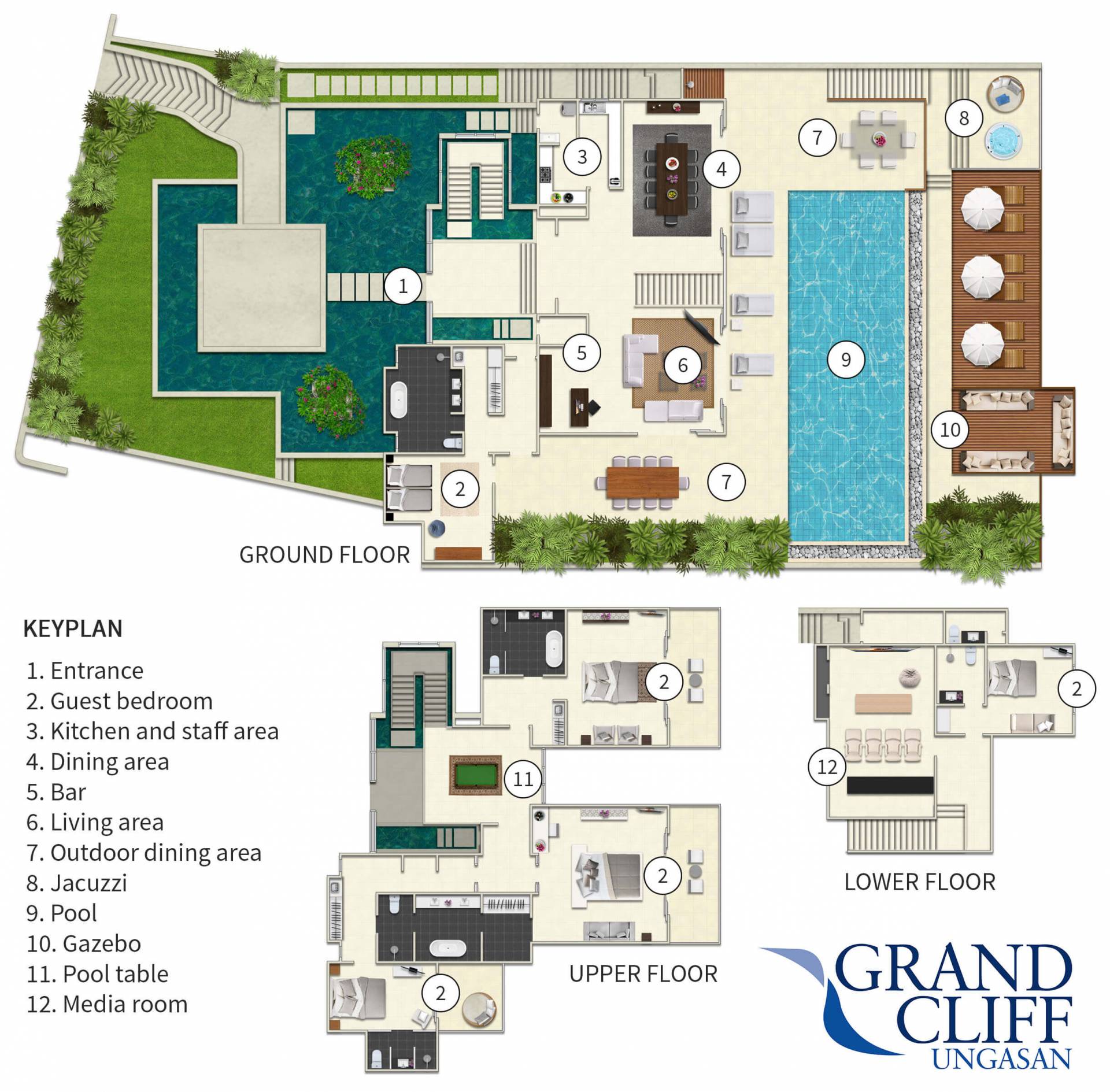 Sheltered by lavish green gardens and endearing facilities Villa Grand Cliff Ungasan is an escapade for aficionados and life devotees. A unique five-bedroom residence with a magnificent view of the ocean and a 20x8 meter private infinity pool boasts its wide terraces and balcony view, comfortable cinema room, billiard table, and a lower deck with a jacuzzi tub.