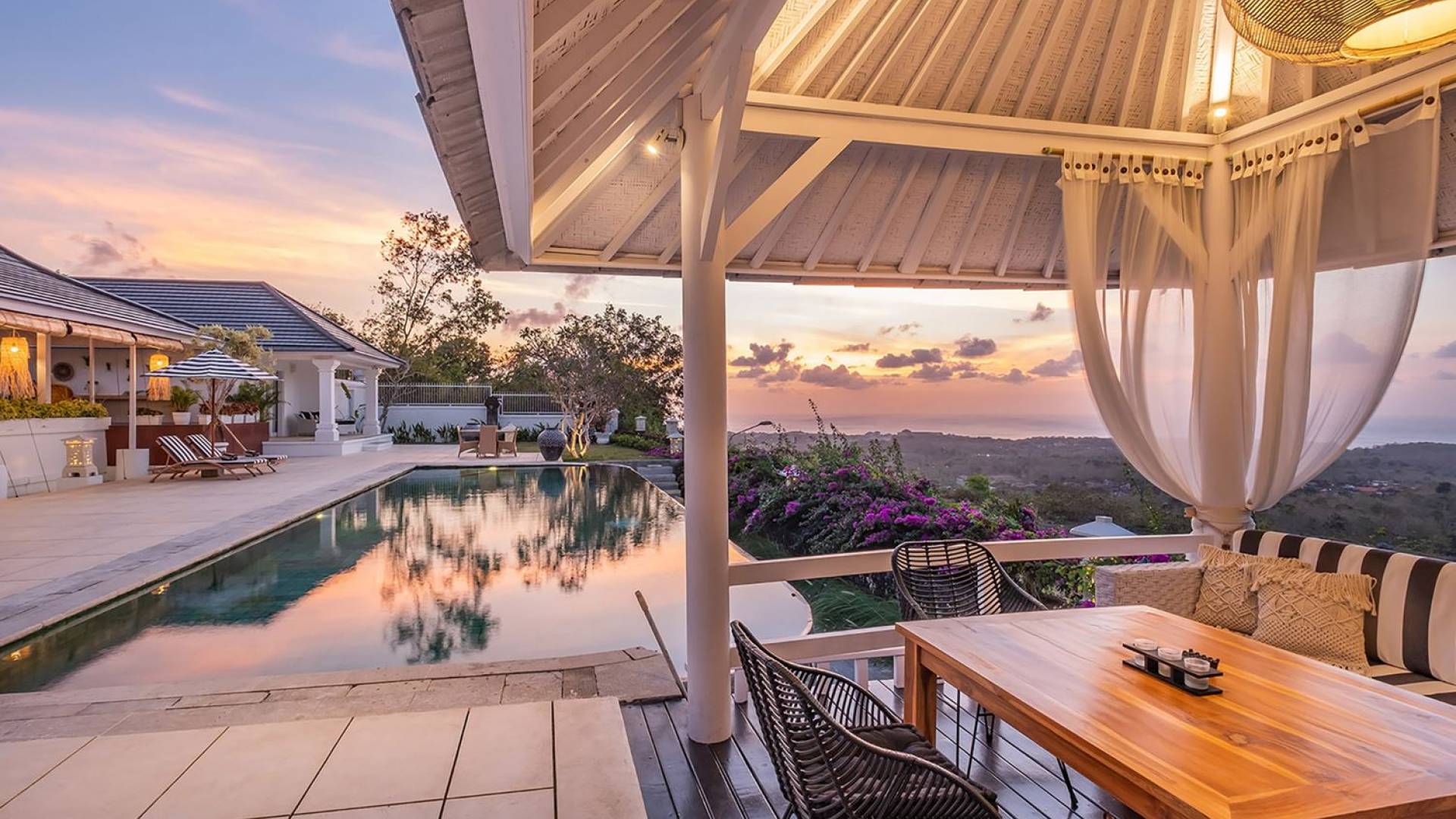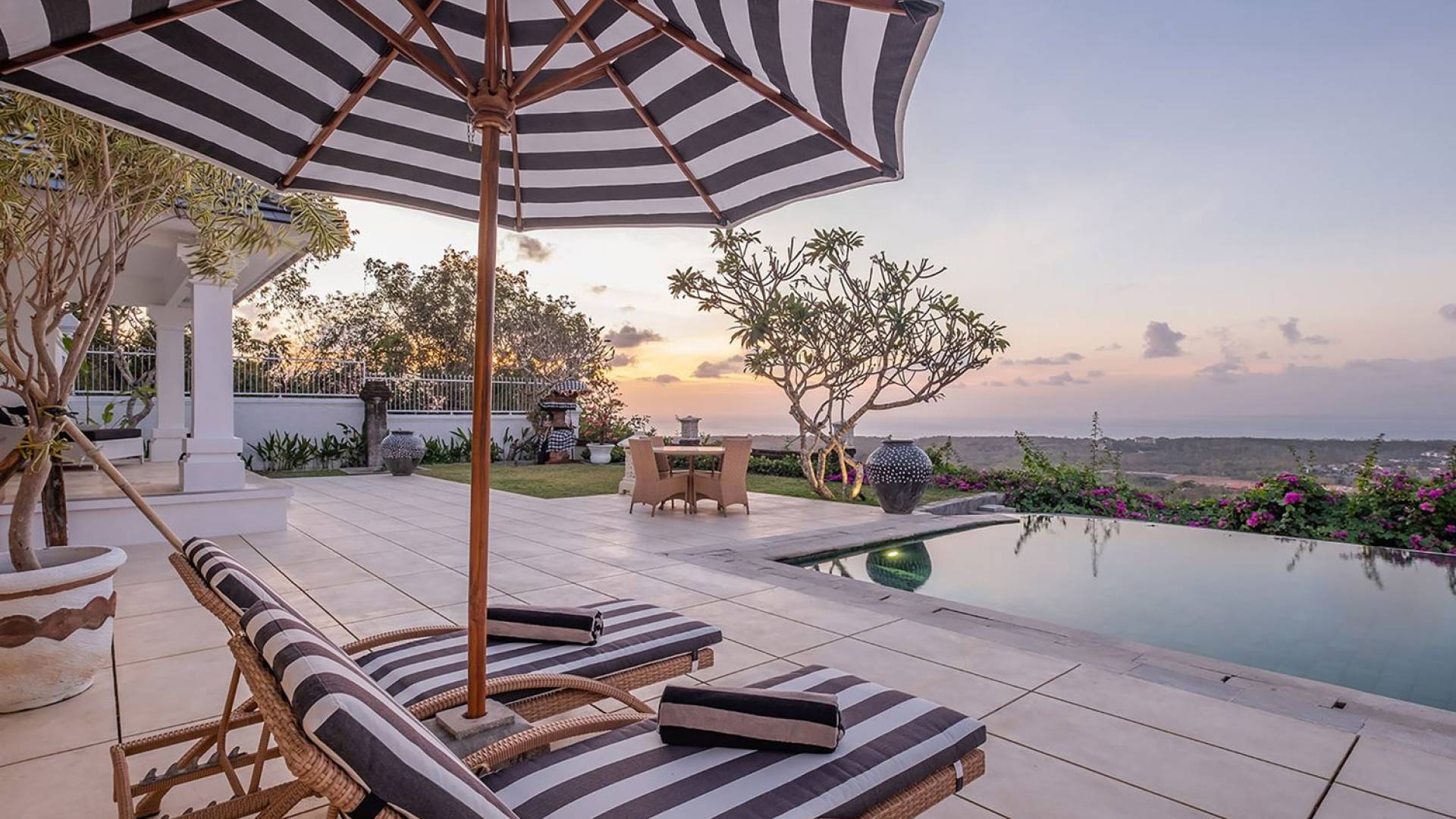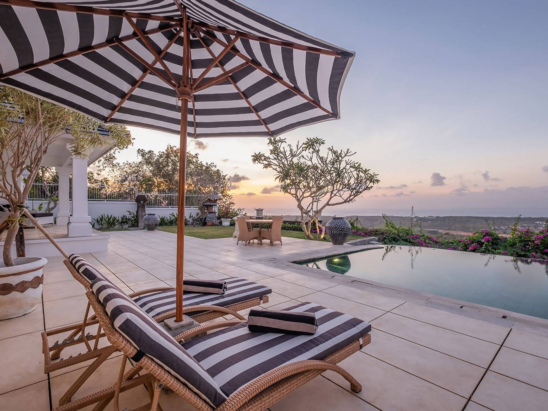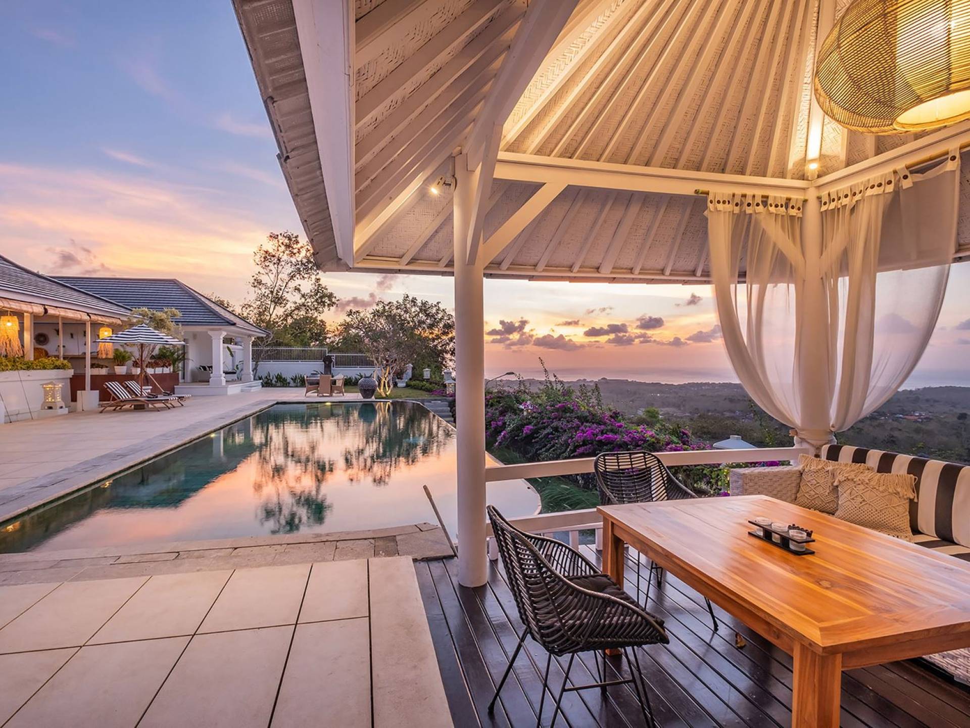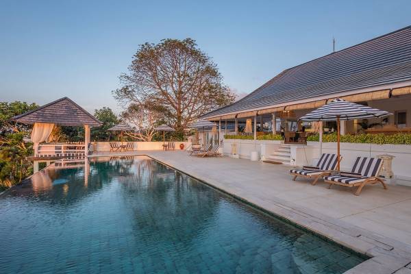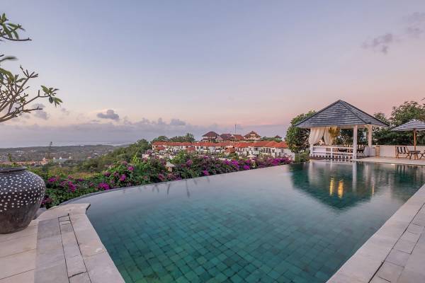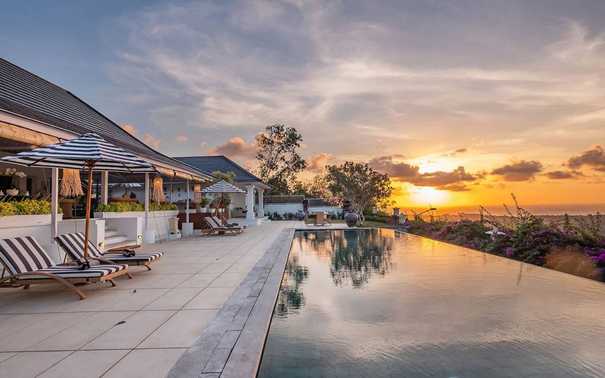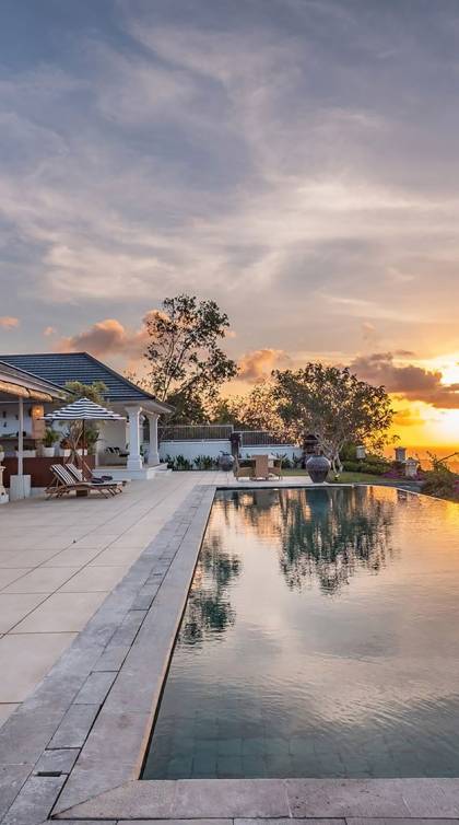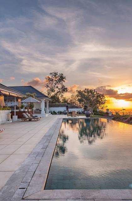 Puri Balangan Bali is a luxury villa rental with 4 bedrooms and private pool. Perched on a clifftop overlooking the beautiful Bukit peninsula, the vast Indian Ocean and Bali’s stunning western shores, the fully-staffed four-bedroom Villa Puri Balangan boasts some of the most spectacular vistas on the island. With its traditional joglo-style architecture, sumptuous ocean-view ensuite bedrooms and stylishly designed open-air living areas, this is a dazzling home for families or a group of friends wanting to explore this alluring corner of Bali. Its gorgeous infinity pool, sloped tropical gardens and incredible panoramas make this villa a wonderfully photogenic venue for weddings, anniversaries or other special occasions.
