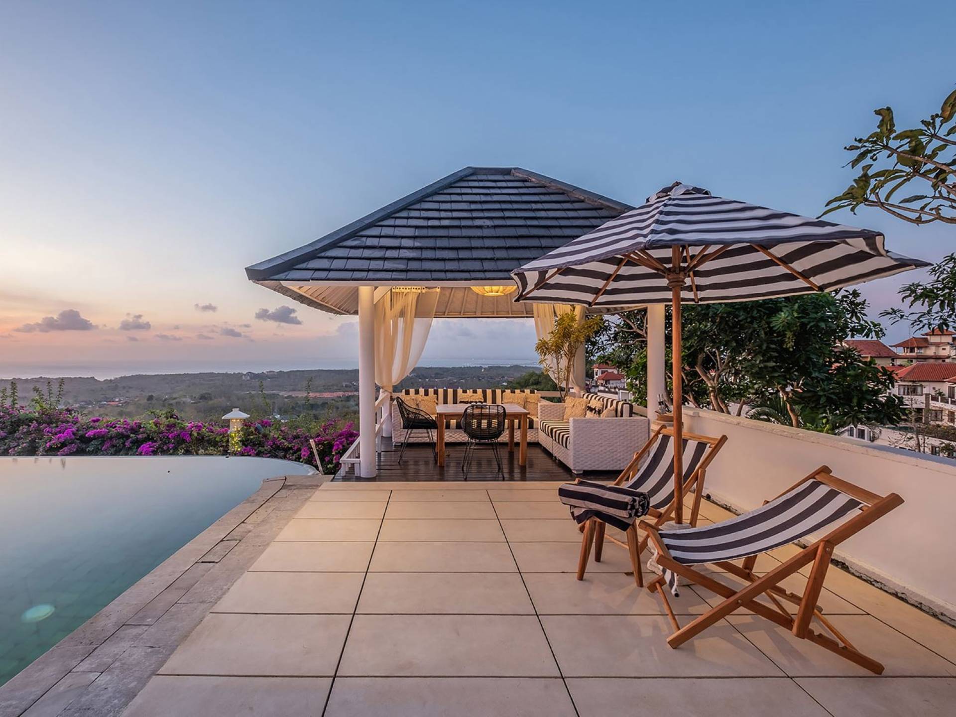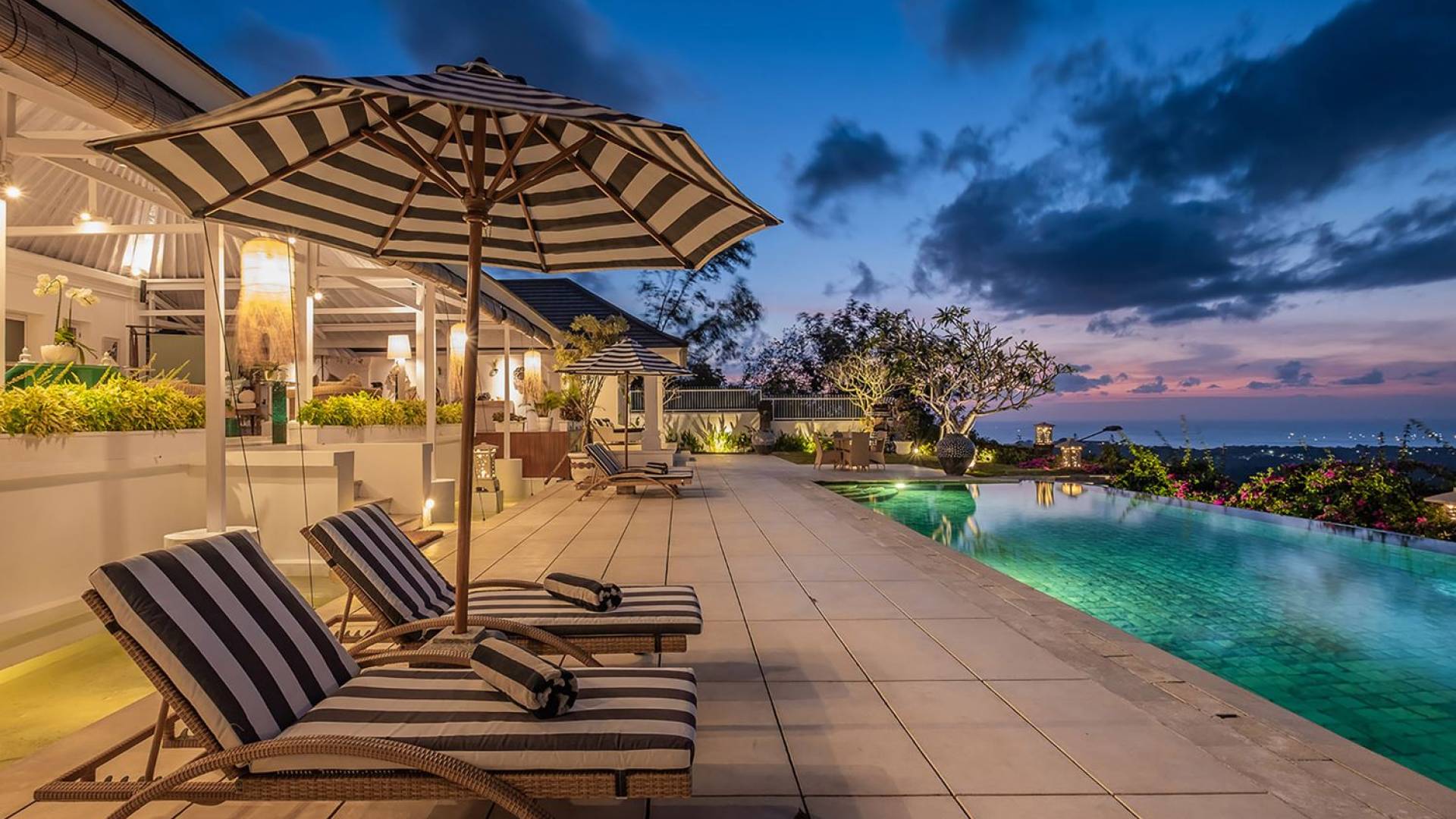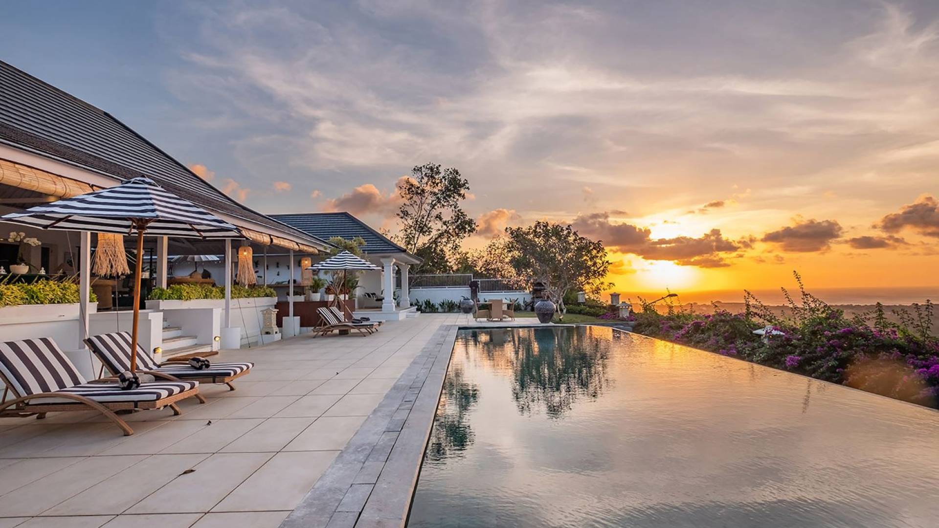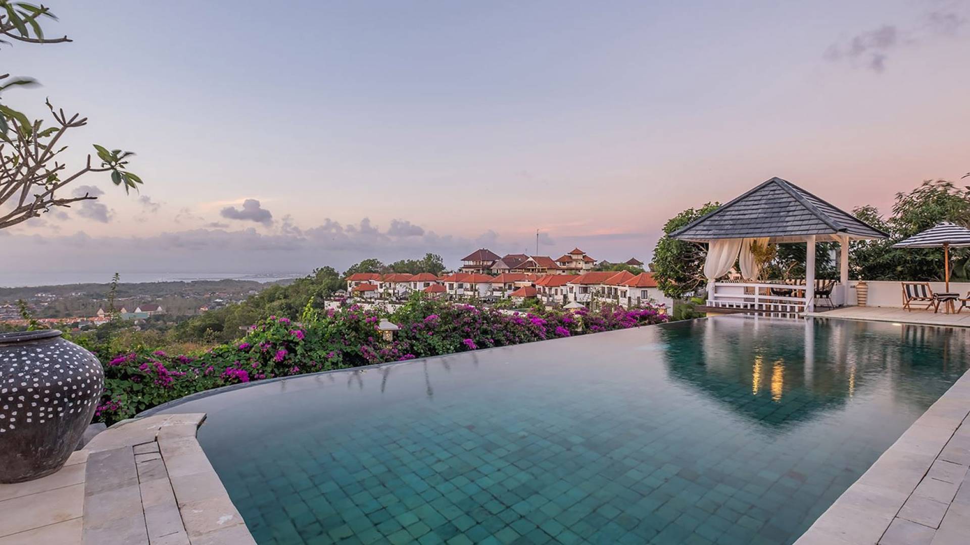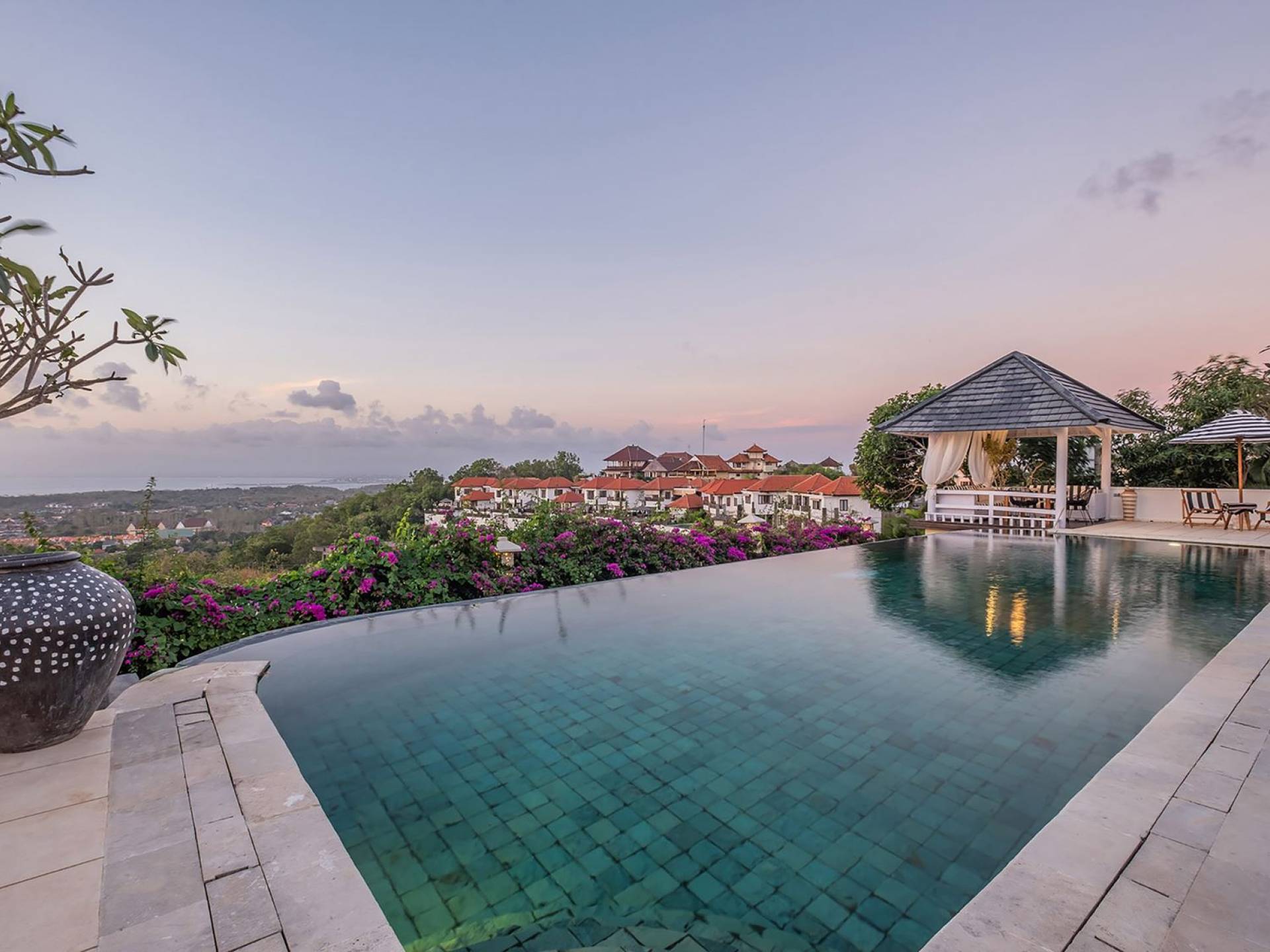 Puri Balangan Bali is a luxury villa rental with 4 bedrooms and private pool. Perched on a clifftop overlooking the beautiful Bukit peninsula, the vast Indian Ocean and Bali’s stunning western shores, the fully-staffed four-bedroom Villa Puri Balangan boasts some of the most spectacular vistas on the island. With its traditional joglo-style architecture, sumptuous ocean-view ensuite bedrooms and stylishly designed open-air living areas, this is a dazzling home for families or a group of friends wanting to explore this alluring corner of Bali. Its gorgeous infinity pool, sloped tropical gardens and incredible panoramas make this villa a wonderfully photogenic venue for weddings, anniversaries or other special occasions.