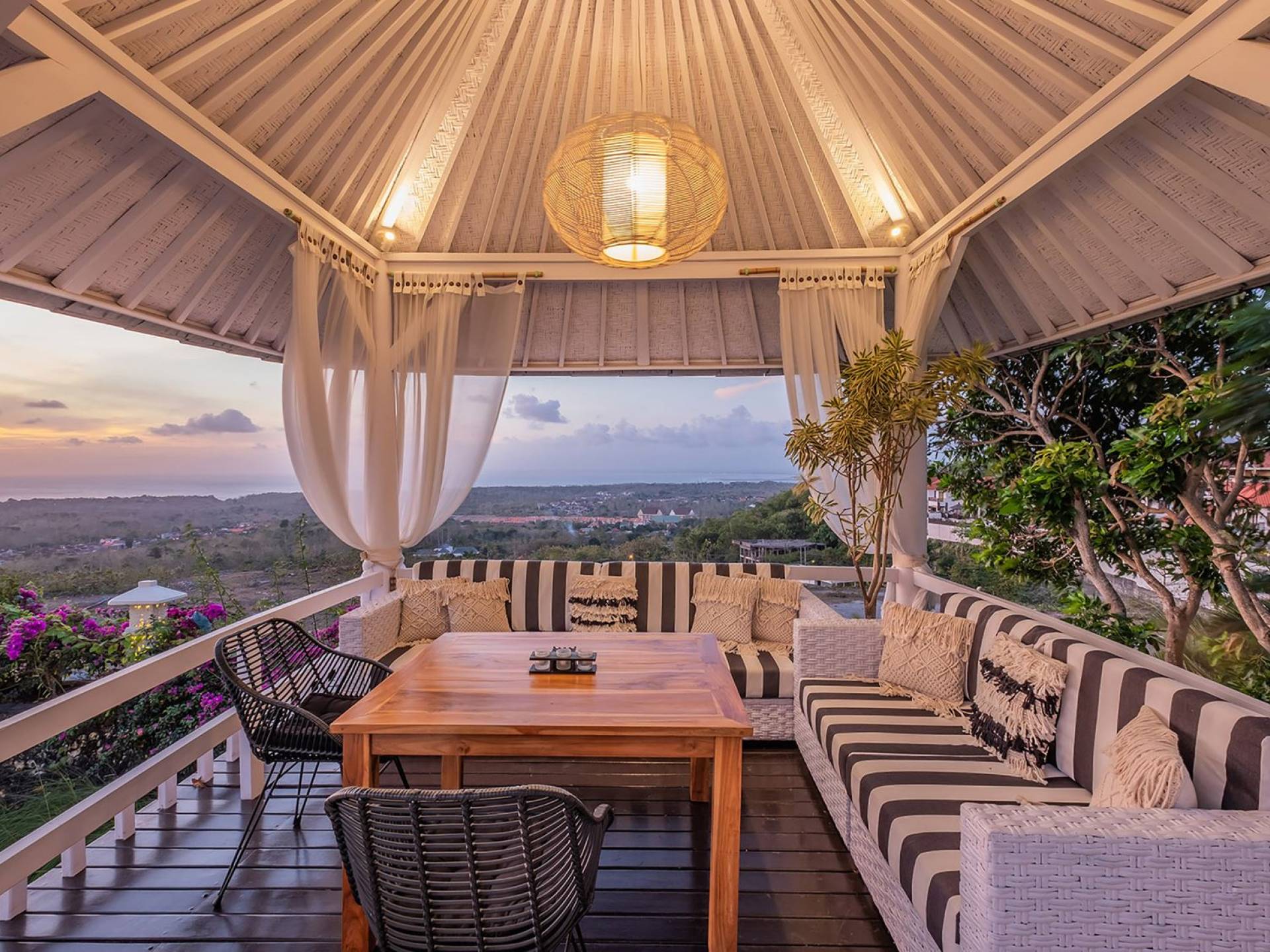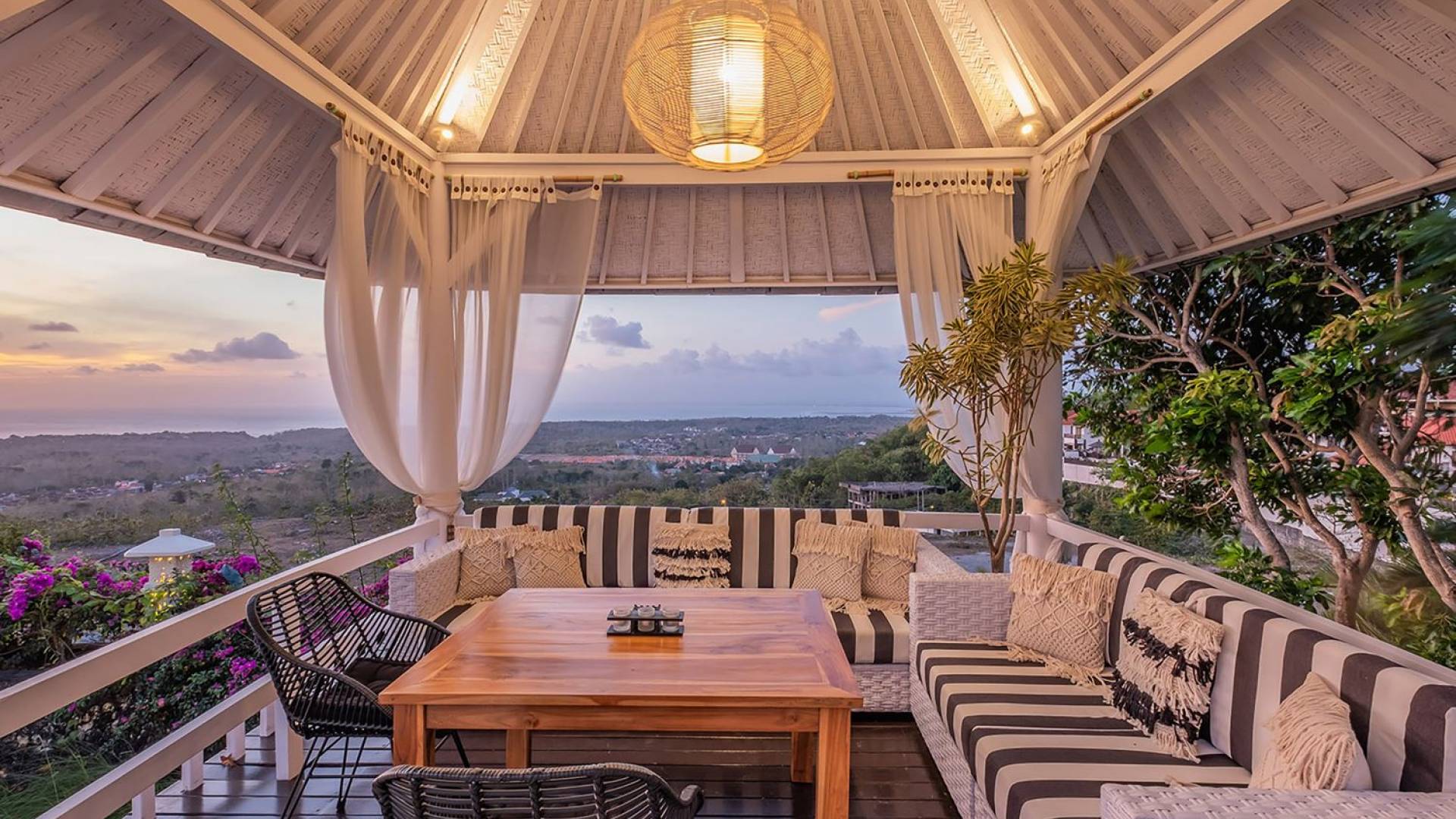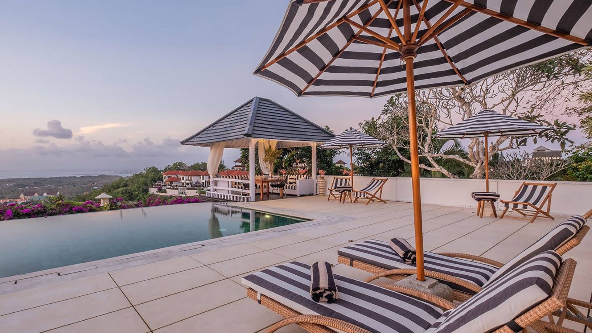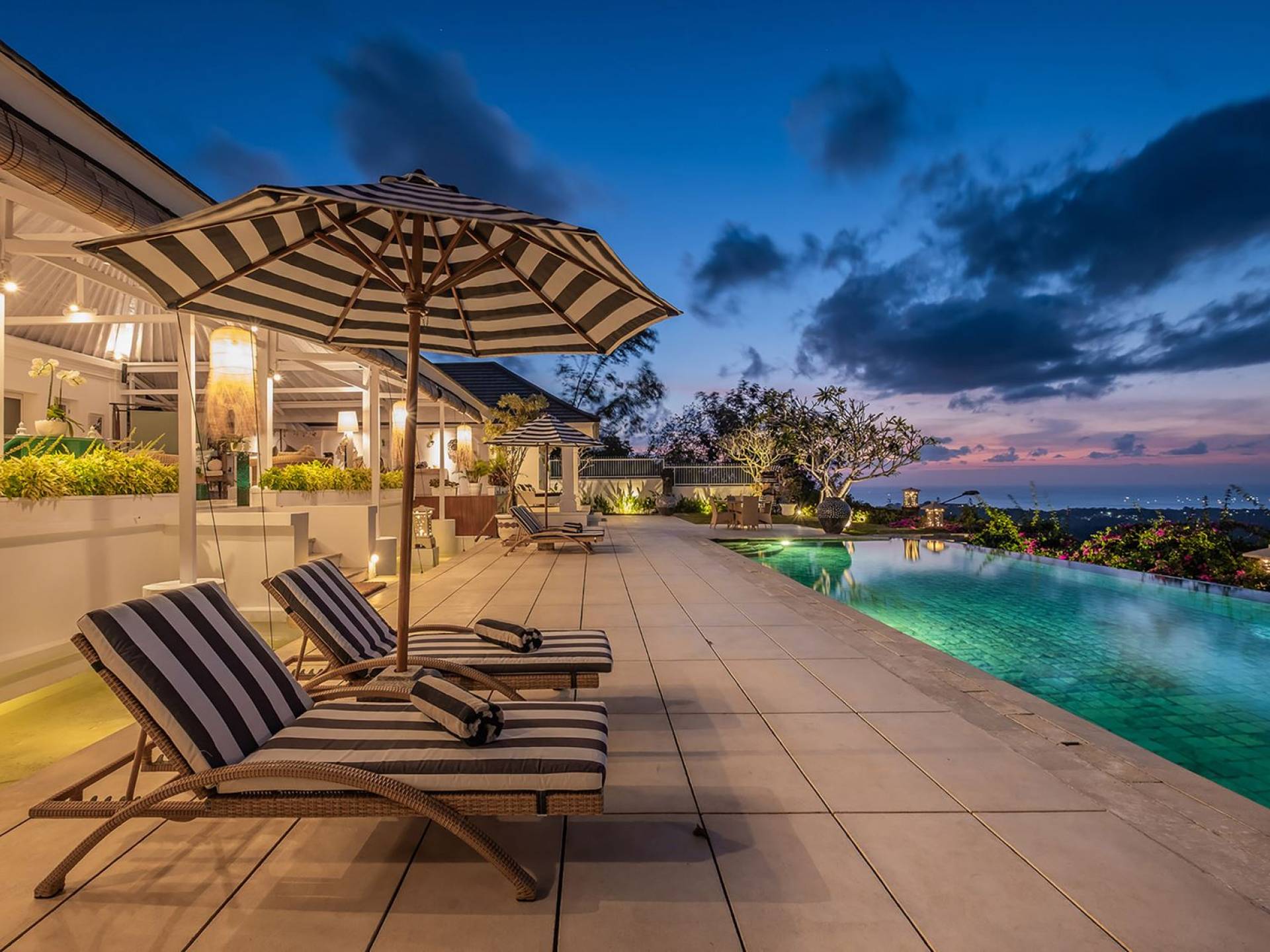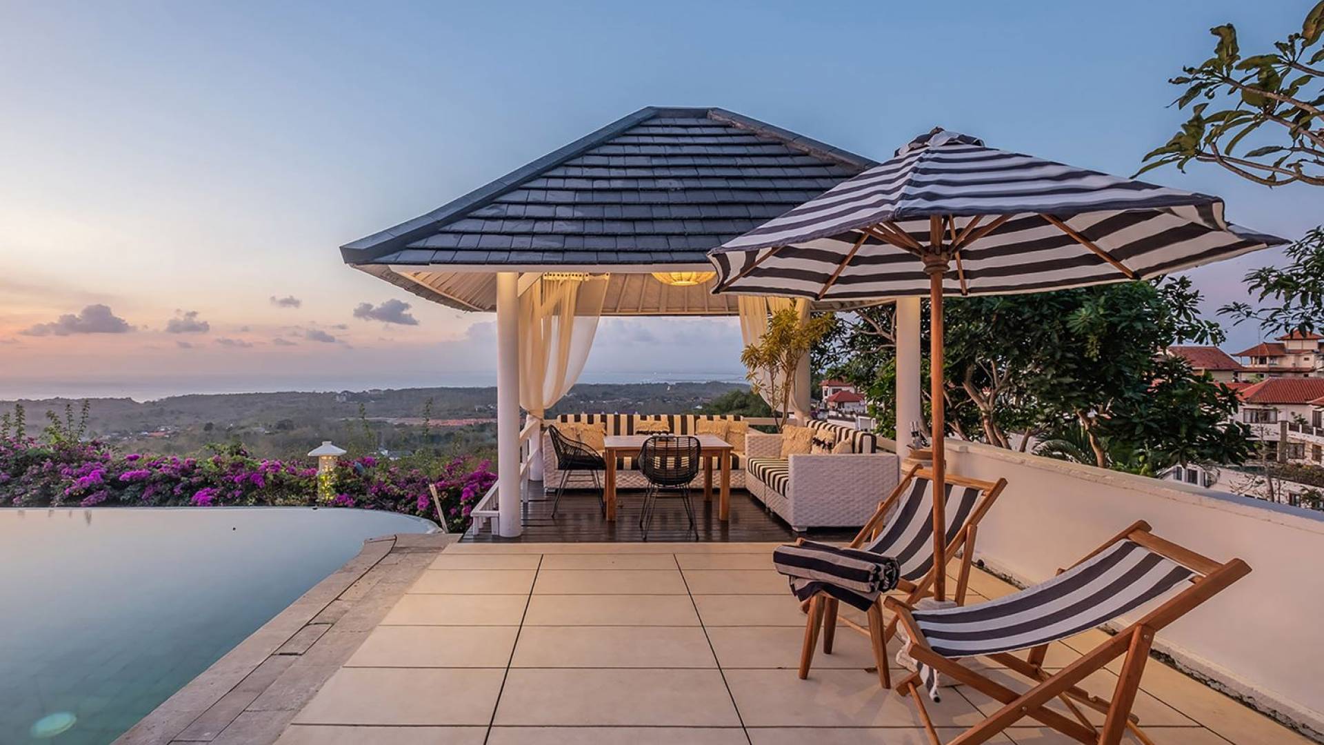 Puri Balangan Bali is a luxury villa rental with 4 bedrooms and private pool. Perched on a clifftop overlooking the beautiful Bukit peninsula, the vast Indian Ocean and Bali’s stunning western shores, the fully-staffed four-bedroom Villa Puri Balangan boasts some of the most spectacular vistas on the island. With its traditional joglo-style architecture, sumptuous ocean-view ensuite bedrooms and stylishly designed open-air living areas, this is a dazzling home for families or a group of friends wanting to explore this alluring corner of Bali. Its gorgeous infinity pool, sloped tropical gardens and incredible panoramas make this villa a wonderfully photogenic venue for weddings, anniversaries or other special occasions.