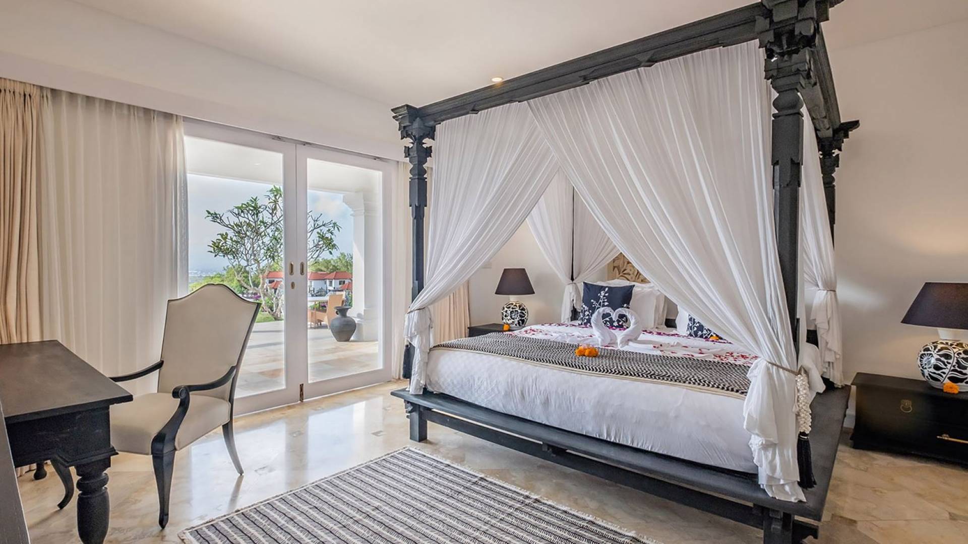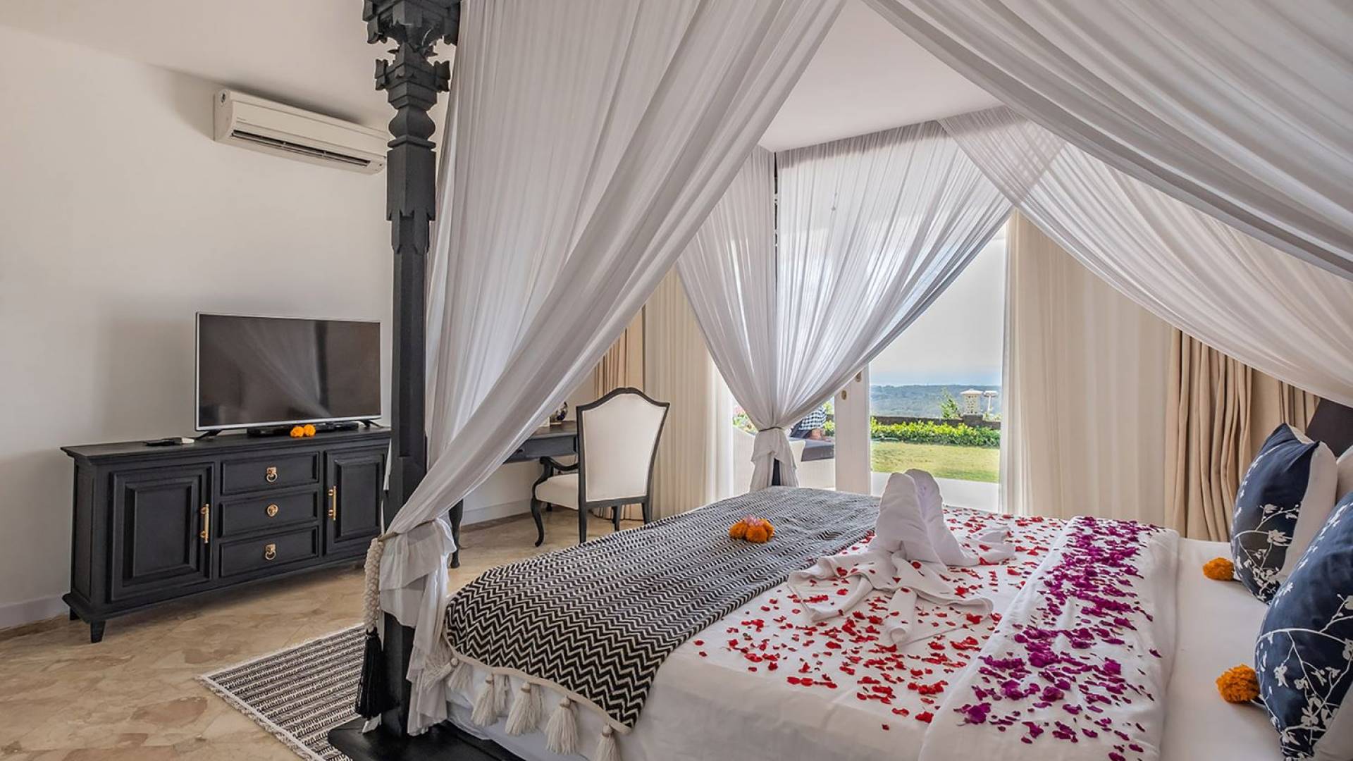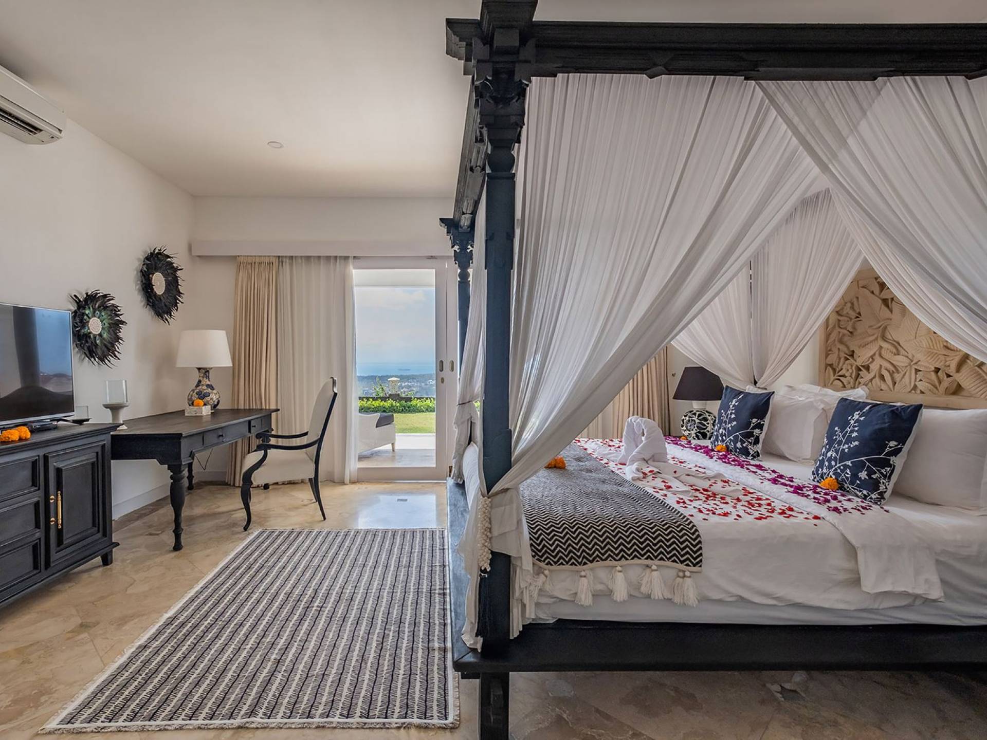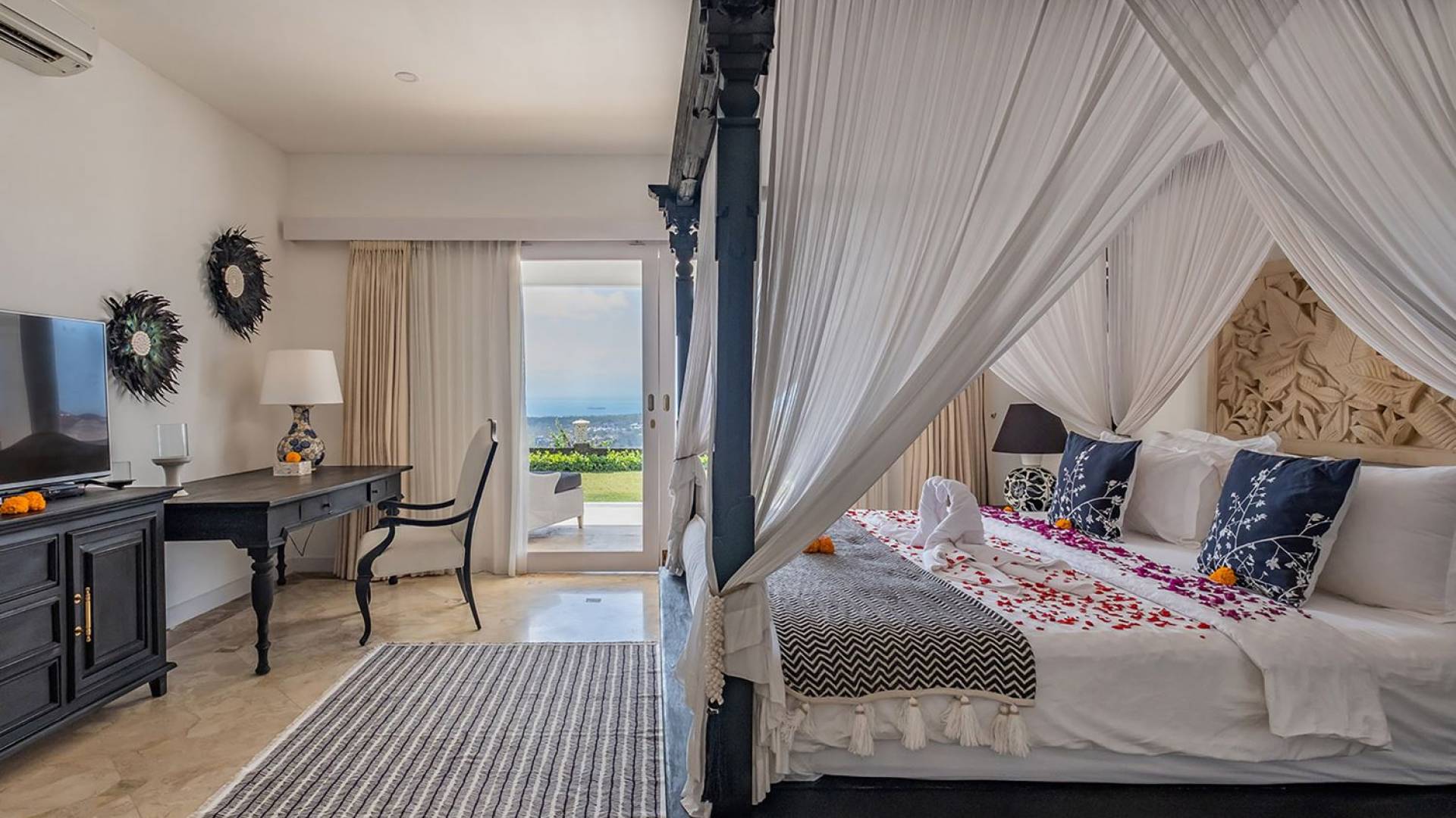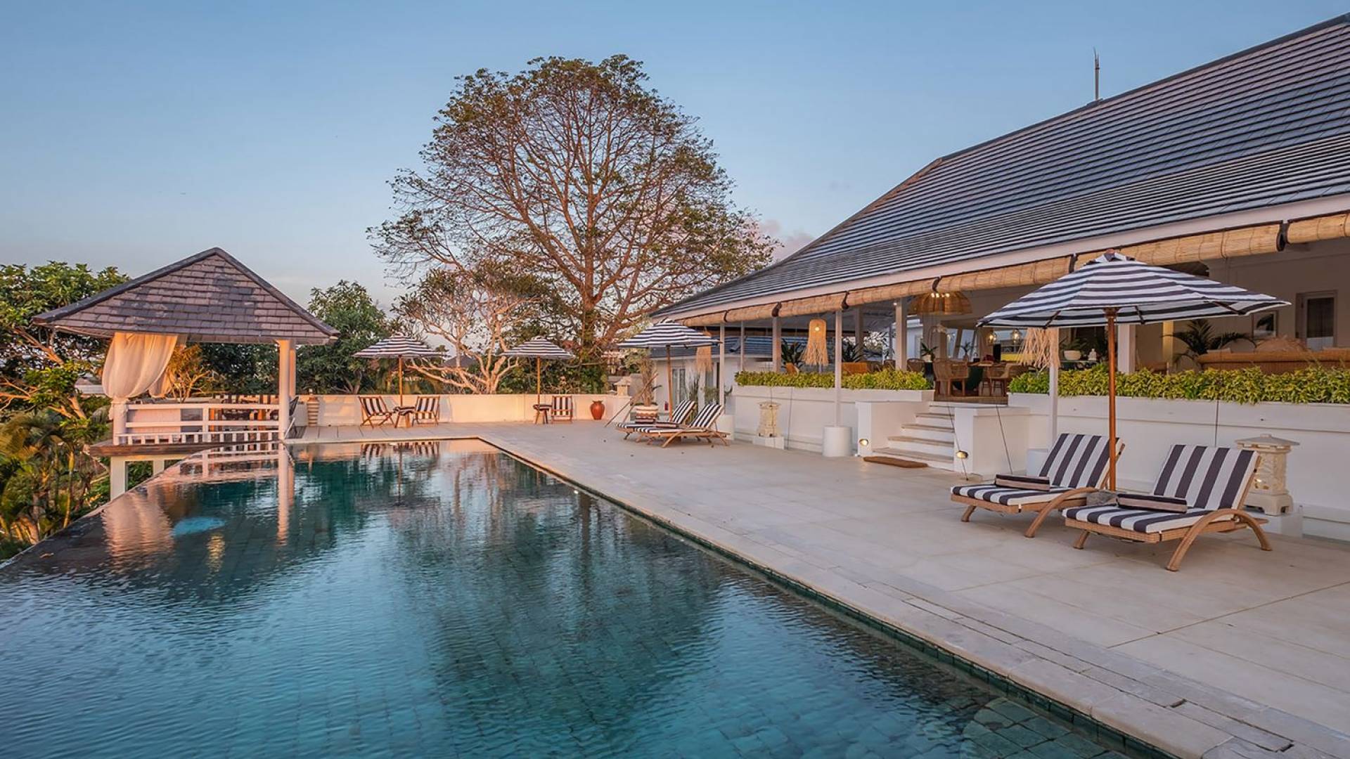 Puri Balangan Bali is a luxury villa rental with 4 bedrooms and private pool. Perched on a clifftop overlooking the beautiful Bukit peninsula, the vast Indian Ocean and Bali’s stunning western shores, the fully-staffed four-bedroom Villa Puri Balangan boasts some of the most spectacular vistas on the island. With its traditional joglo-style architecture, sumptuous ocean-view ensuite bedrooms and stylishly designed open-air living areas, this is a dazzling home for families or a group of friends wanting to explore this alluring corner of Bali. Its gorgeous infinity pool, sloped tropical gardens and incredible panoramas make this villa a wonderfully photogenic venue for weddings, anniversaries or other special occasions.