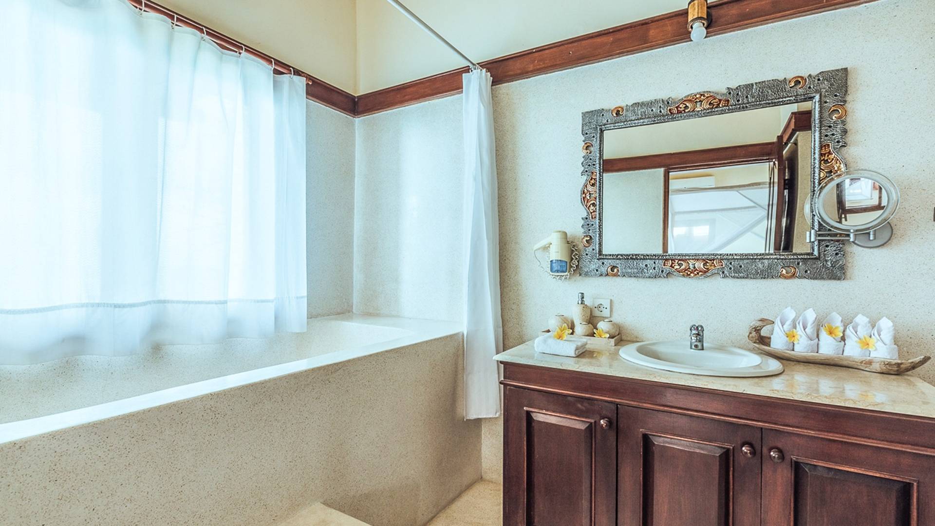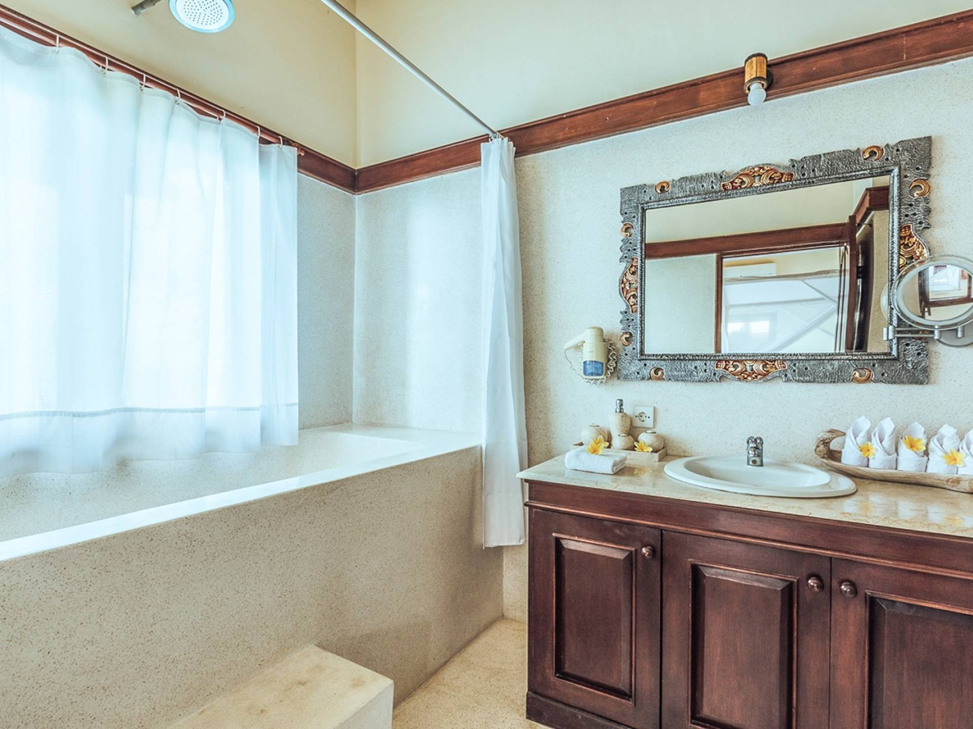 Village of Angels Resort Bali beach is located in a small bay with snow-white sand, surrounded by coconut palms. The water in the ocean is clean, overflowed with all shades of turquoise. Small waves and sandy bottom create ideal conditions for swimming, snorkeling and relaxing with children.